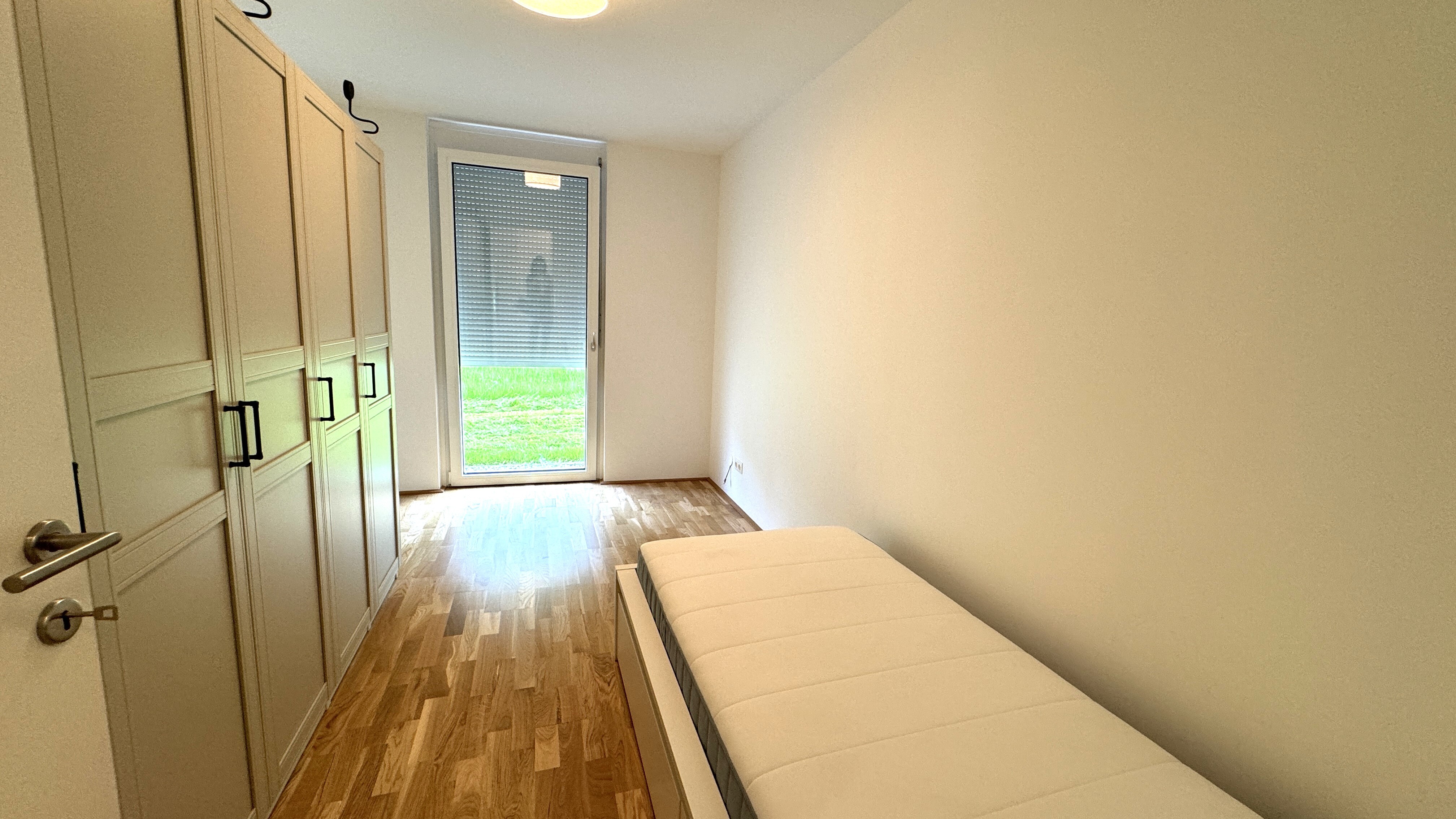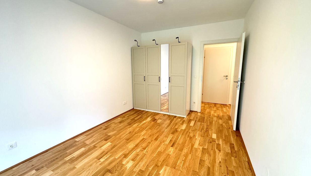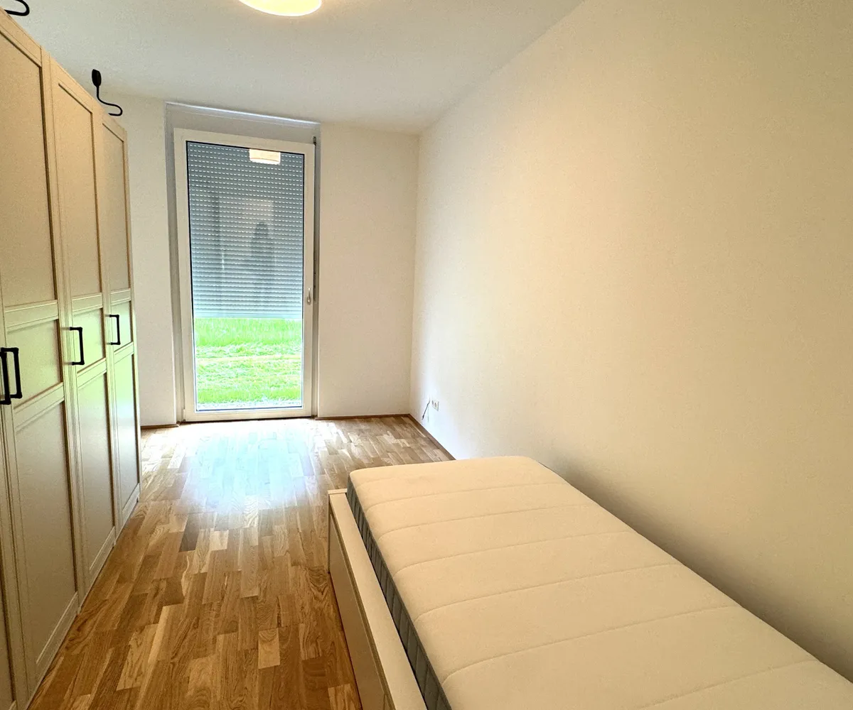 Die 3 Zimmerwohnung ist westseitig in Richtung eines wunderschönen Grüngürtels ausgerichtet und somit absolut ruhig gelegen. Sowohl von der Wohnküche, als auch von den beiden Schlafzimmern aus, gelangen Sie direkt in den Eigengarten, der weiters über eine teilweise überdachte Terrasse verfügt.