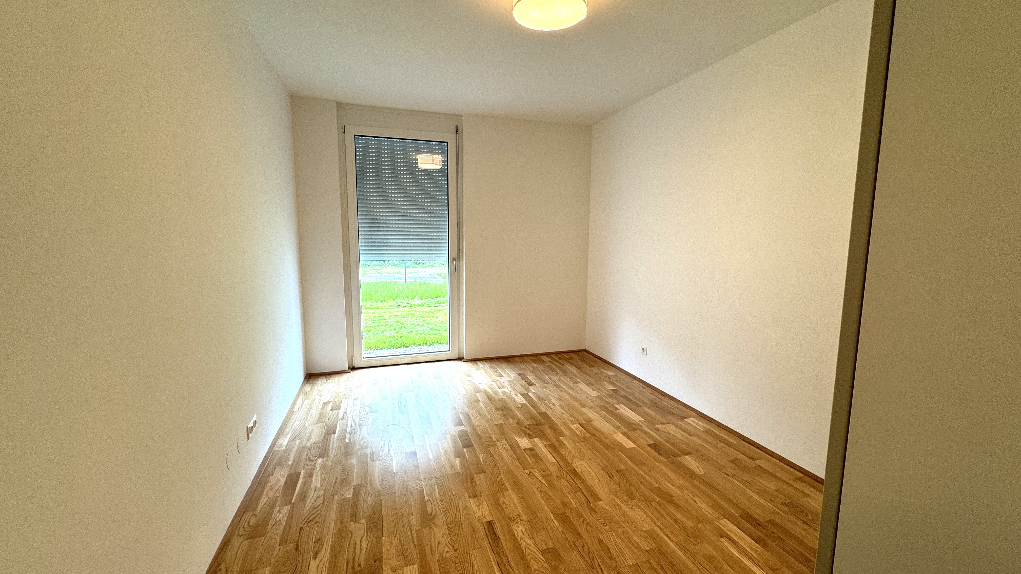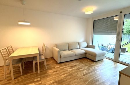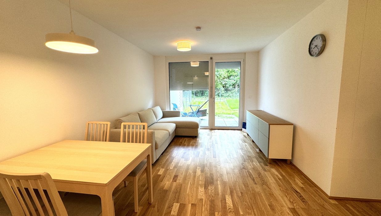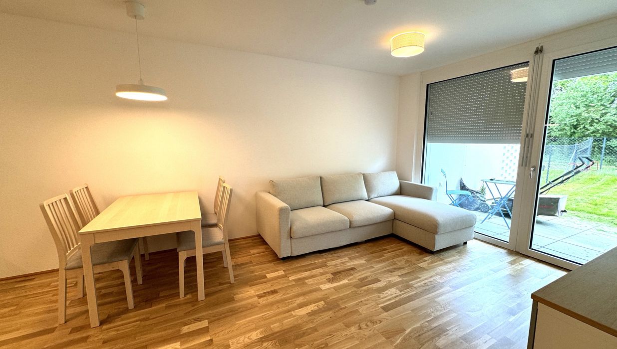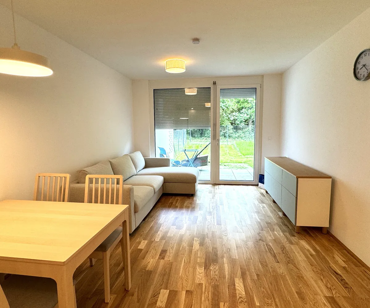 Die 3 Zimmerwohnung ist westseitig in Richtung eines wunderschönen Grüngürtels ausgerichtet und somit absolut ruhig gelegen. Sowohl von der Wohnküche, als auch von den beiden Schlafzimmern aus, gelangt man direkt in den Eigengarten, der weiters über eine teilweise überdachte Terrasse verfügt.