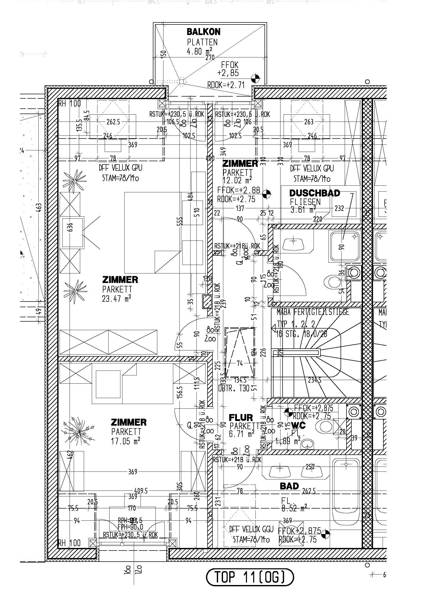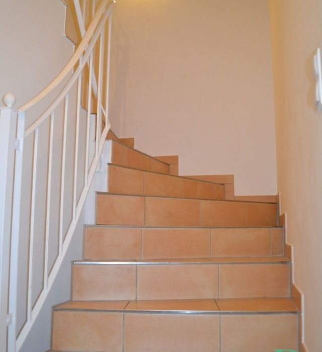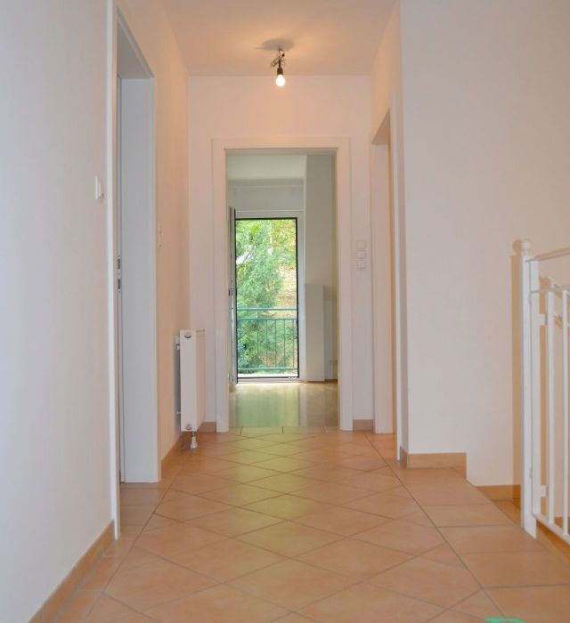 Der Stiegenaufgang führt in das Obergeschoss in dem sich 2 Zimmer, eines davon mit begehbarer Garderobe, mit Ausgang auf den ca. 5m² großen Balkon befinden sowie ein weiteres Zimmer, ein Duschbad und ein großes Bad mit Wanne, Doppelwaschtisch, Waschmaschinenanschluß und ein separates WC.