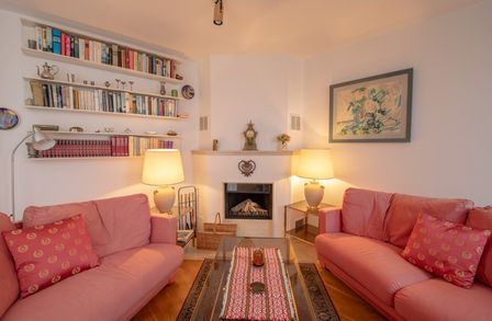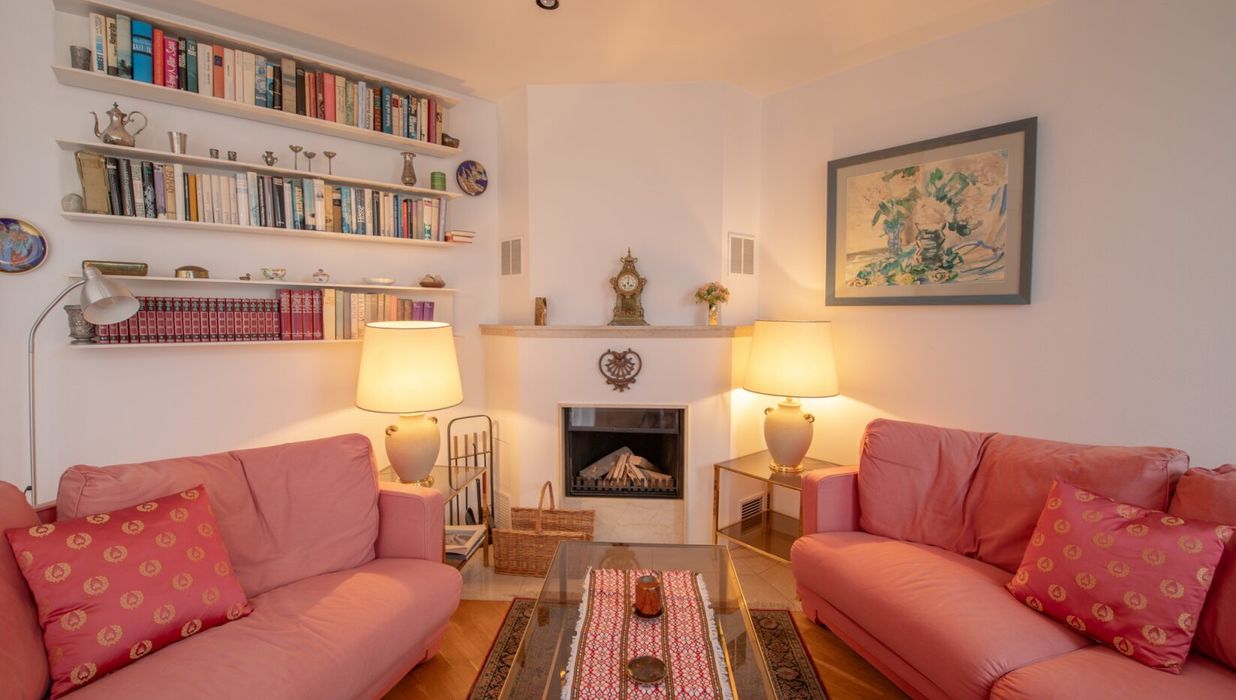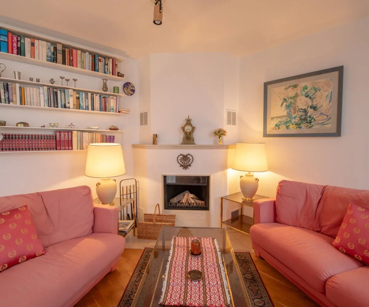 Ein besonderer Blickfang ist der offene Kaminofen, der an kühleren Tagen eine gemütliche, warme Atmosphäre zaubert.