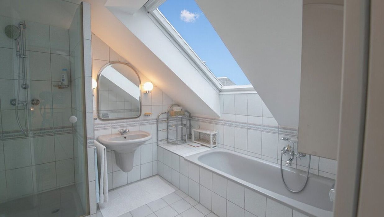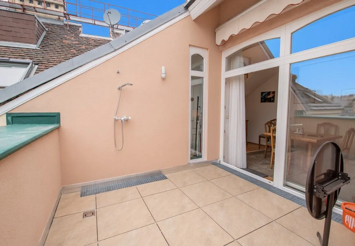 Für zusätzliche Lebensqualität sorgt die Dachterrasse, die einen traumhaften Ausblick über die umliegenden Dachlandschaften ermöglicht. Hier lassen sich entspannte Stunden im Freien genießen. Ein besonderes Highlight ist die Außendusche, die an warmen Sommertagen für erfrischende Momente sorgt und den Außenbereich zu einer kleinen privaten Wohlfühloase macht. Die Wohnung bietet zudem praktische Extras wie ein eigenes Kellerabteil sowie einen Garagenstellplatz, die den Wohnkomfort perfekt abrunden und den Alltag spürbar erleichtern.