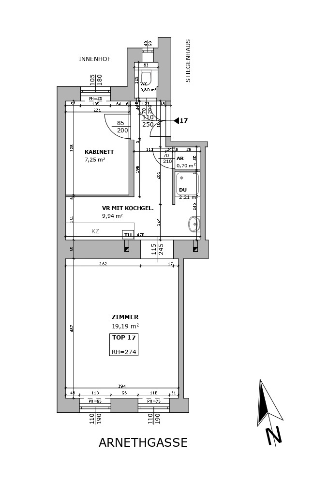 Die Wohnung gliedert sich in einen Vorraum , der zugleich Platz für eine Küchennische sowie einen Bereich für die Dusche bietet. Von hier aus gelangen Sie in das Wohnzimmer , das mit einem entspannten Ausblick und modernen Fenstern mit Doppelverglasung überzeugt. Ein separates Schlafzimmer sorgt für eine angenehme Rückzugsmöglichkeit und bietet hier eine Ausrichtung in den Innenhof.