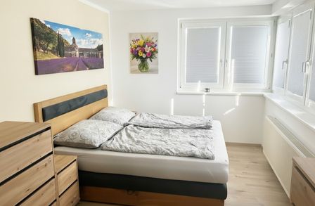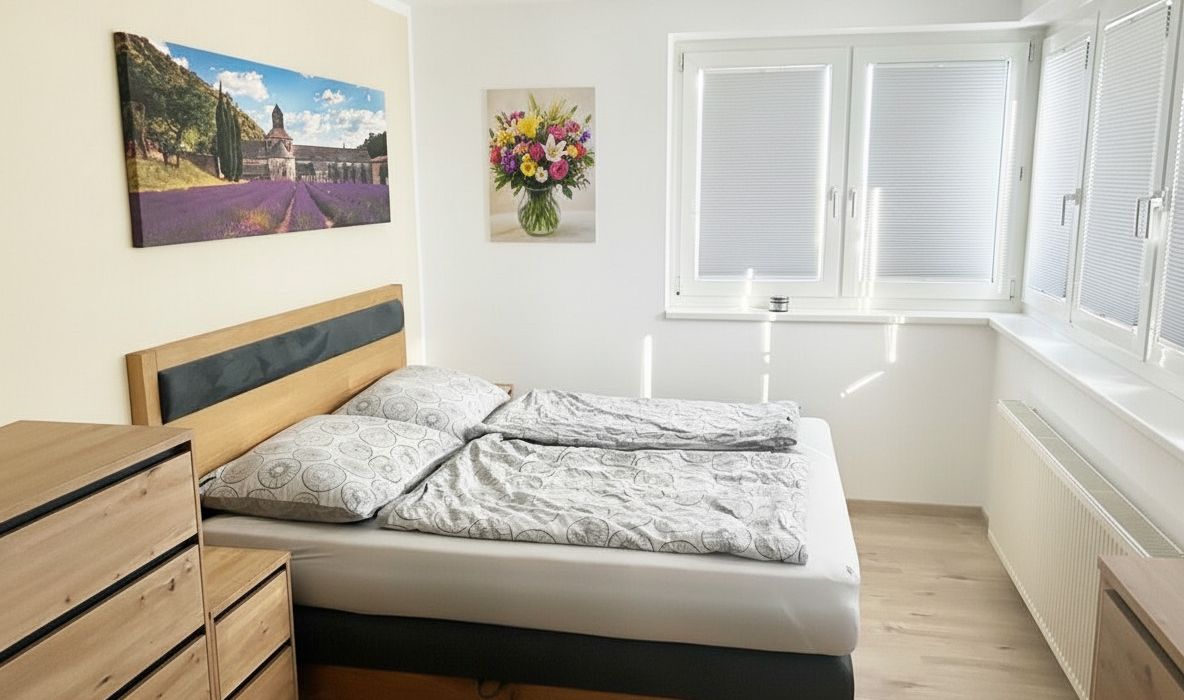 Das Schlafzimmer bietet einen ruhigen Rückzugsort in der Wohnung und ist gut abgetrennt vom Wohnzimmer untergebracht. Ergänzt wird die Wohnung durch ein modern renoviertes Badezimmer mit Dusche und Waschmaschinenanschluss, ein separates WC sowie einen praktischen Vorraum.