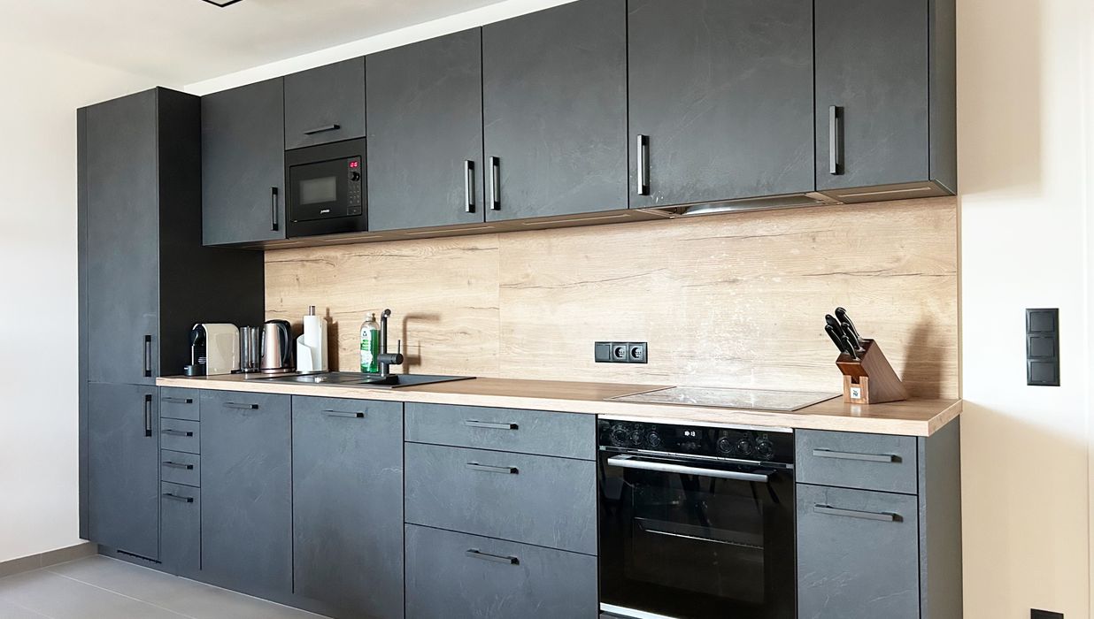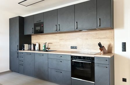 Das Herzstück bildet der großzügige und helle Wohnraum mit moderner Einbauküche und allen Geräten. Hier entstehen nicht nur kulinarische Momente, sondern auch ein zentraler Treffpunkt für Alltag und Entspannung. Große Fenster sorgen für viel Tageslicht und unterstreichen das helle, offene Wohngefühl.