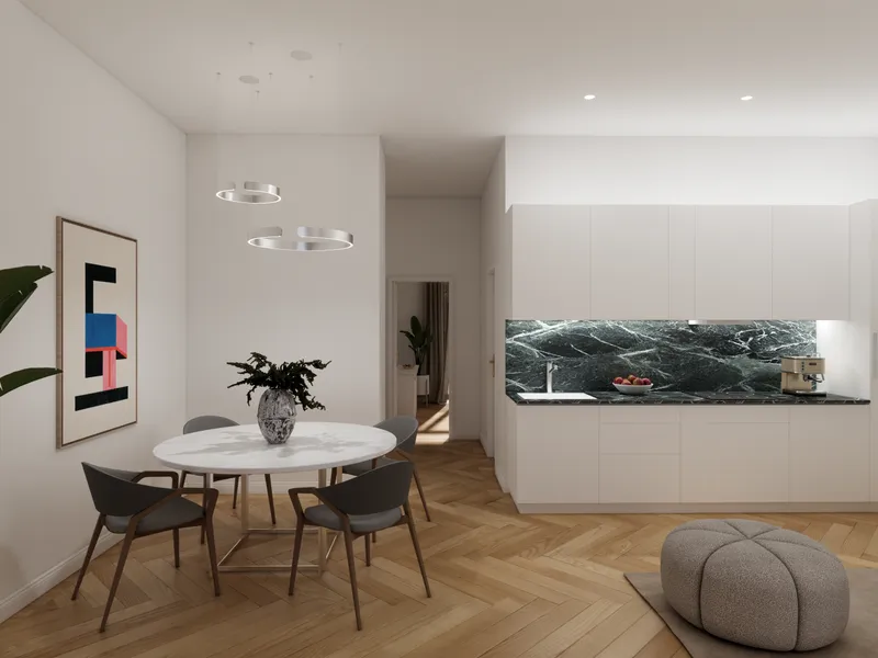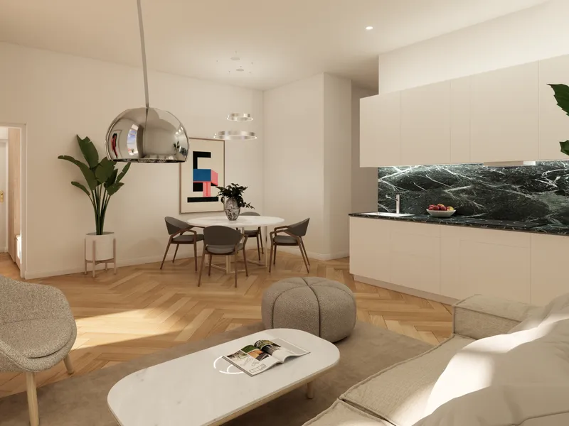 Jede Wohnung wird mit einer neuen, modernen Küche ausgestattet. Bei den derzeitigen Bildern handelt es sich um Visualisierungen, da die Küchen erst im April fertiggestellt werden.