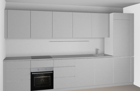Jede Wohnung wird mit einer neuen, modernen Küche ausgestattet. Die derzeit gezeigten Bilder sind Visualisierungen und KI-generiert.