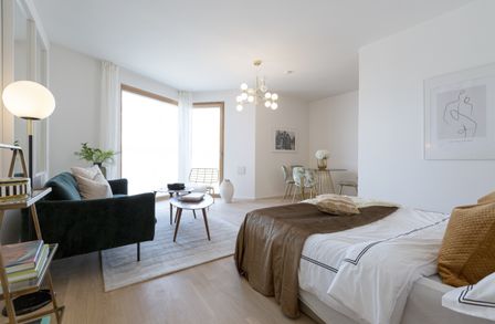 Die Wohnung selbst befindet sich in der 12. Etage und unterteilt sich in eine großzügige Wohnküche mit Schlafbereich und Zugang zum Balkon, ein anschließendes Badezimmer mit Dusche, ein separates WC, sowie einen Vorraum. Der Balkon lädt zum Verweilen im Freien ein.
