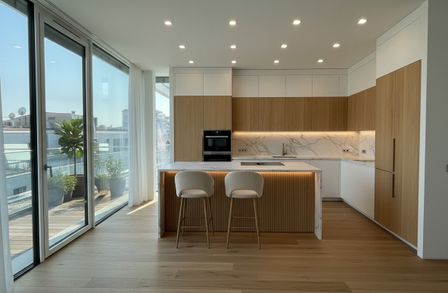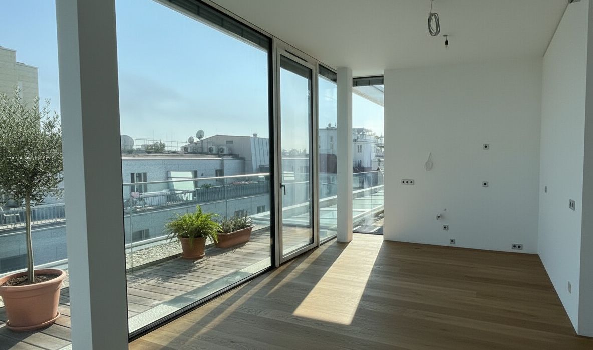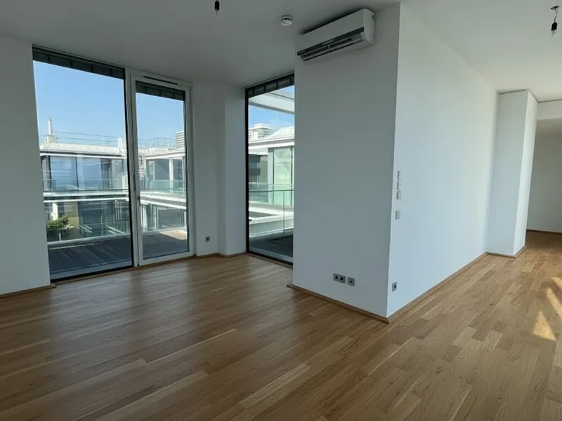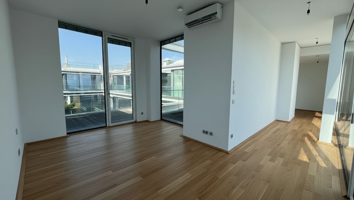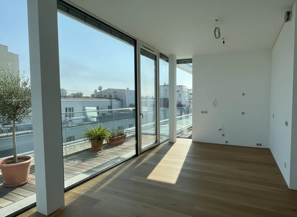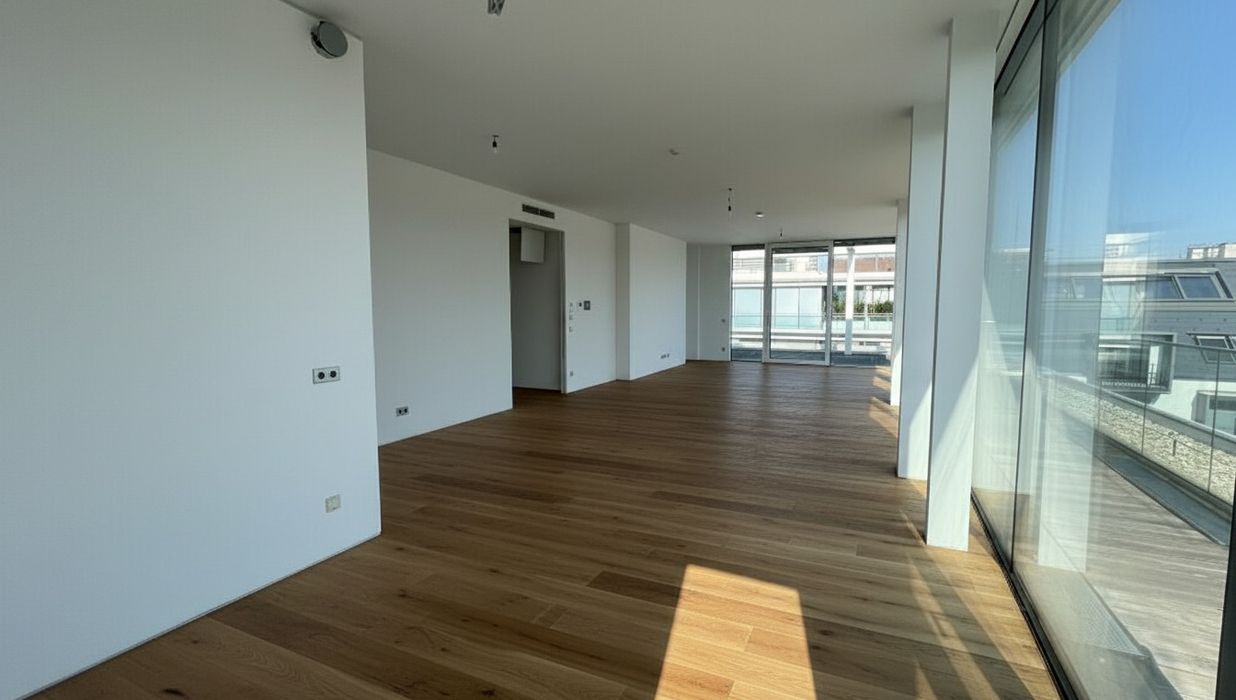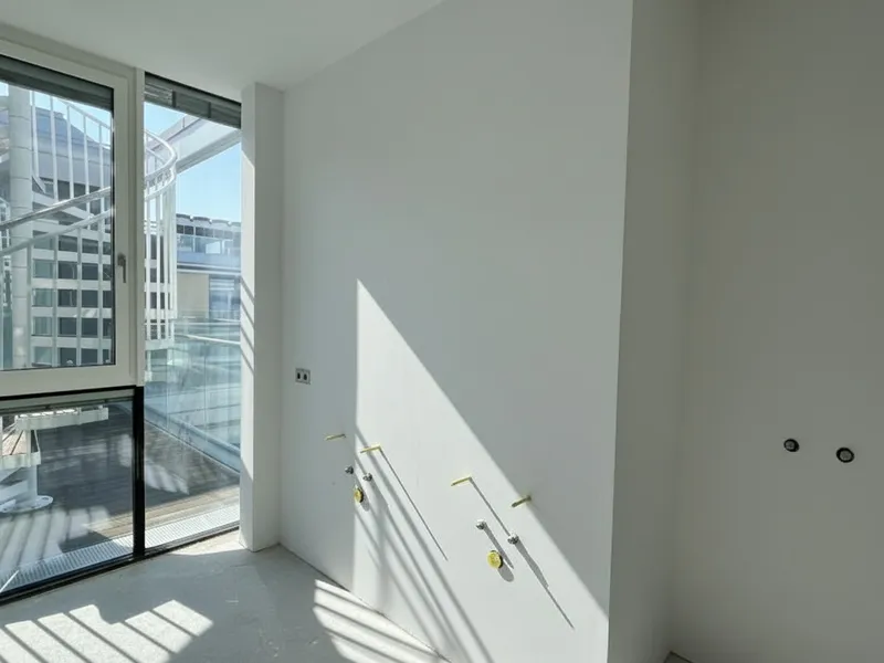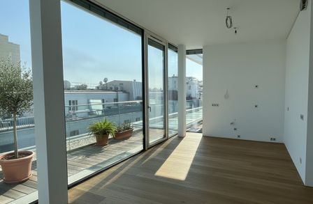 Mit ca. 185 m² Wohnfläche auf einer Ebene und rund 269 m² beeindruckender Freiflächen, darunter großzügige Terrassenflächen mit hochwertiger Holz- bzw. Thermoesche-Belag, eröffnet dieses Penthouse neue Perspektive. Die klare, offene Grundrissgestaltung, eine Raumhöhe von bis zu 3 Metern und die raumhohe 3-fach Panoramaverglasung sorgen für eine lichtdurchflutete Wohnatmosphäre mit faszinierenden Blickachsen, vom Kahlenberg bis zum Stephansdom.