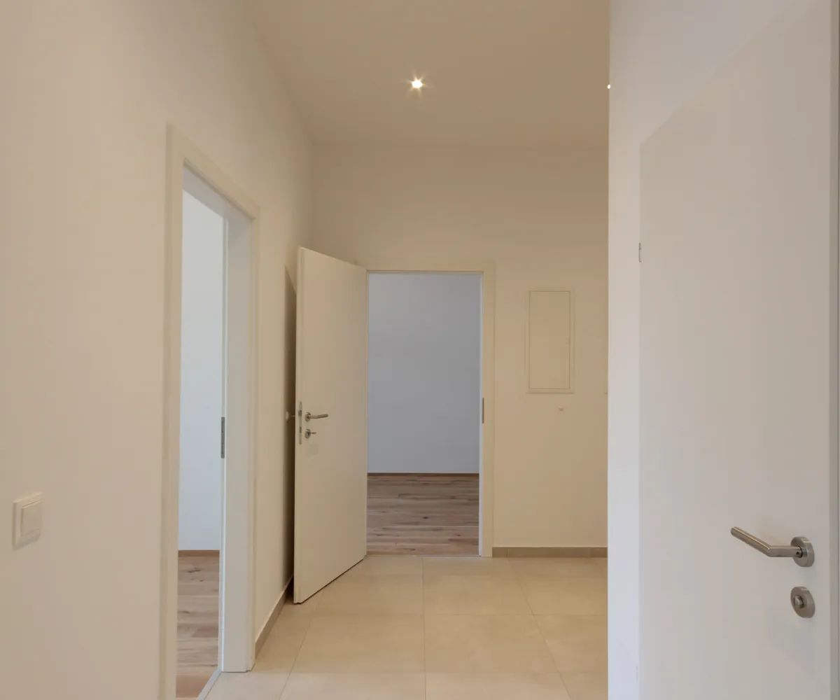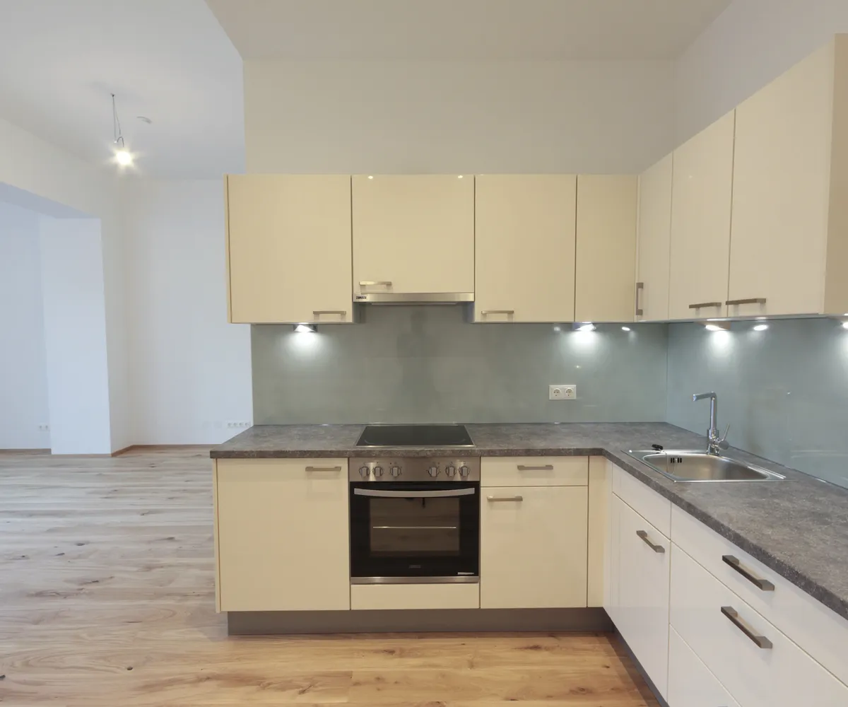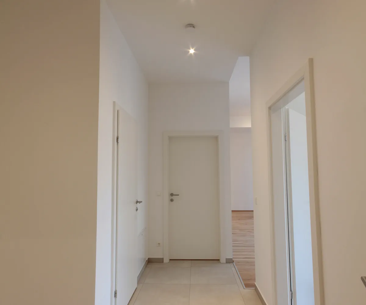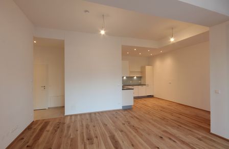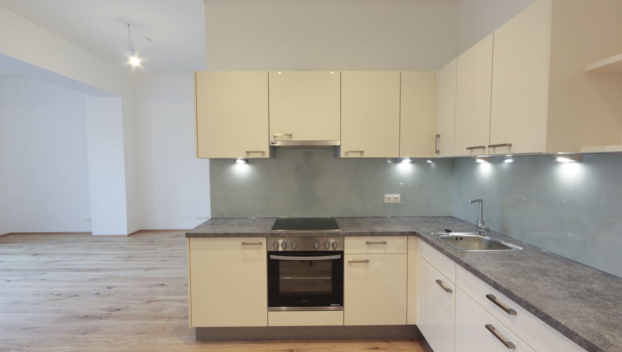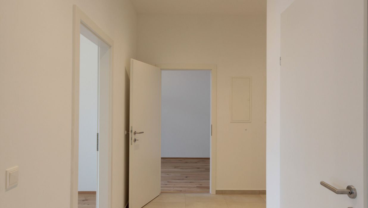 Sie betreten die Wohnung und befinden sich im Vorraum. Über diesen gelangen Sie in die lichtdurchflutete ca. 36 m² große Wohnküche. Diese kann räumlich ideal in einen Küchen- und einen Wohnbereich unterteilt werden und bietet ausreichend Platz für eine Couchlandschaft sowie einen großen Esstisch. Die Küche ist mit den modernsten und hochwertigsten Küchengeräten von der Marke Zanussi ausgestattet. Über die Wohnküche gelangen Sie auf den schönen Balkon. Die beiden Schlafzimmer sind gleich groß. Das Badezimmer ist mit einer Dusche, einem Waschbecken und einem Waschmaschinenanschluss ausgestattet. Die Gästetoilette befindet sich direkt neben dem Badezimmer.