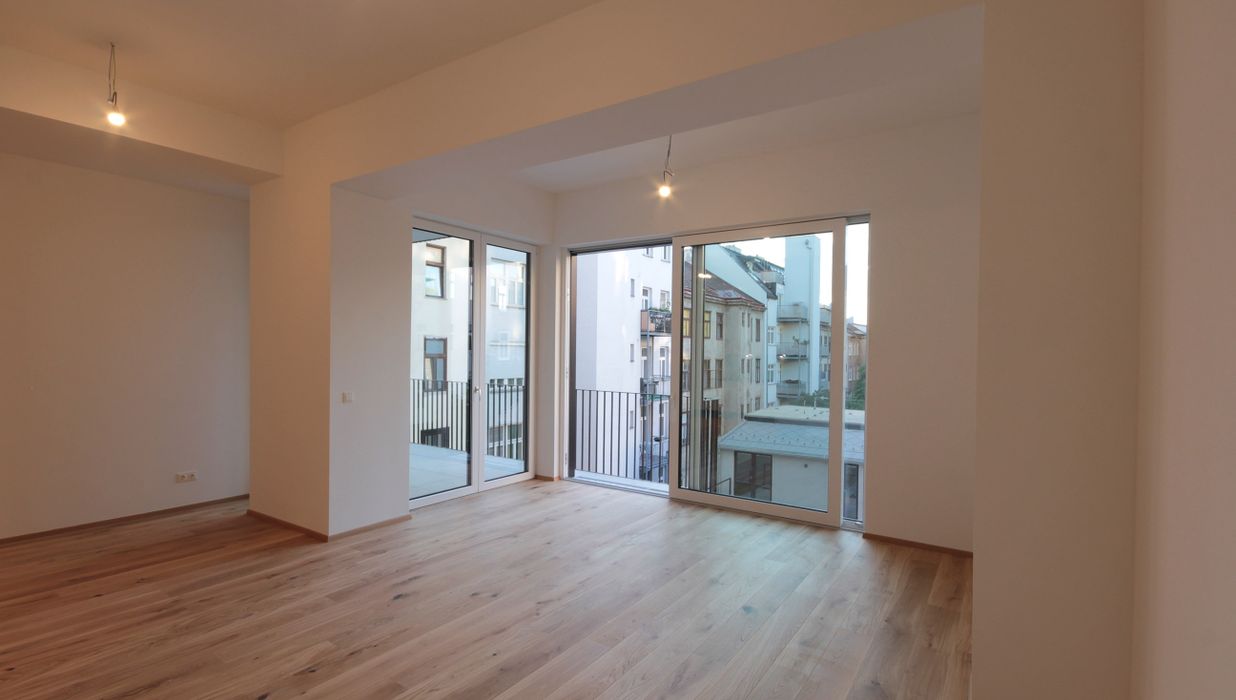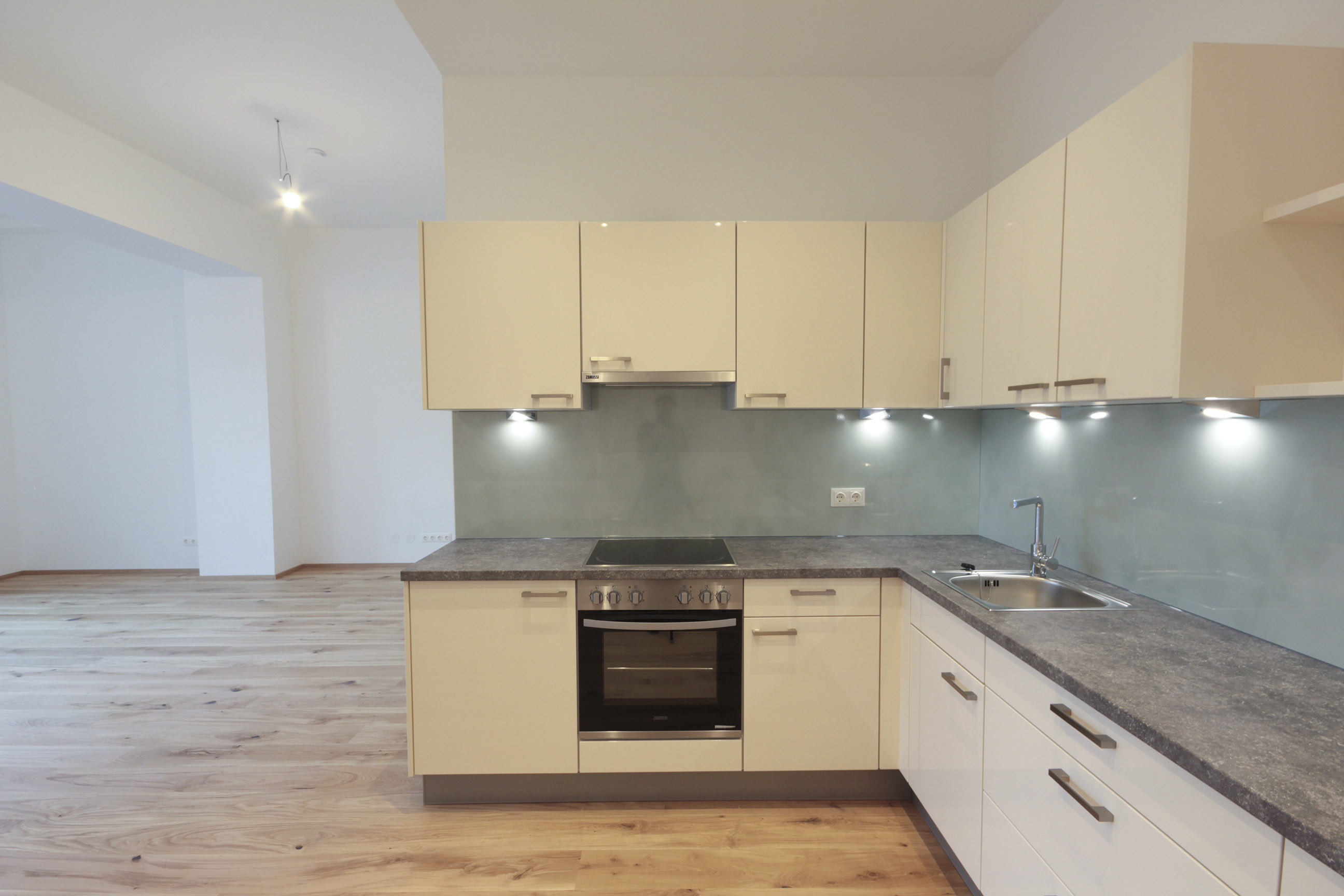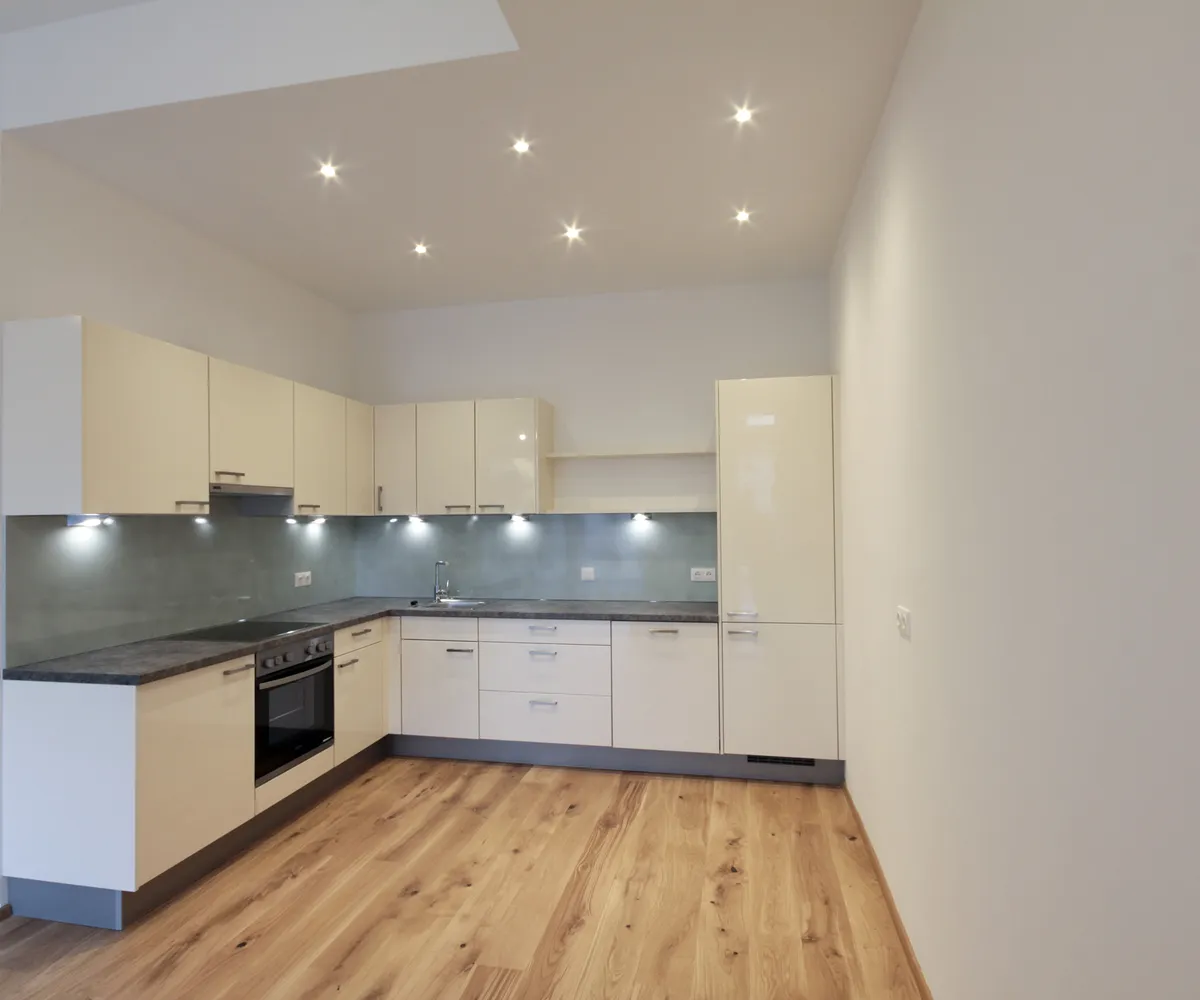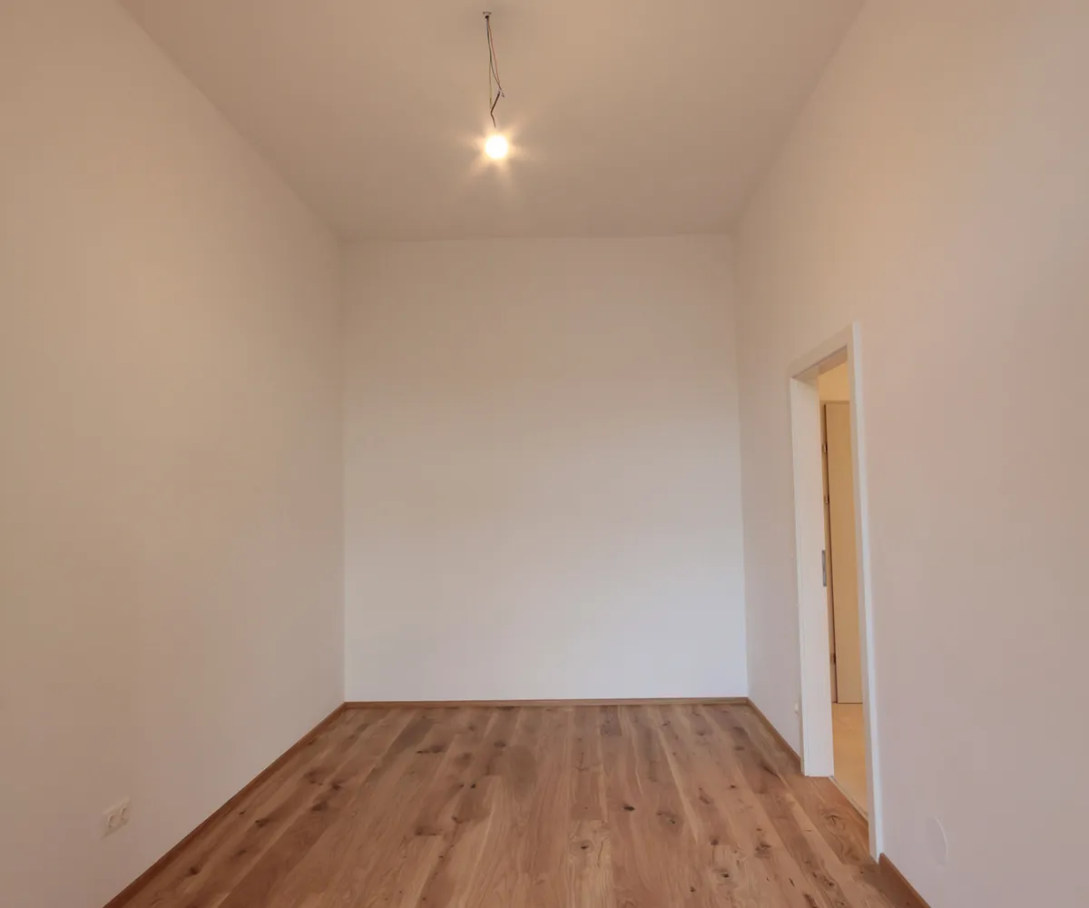 Sie betreten die Wohnung und befinden sich im Vorraum. Über diesen gelangen Sie in die lichtdurchflutete ca. 36 m² große Wohnküche. Diese kann räumlich ideal in einen Küchen- und einen Wohnbereich unterteilt werden und bietet ausreichend Platz für eine Couchlandschaft sowie einen großen Esstisch. Die Küche ist mit den modernsten und hochwertigsten Küchengeräten von der Marke Zanussi ausgestattet. Über die Wohnküche gelangen Sie auf den schönen Balkon. Die beiden Schlafzimmer sind gleich groß. Das Badezimmer ist mit einer Dusche, einem Waschbecken und einem Waschmaschinenanschluss ausgestattet. Die Gästetoilette befindet sich direkt neben dem Badezimmer.