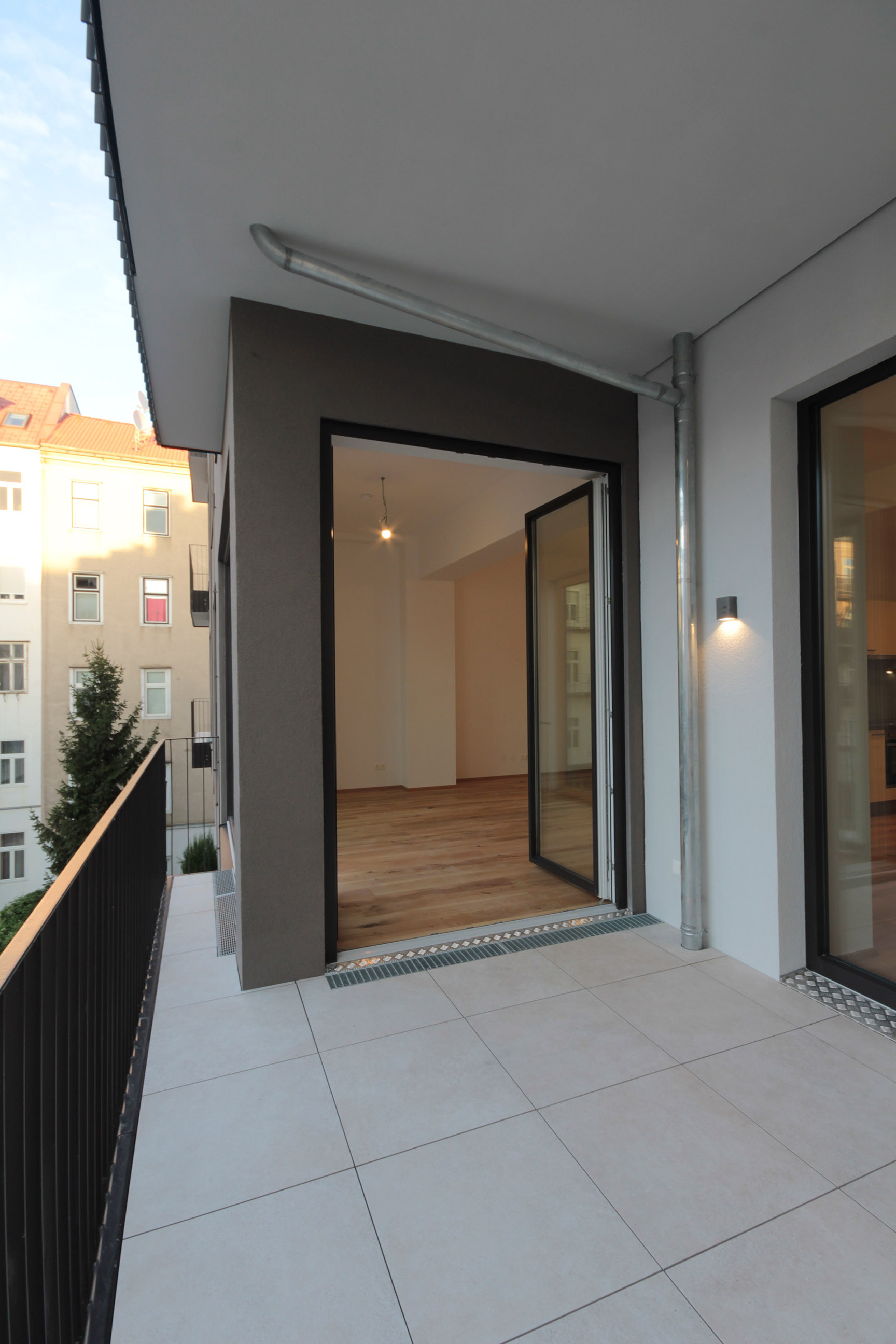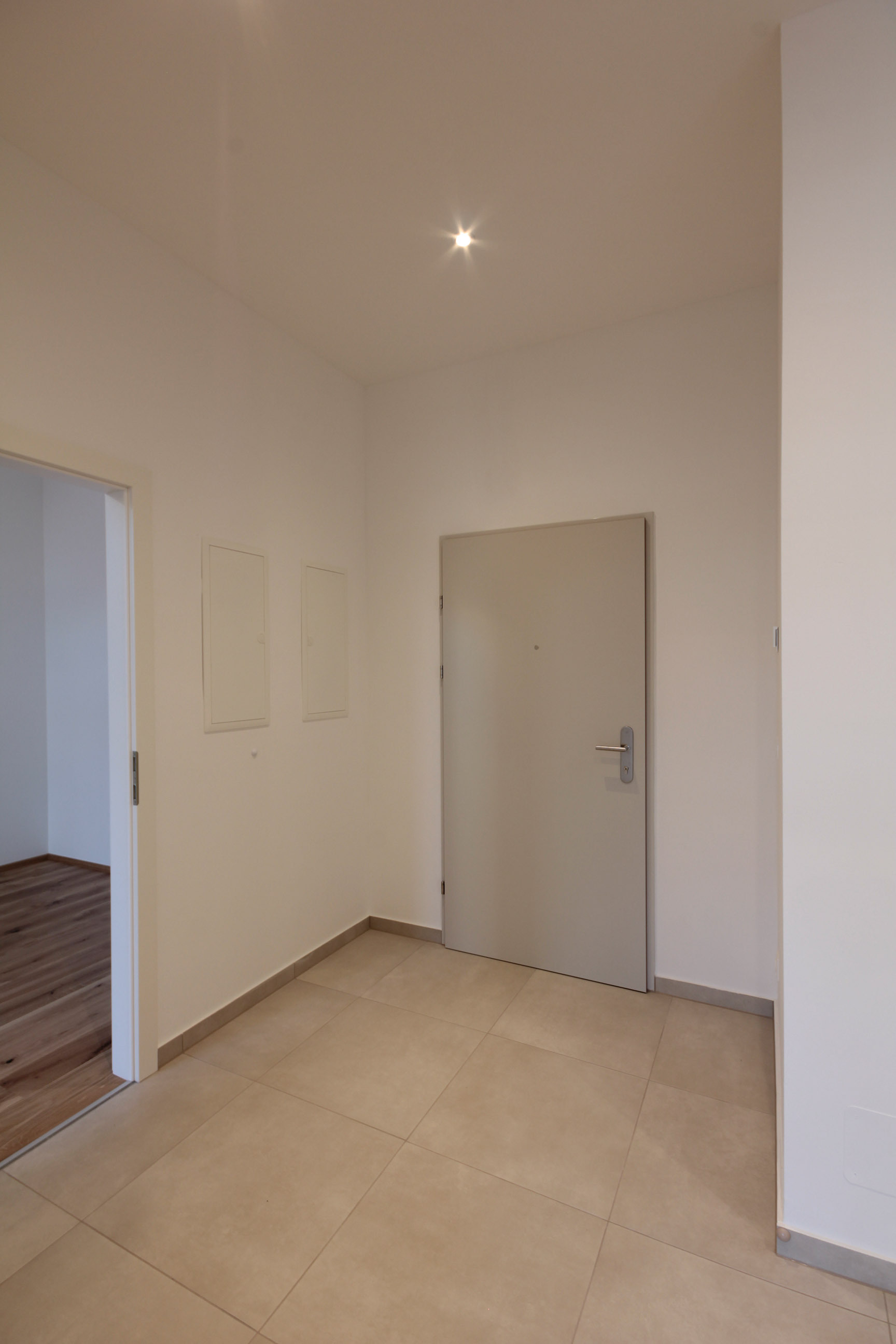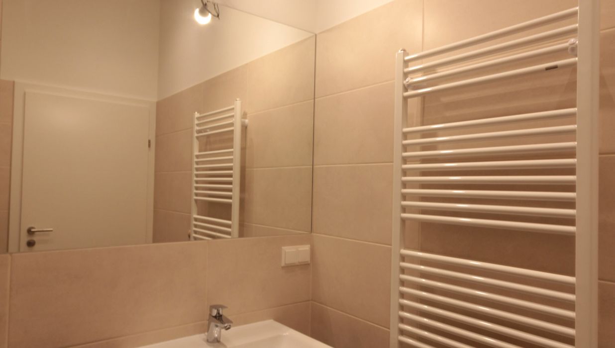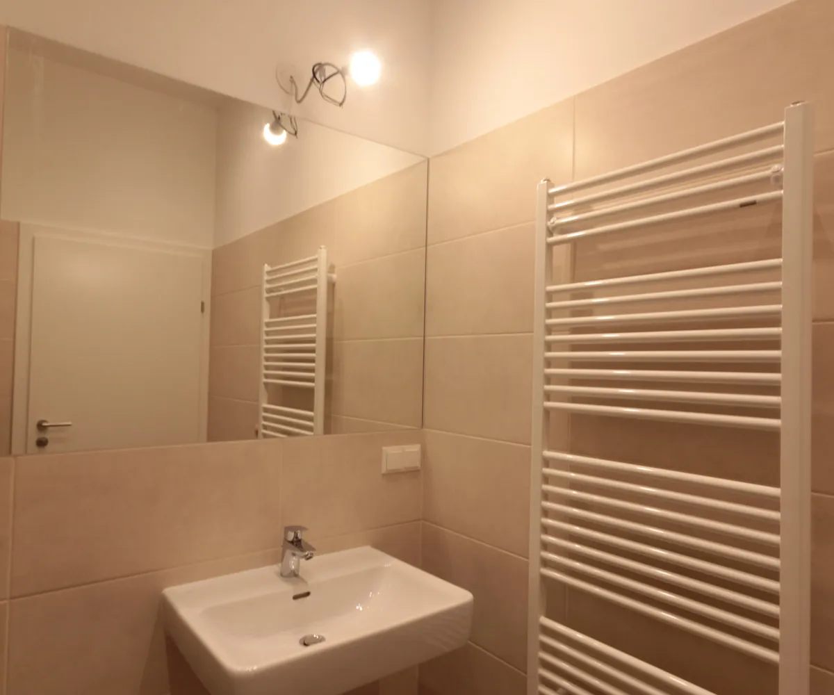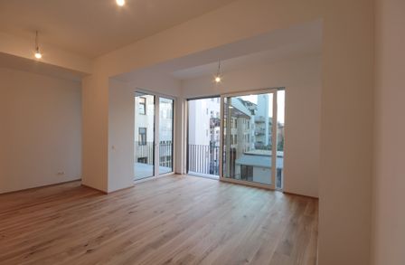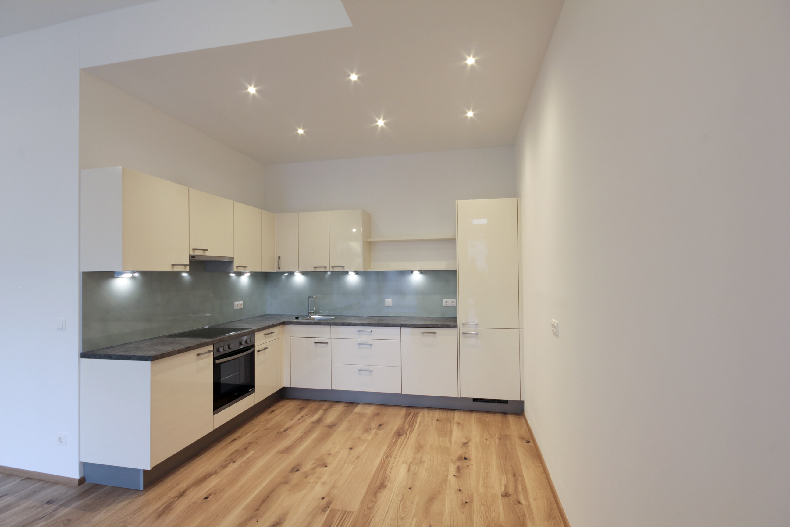 Sie betreten die Wohnung und befinden sich im Vorraum. Über diesen gelangen Sie in die lichtdurchflutete ca. 36 m² große Wohnküche. Diese kann räumlich ideal in einen Küchen- und einen Wohnbereich unterteilt werden und bietet ausreichend Platz für eine Couchlandschaft sowie einen großen Esstisch. Die Küche ist mit den modernsten und hochwertigsten Küchengeräten von der Marke Zanussi ausgestattet. Über die Wohnküche gelangen Sie auf den schönen Balkon. Die beiden Schlafzimmer sind gleich groß. Das Badezimmer ist mit einer Dusche, einem Waschbecken und einem Waschmaschinenanschluss ausgestattet. Die Gästetoilette befindet sich direkt neben dem Badezimmer.