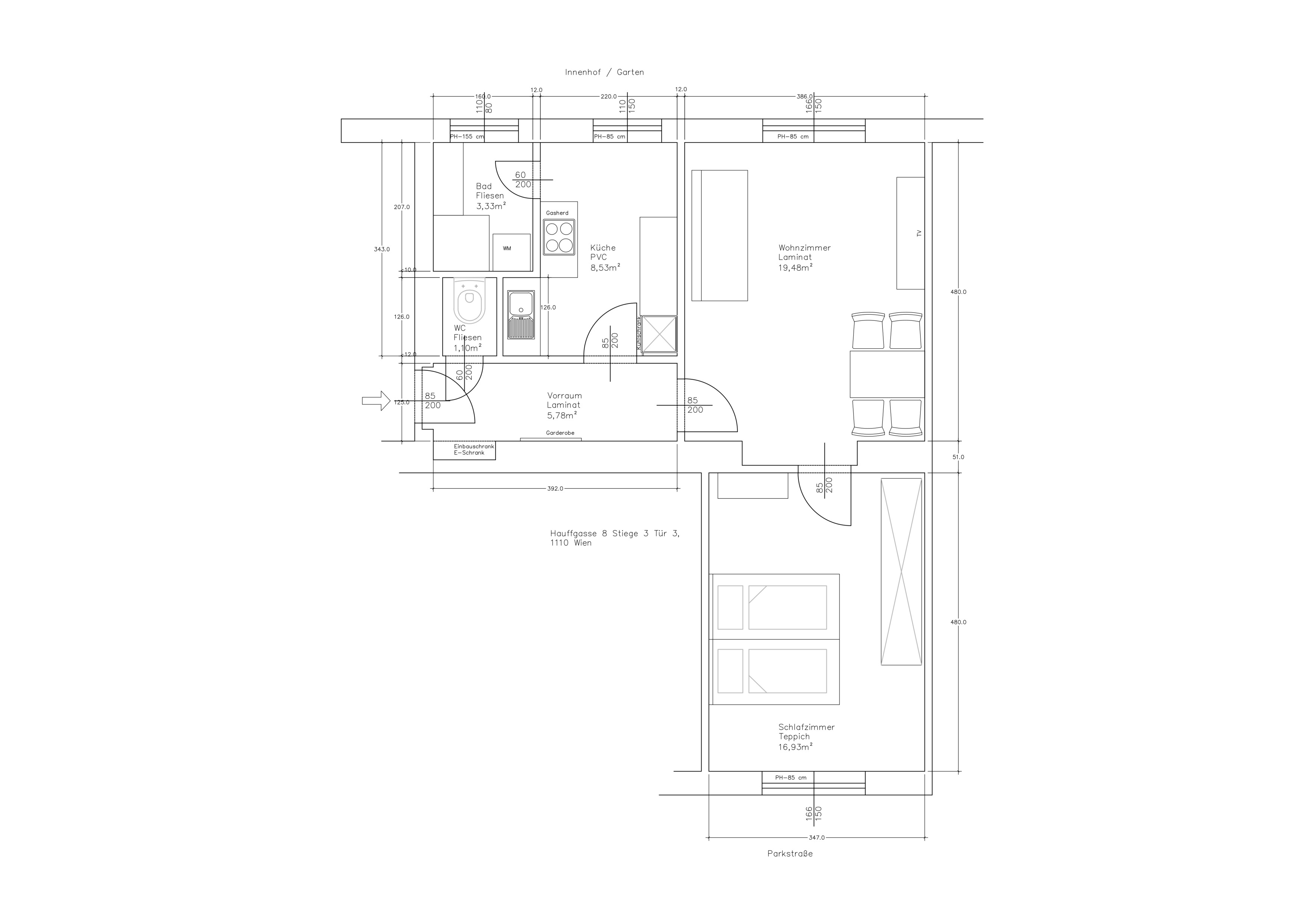 Die Wohnung wurde laufend renoviert und präsentiert sich in sehr gutem Zustand. Die Raumaufteilung ist klar und funktional: Küche separat, WC getrennt vom Badezimmer, Gasetagenheizung für individuelle Wärme, ein praktisches Kellerabteil für zusätzlichen Stauraum. Teilmöbliert übergeben, kann sie sofort bezogen oder vermietet werden.