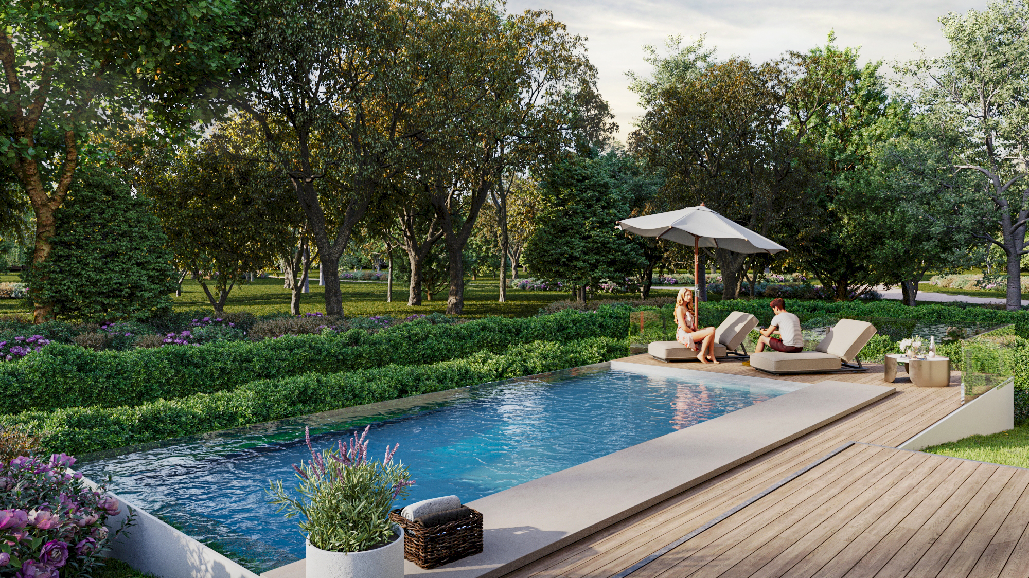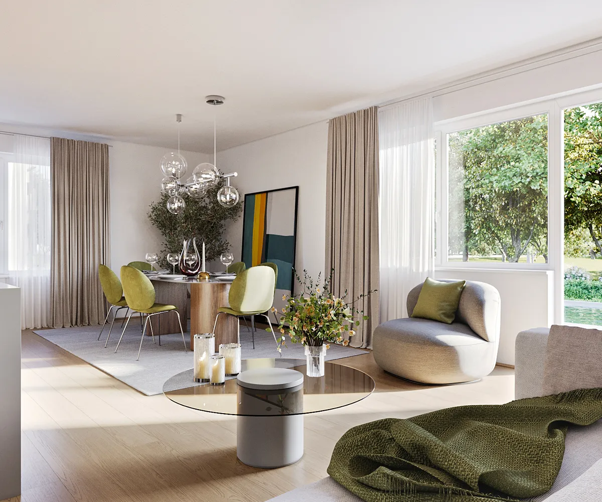 Alle Einheiten verfügen über traumhafte Freiflächen – von einladenden Balkonen über idyllische Gärten bis hin zu exklusiven Dachterrassen mit beeindruckendem Grünblick – die eine harmonische Verbindung zwischen Innen- und Außenraum schaffen.