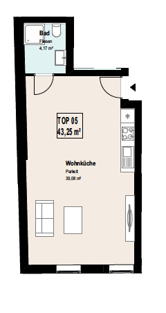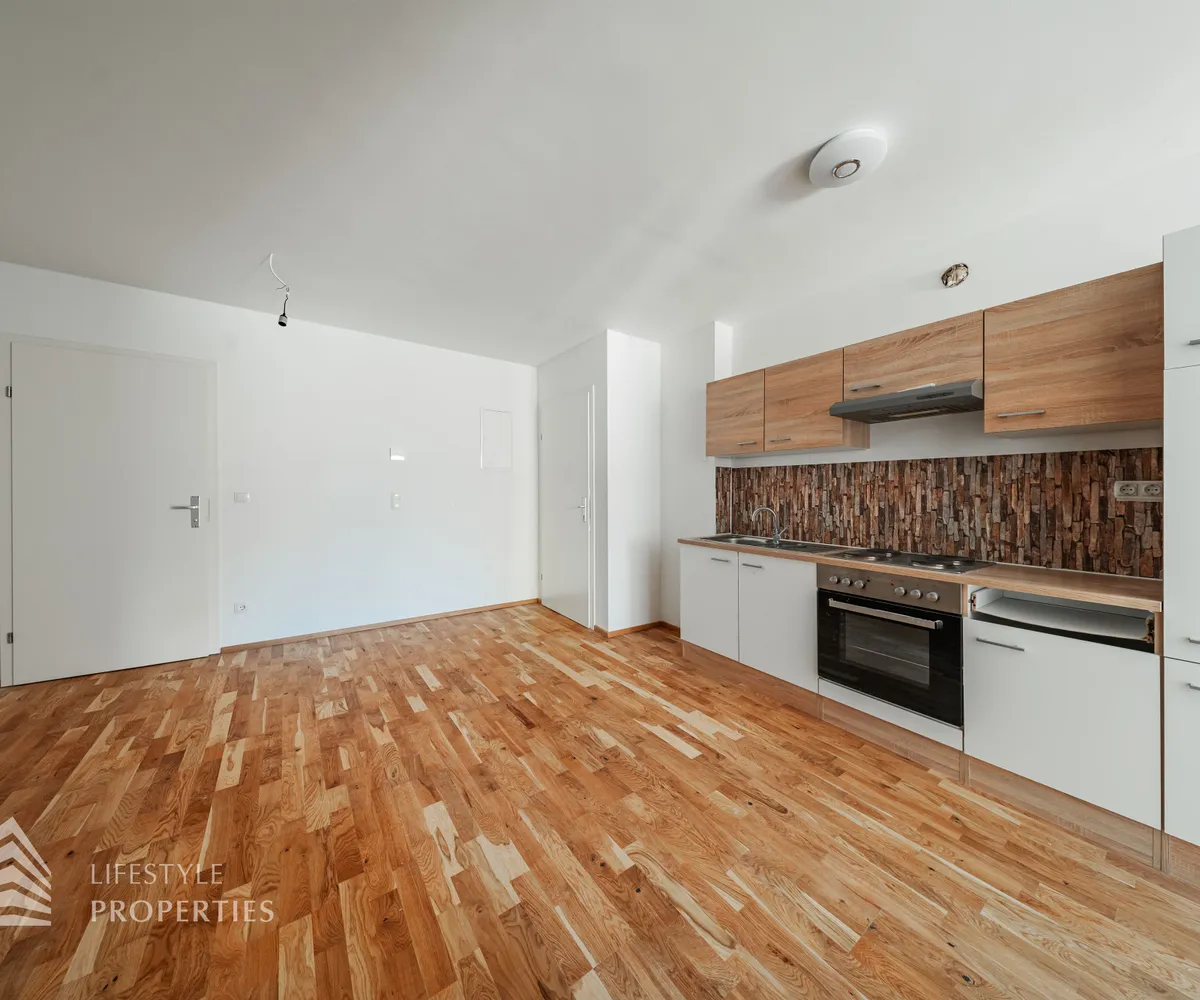 Beim Betreten der Wohnung gelangen Sie in die Wohnküche. Von hier erreichen Sie das Schlafzimmer und das Badezimmer mit WC. Die Wohnung verfügt über eine Wohnfläche von ca. 43 m² und überzeugt durch eine durchdachte Raumaufteilung. Ein weiterer Pluspunkt dieser Wohnung ist die hochwertige Ausstattung: Eine moderne Küche ist bereits im Kaufpreis inkludiert.
