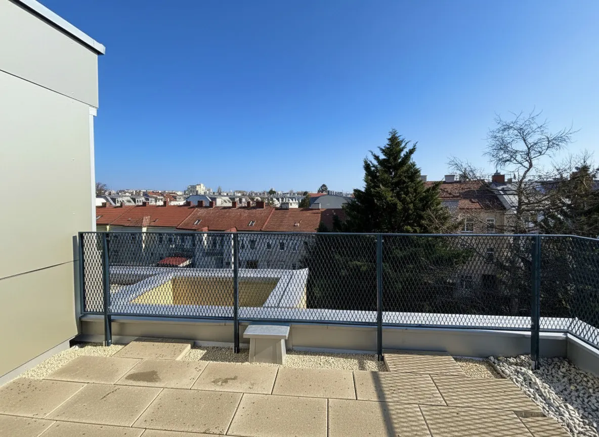 TOP 14 | 53 m² | 2 Zimmer | 24 m² Terrassen: eine Terrasse in den ruhigen Innenhof und die zweite Terrasse mit direktem Blick auf den Kahlenberg