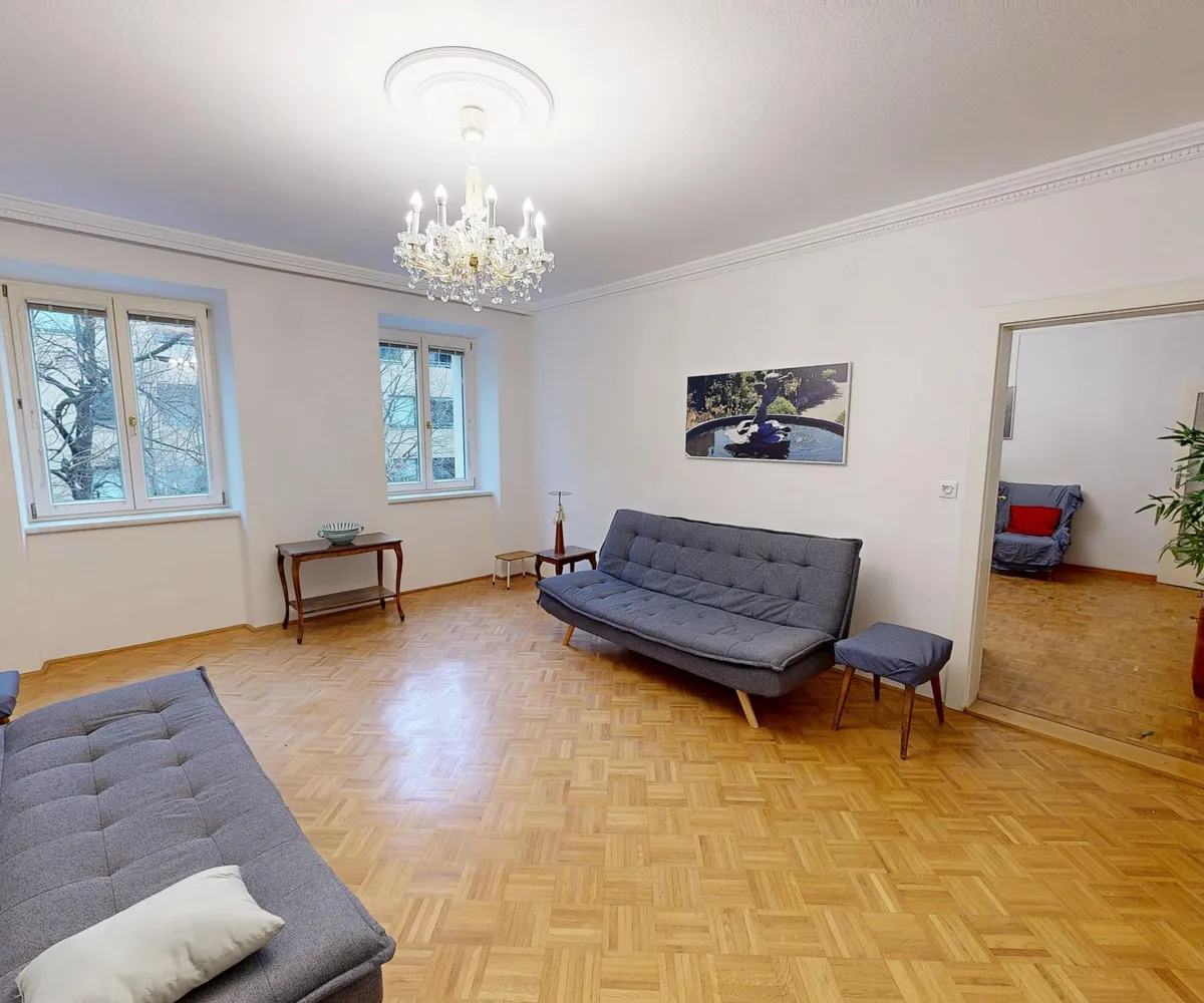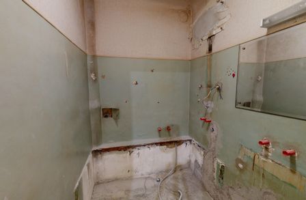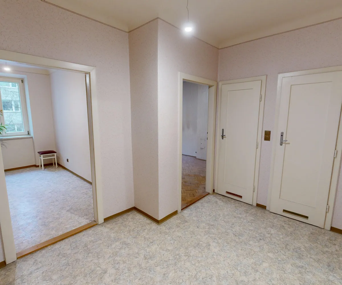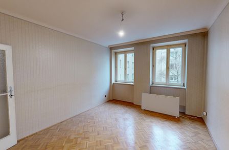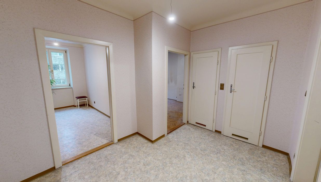 Die Wohnung verfügt über insgesamt 2 Zimmer, ein ehemaliges Bad sowie ein WC. Ein zusätzliches Zimmer war ursprünglich als Küche vorgesehen und verfügt noch über verdeckte Küchenanschlüsse, was zusätzliche Flexibilität in der Grundrissgestaltung ermöglicht. Das ehemalige Badezimmer ist sanierungsbedürftig und bietet Raum für individuelle Anpassungen. Ergänzt wird das Raumangebot durch zwei Kellerabteile.