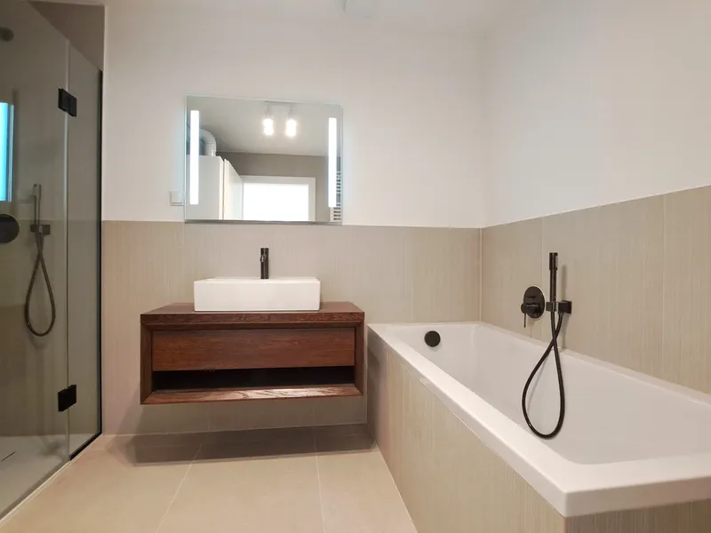 * Badezimmer mit Badewanne, Dusche und Waschmaschinenanschluss