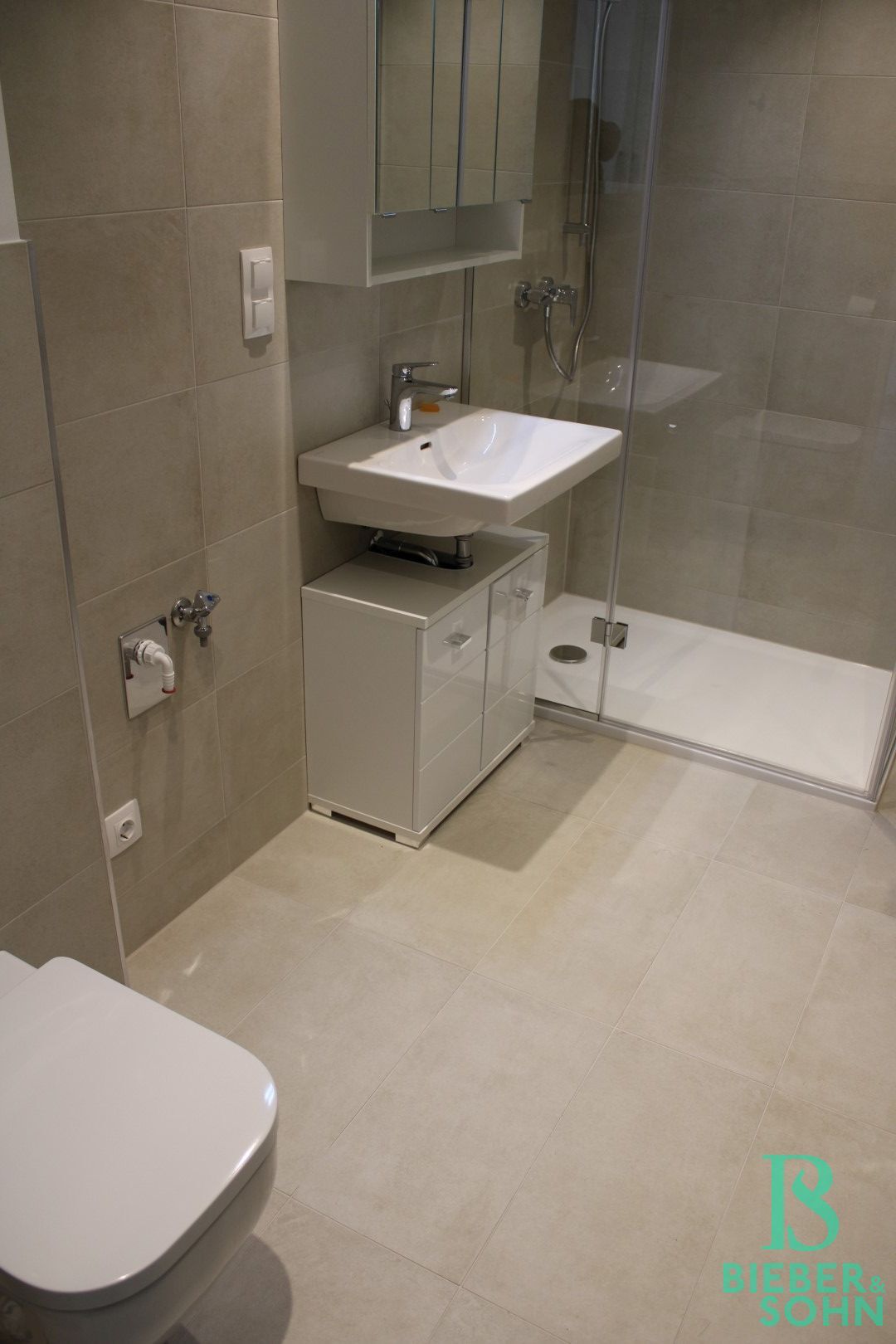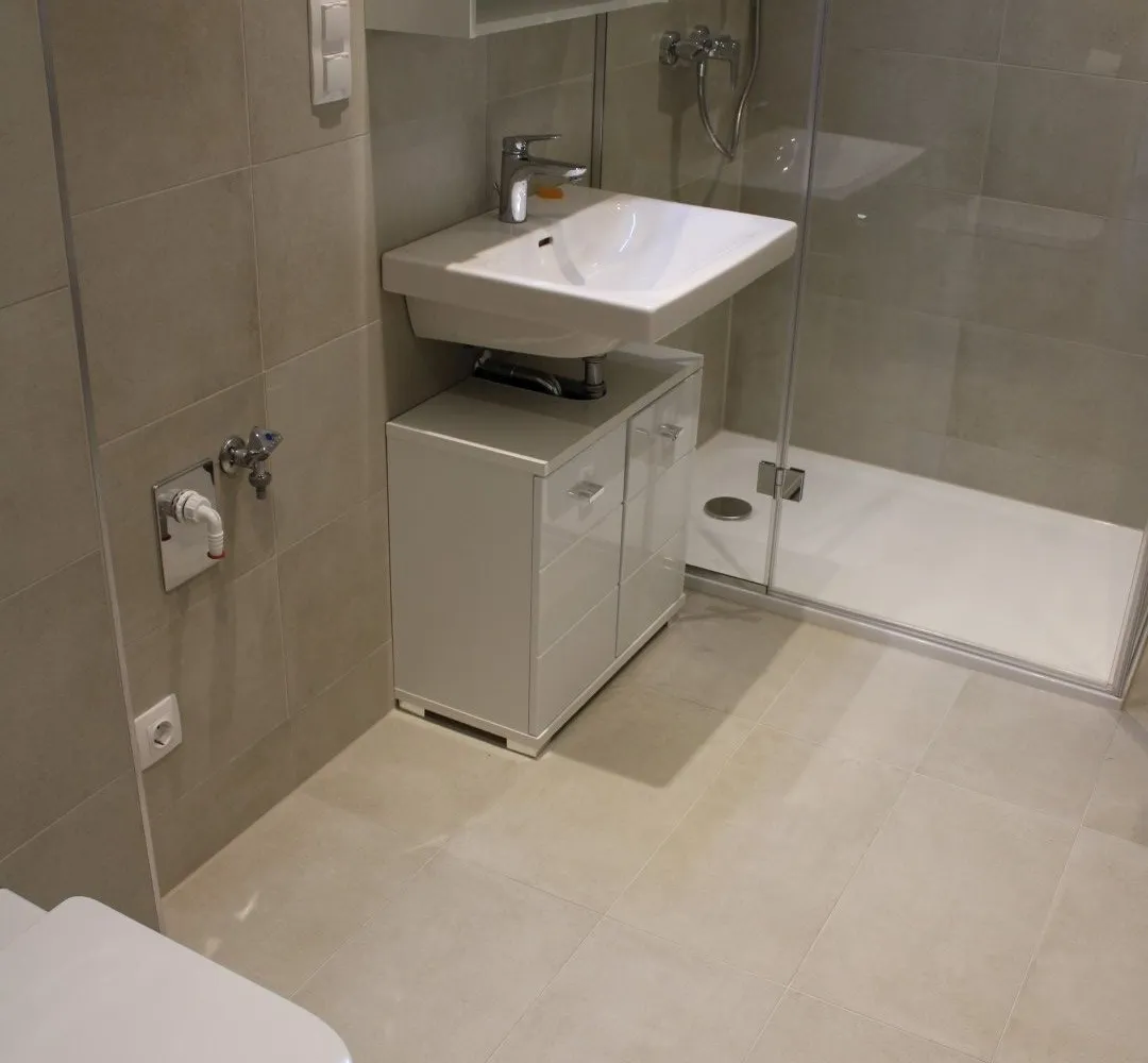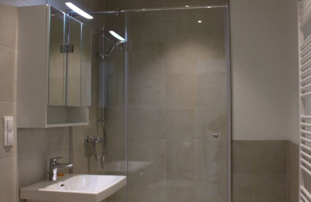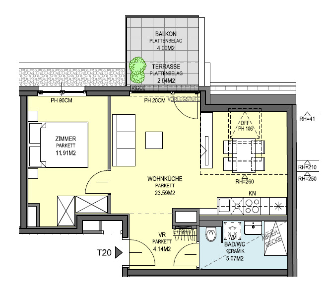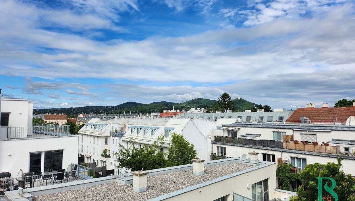 Über einen großzügigen Eingangsbereich mit Platz für eine kleine Garderobe und einem anschließenden eleganten Bad mit Dusche, WC und Waschmaschinenanschluss, gelangt man in den wunderschönen und hellen, ca. 24 m² großen Wohnbereich von dem aus die sonnige, ca. 6 m² große Süd-West Terrasse, mit traumhaftem Ausblick auf den Kahlenberg, die offen gehaltene Dieter Knoll Küche samt Geräten und ein weiteres großes Zimmer zu erreichen sind.