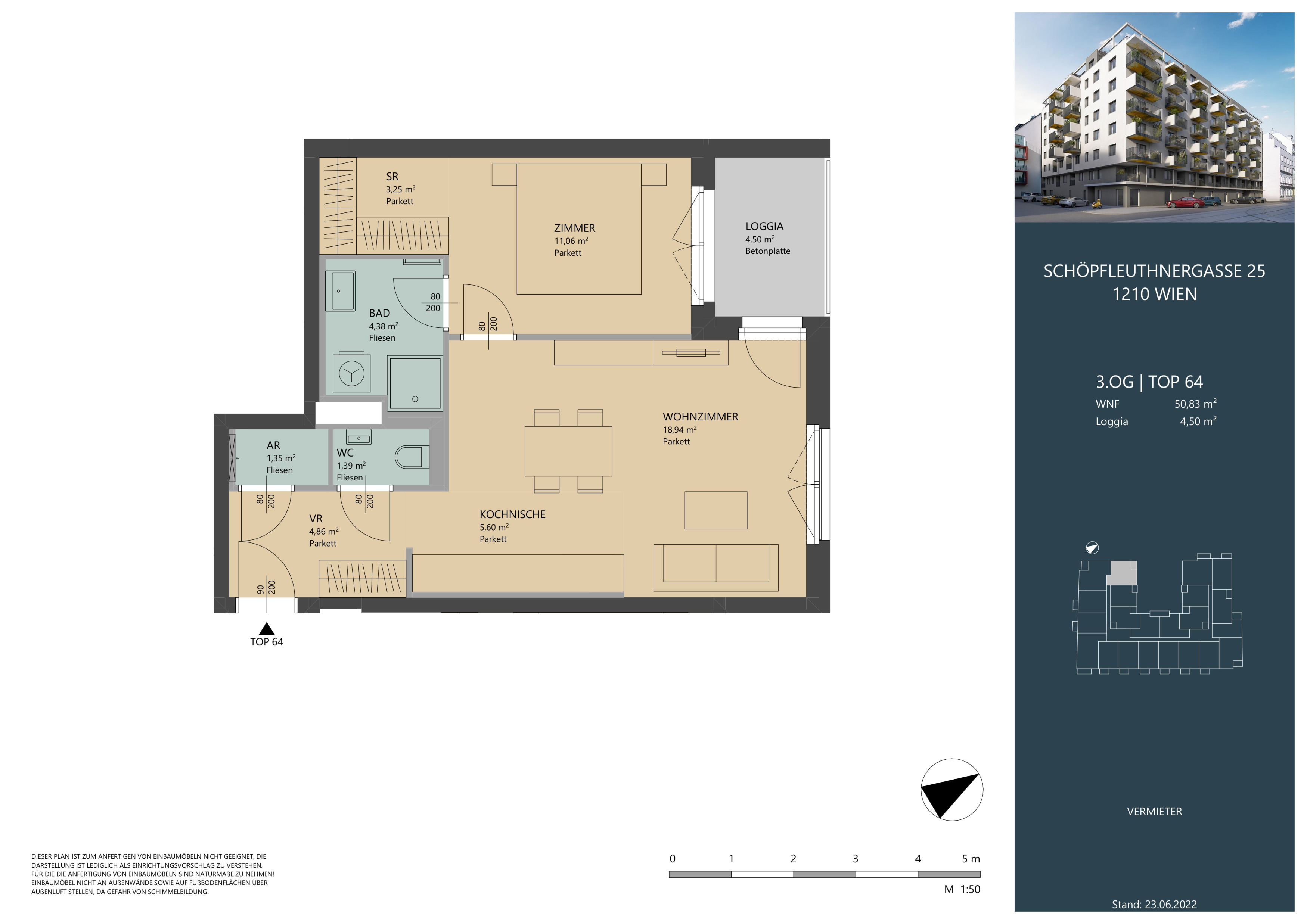 Die Wohnung befindet sich im 3.Obergeschoss und verfügt über eine großzügige Wohnküche mit vollausgestatteter Einbauküche, ein Schlafzimmer, ein Badezimmer mit Dusche und Waschmaschinenanschluss, eine separate Toilette, sowie einen Abstellraum und einen Vorraum.