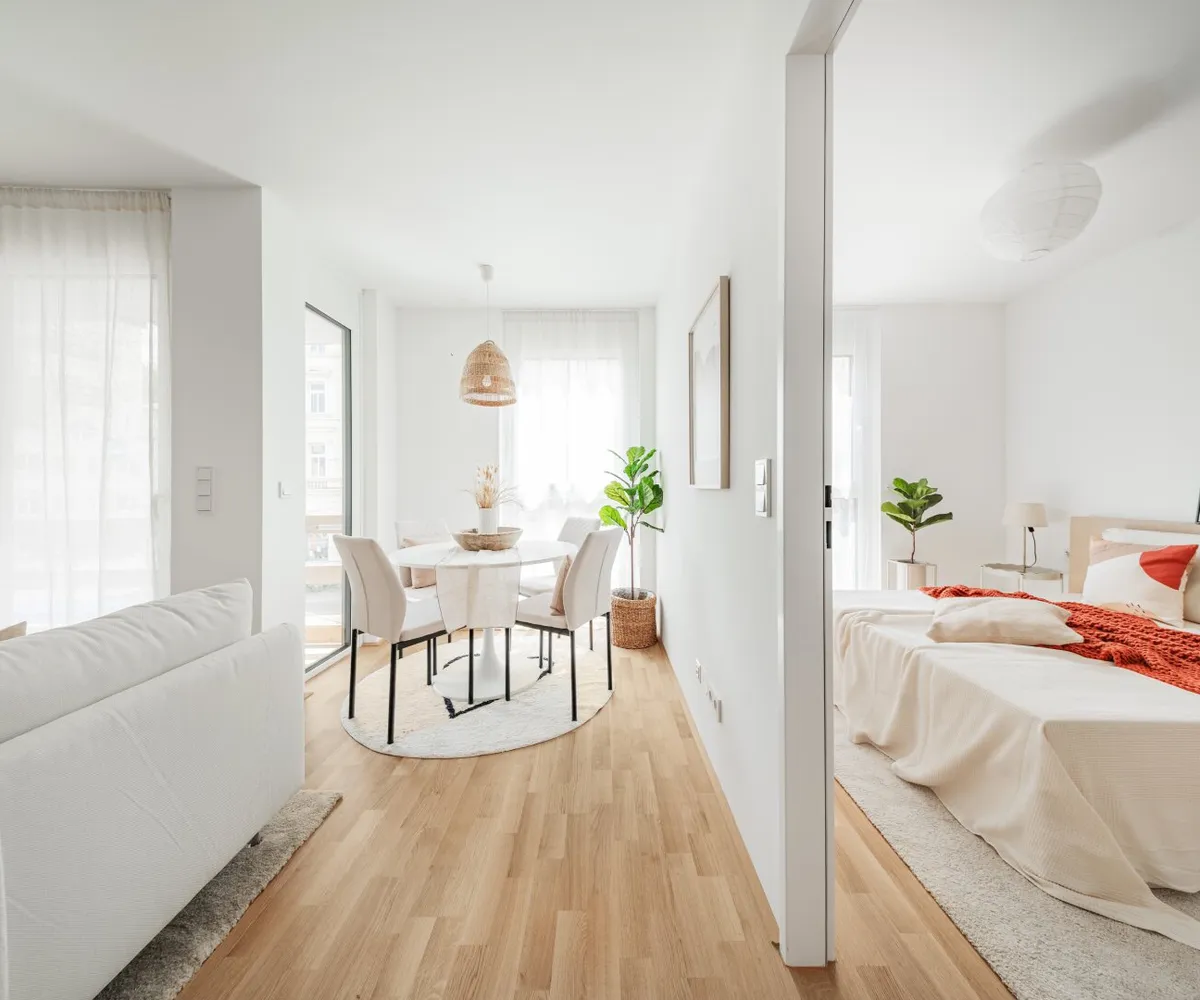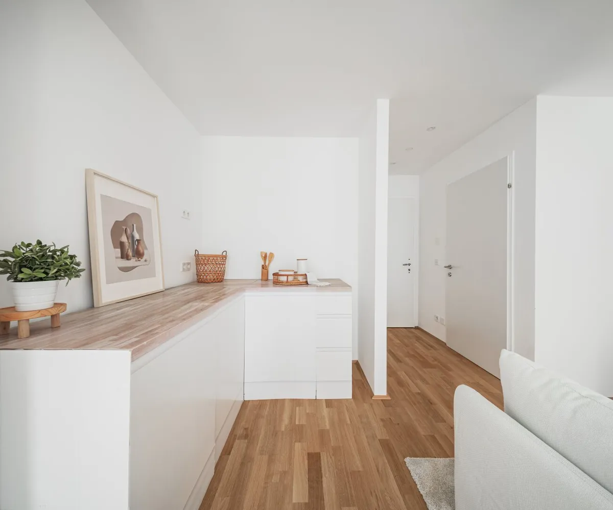 Die sorgfältig geplanten Eigentumswohnungen und Townhouses bieten mit ihren vielfältigen Grundrissen und Wohnungsgrößen für jede Lebensphase die ideale Wohnlösung. Ein behagliches Wohnambiente erzeugen die edlen Eichenparkettböden sowie die hochwertige Sanitärausstattung in den Bädern. Die Raumtemperatur lässt sich bequem über die Fußbodenheizung, die durch Fernwärme betrieben wird, sowie über die elektrisch bedienbaren Raffstores oder Rollläden regulieren. In den Dachgeschosswohnungen sorgen zusätzlich installierte Klimaanlagen dafür, dass es auch im Sommer angenehm kühl bleibt. Jede Wohneinheit verfügt über eine eigene private Freifläche, die die Wohnräume nach außen erweitert und einen idealen Rückzugsort für Erholung und Entspannung bietet.