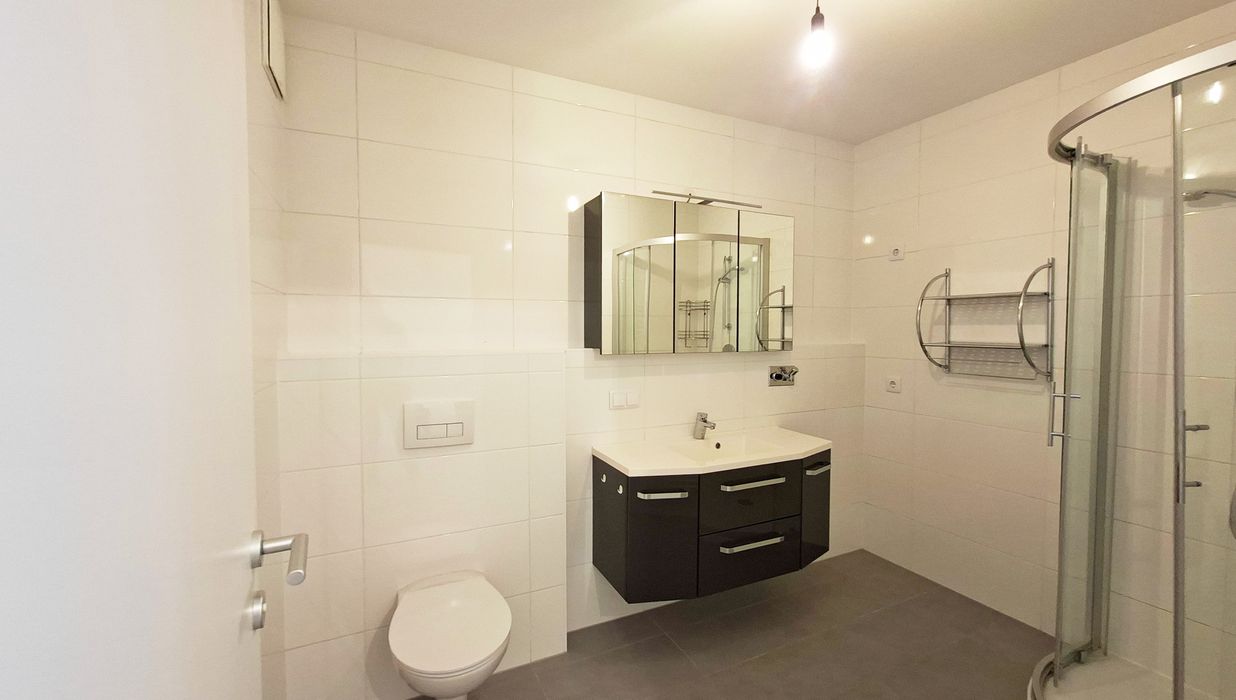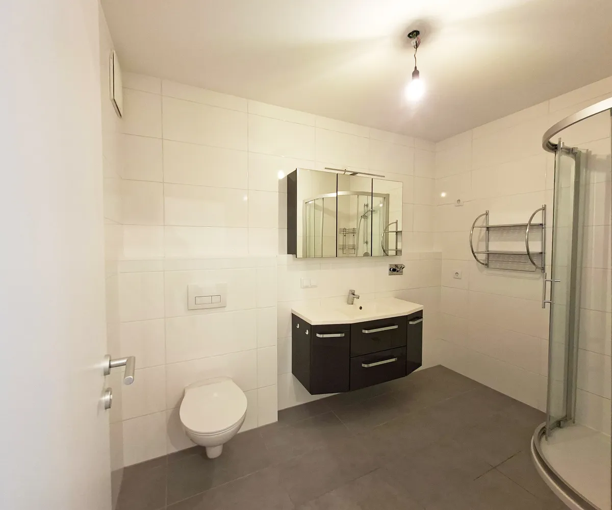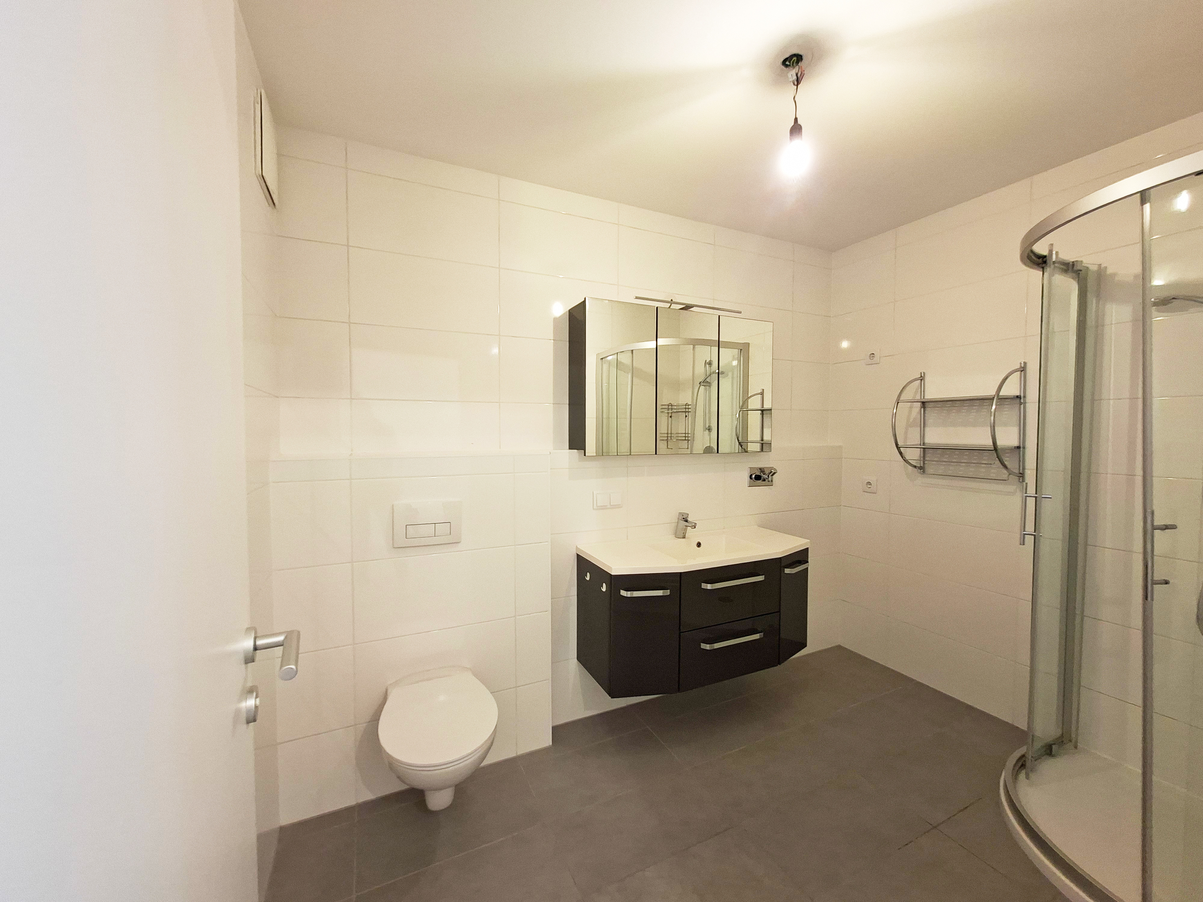 Das Badezimmer ist modern ausgestattet und verfügt über Dusche, WC sowie einen Waschmaschinenanschluss. Ein praktischer Vorraum ergänzt das durchdachte Raumkonzept.