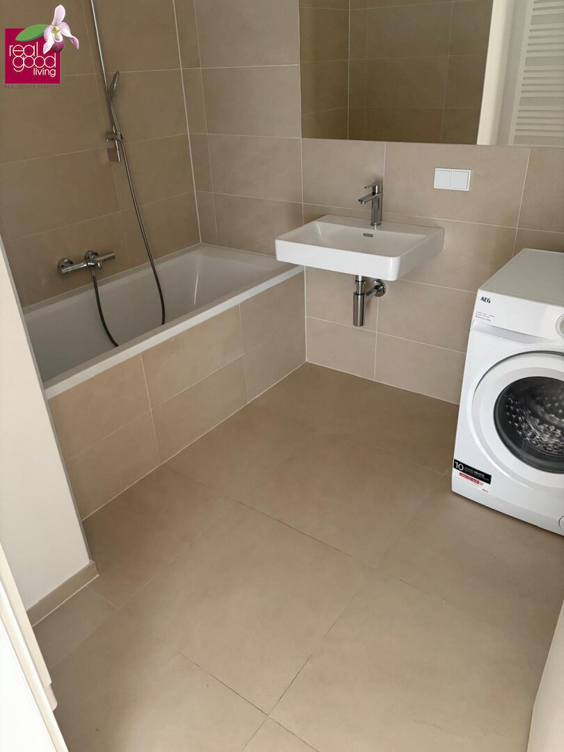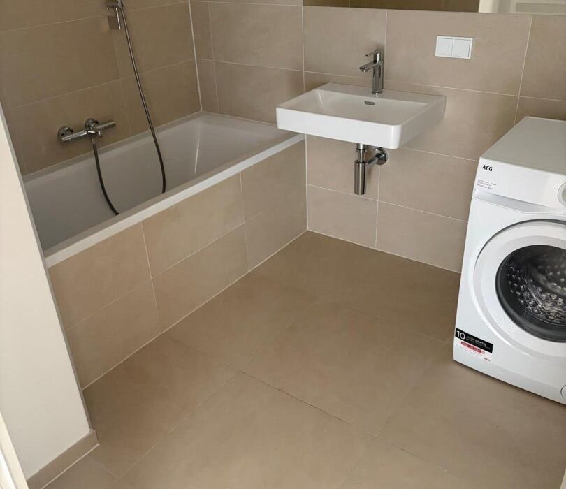 - Badezimmer mit Waschbecken, Badewanne und Waschmaschine