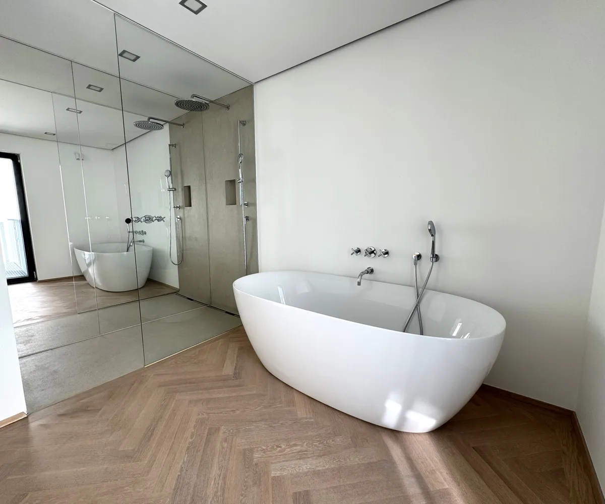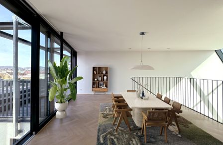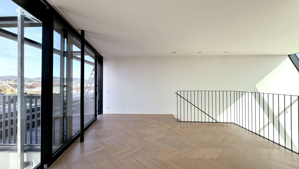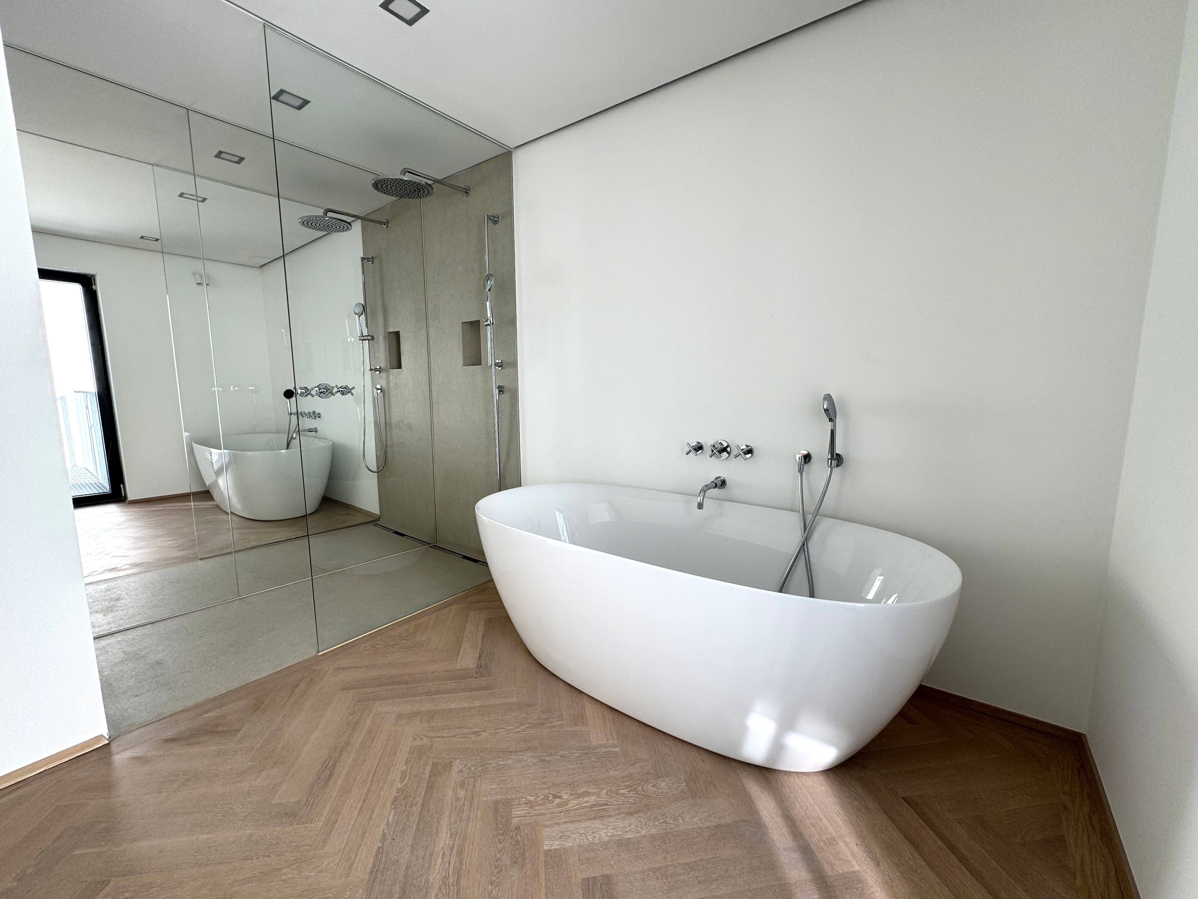 Der hochwertige Dachausbau erfüllt höchste Ansprüche: Fußbodenheizung sowie Boden- und Wandkühlung mittels Luftwärmepumpe sorgen das ganze Jahr über für angenehmes Raumklima. Ein modernes Bussystem ergänzt das innovative Wohnkonzept, und die Ausstattung überzeugt durch erlesene Materialien und zeitlose Eleganz.