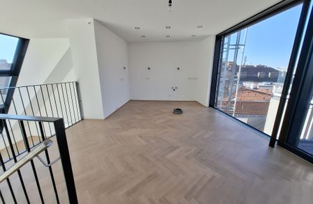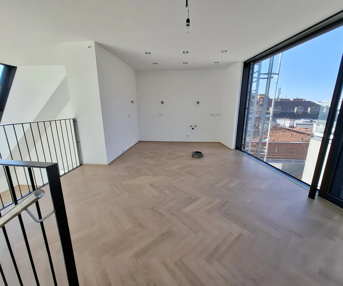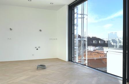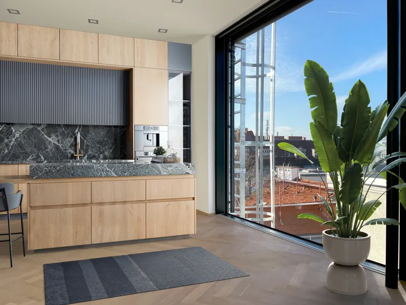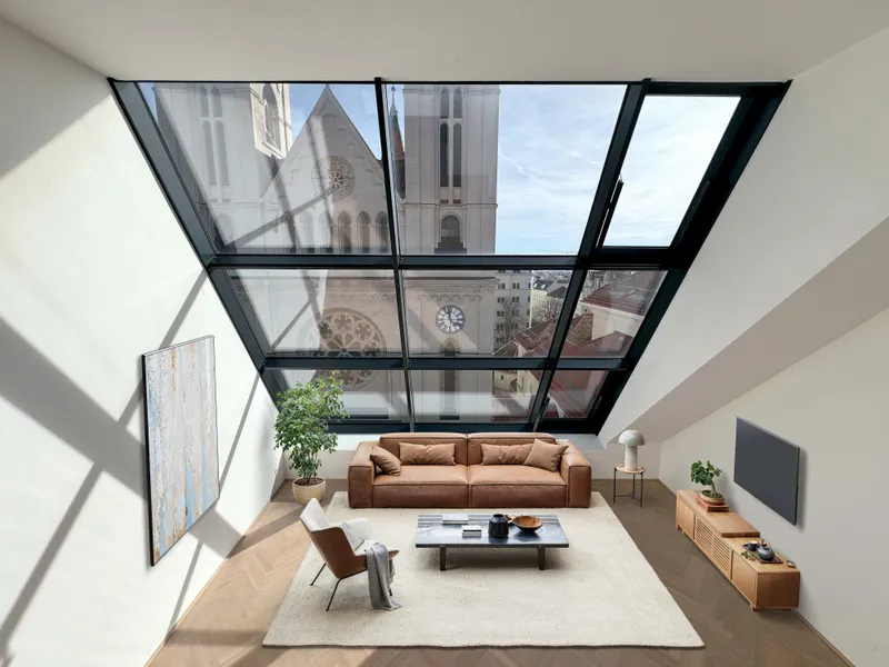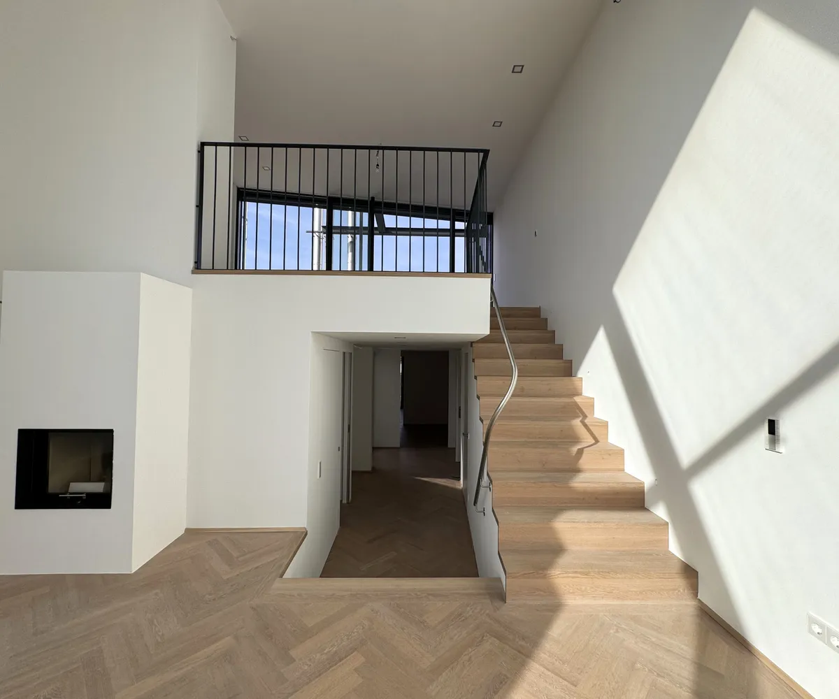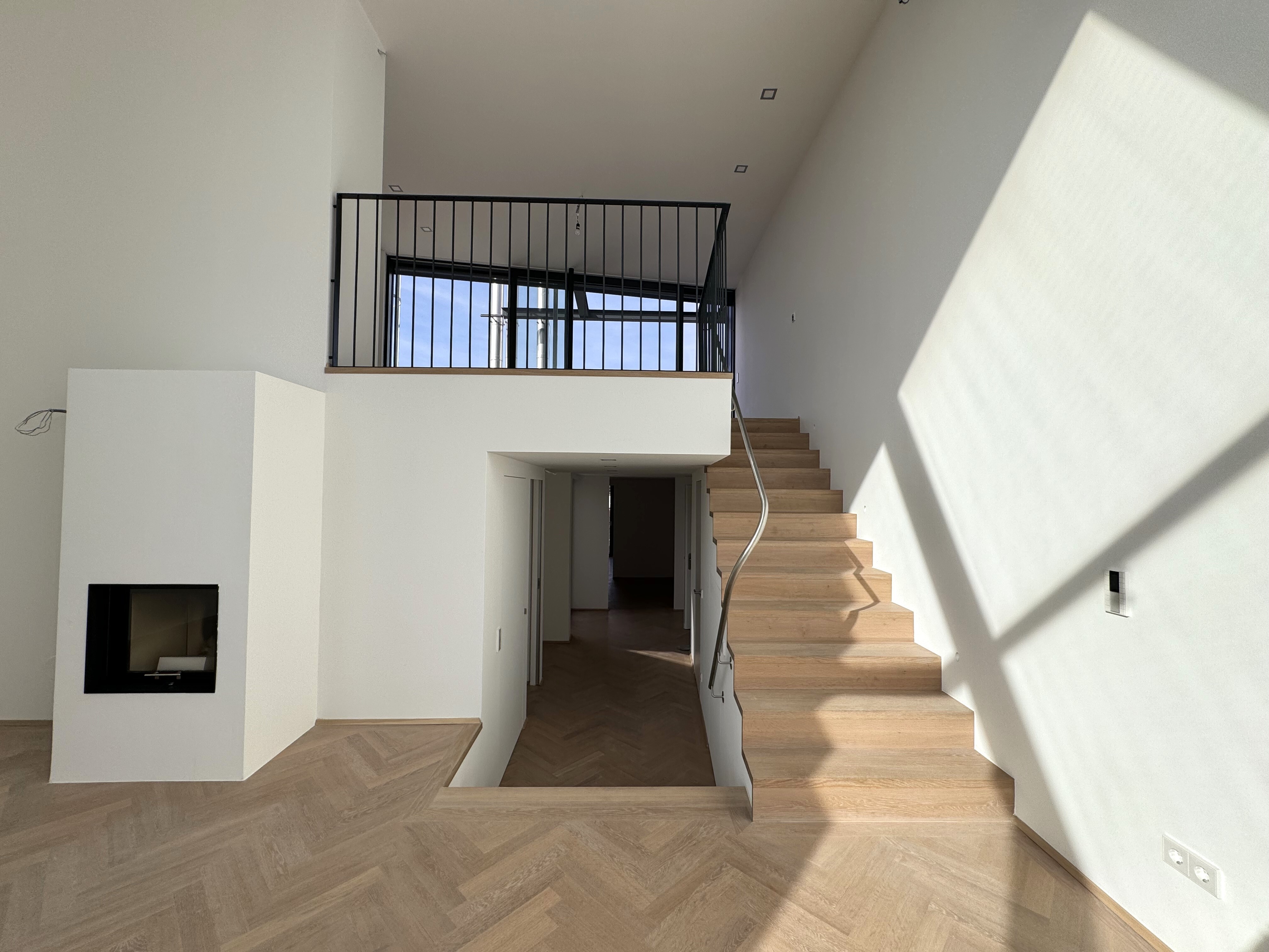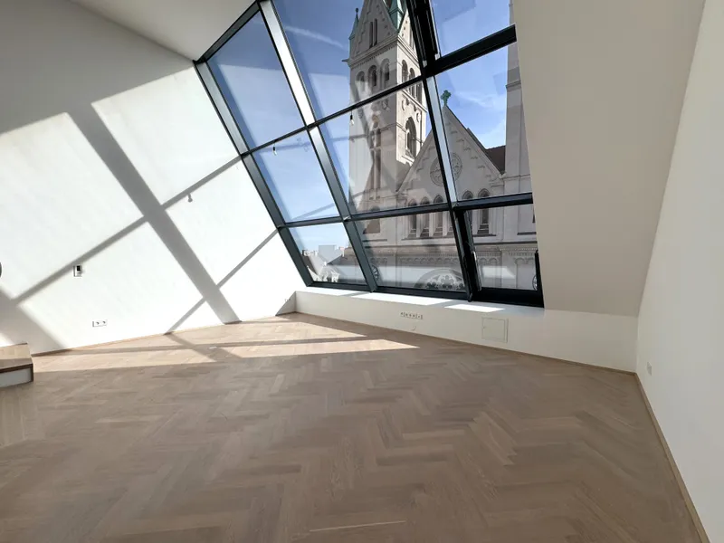 Das Penthouse selbst besticht durch Großzügigkeit, Lichtfülle und stilvolle Eleganz. Auf der unteren Ebene bildet das weitläufige Wohnzimmer mit seinen raumhohen Fensterfronten das Herzstück der Wohnung. Der Blick auf die Canisiuskirche schafft ein unvergleichliches Ambiente, während ein Kamin für behagliche Stunden sorgt. Ebenfalls auf dieser Ebene befinden sich zwei Schlafzimmer, ein luxuriöses Badezimmer mit freistehender Wanne, großzügiger Walk-in Dusche und Doppelwaschbecken, ein separates WC, ein praktischer Abstellraum sowie ein Balkon.