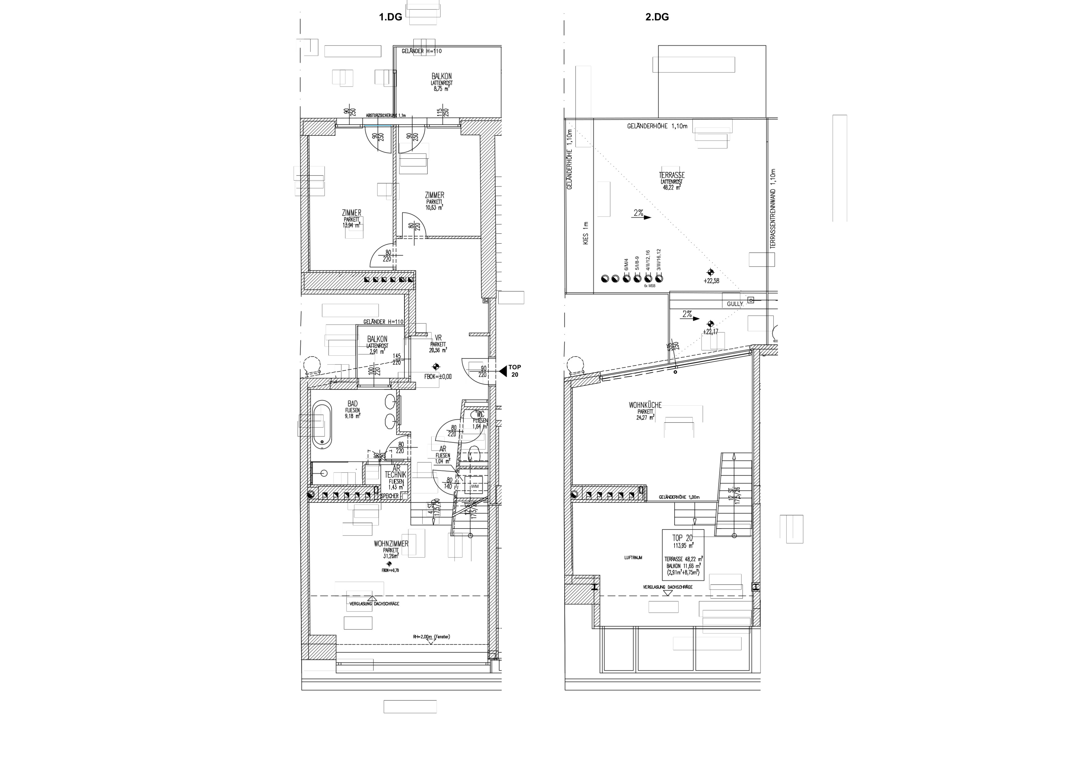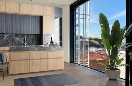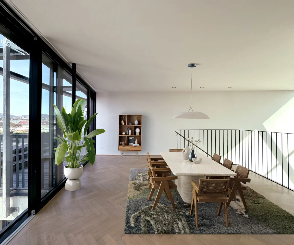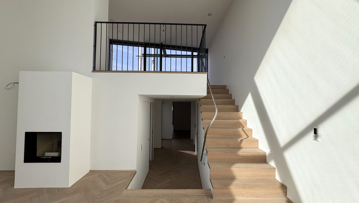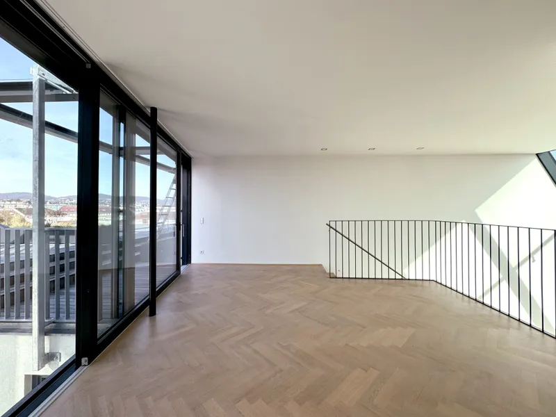 Über eine elegante Treppe gelangen Sie in die obere Ebene, wo eine großzügige Wohnküche zum Kochen, Genießen und Beisammensein einlädt. Großflächige Hebe-Schiebetüren öffnen den Zugang zur rund 50 m² großen Terrasse, die mit ihrem spektakulären Panoramablick über Wien bis hin zum Kahlenberg beeindruckt – ein Platz, der zum Verweilen einlädt und jeden Tag zum Erlebnis macht.