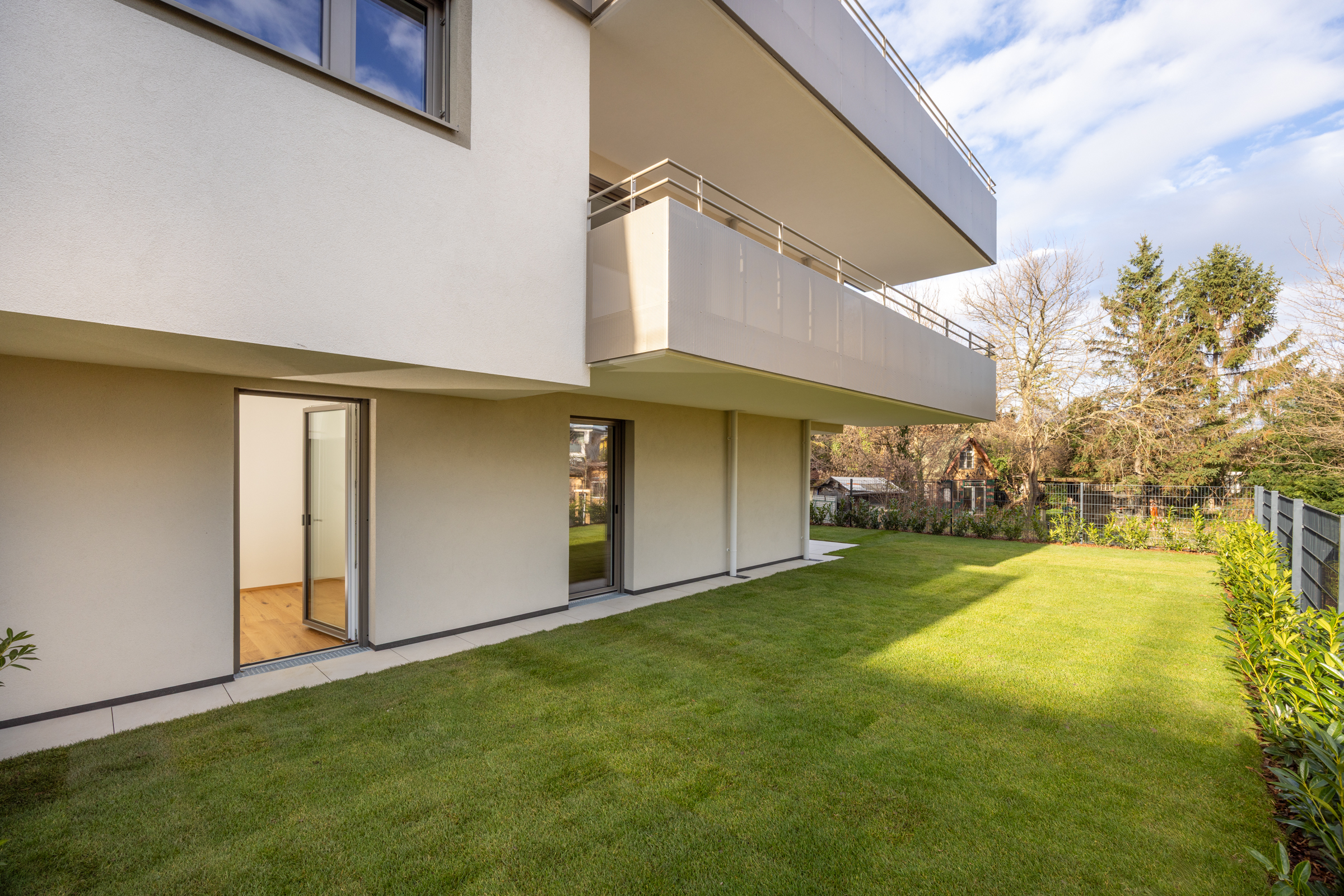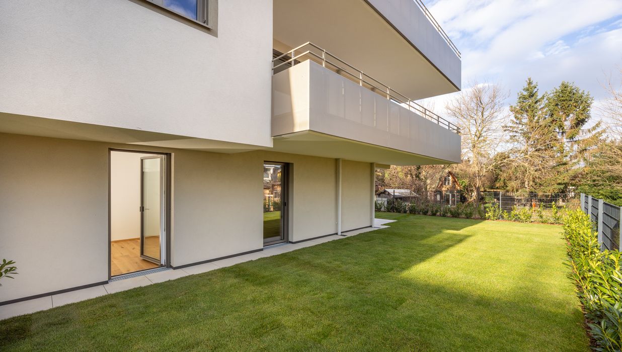 Die Wohnungen überzeugen durch durchdachte Grundrisse, lichtdurchflutete Räume und eine hochwertige, zeitlos elegante Ausstattung. Edle Materialien, moderne Sanitärausstattung, großzügige Fensterflächen sowie private Freiflächen in Form von Eigengärten, Balkonen oder Terrassen bei jedem Top schaffen Wohnräume mit spürbarem Mehrwert. Hier trifft klare Architektur auf Wohnkomfort auf höchstem Niveau.