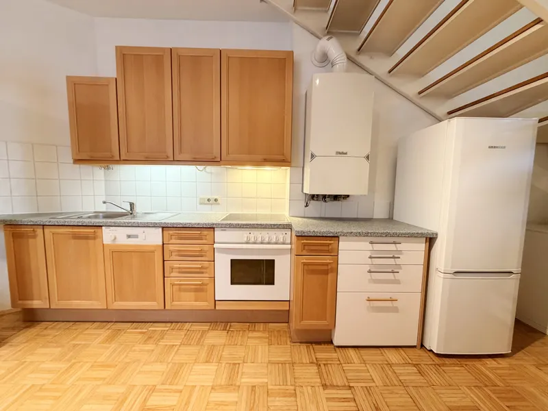 Die Wohnküche überzeugt mit einer Fläche von rund 31,73 m² und bietet viel Platz für die persönliche Einrichtung und Gestaltung. Die moderne Einbauküche bietet alles was Sie für das entspannte Kochen benötigen. Ceran-Kochfeld, Backofen, Dunstabzug, Geschirrspüler, Kühlschrank mit Gefrierfach - hier bleiben keine Wünsche offen.