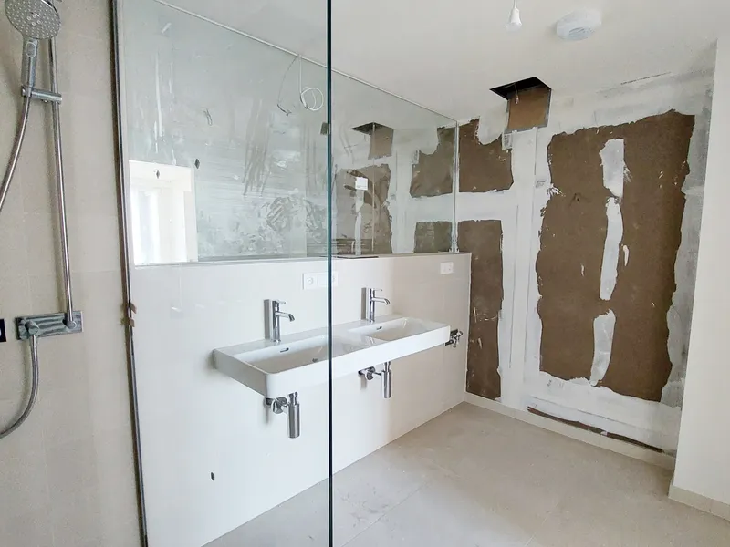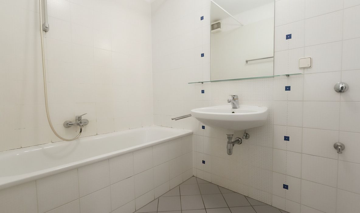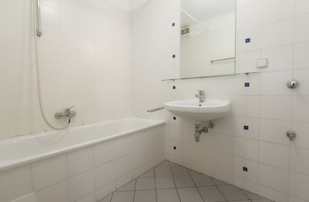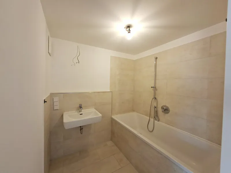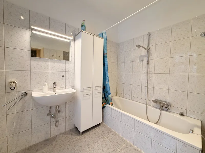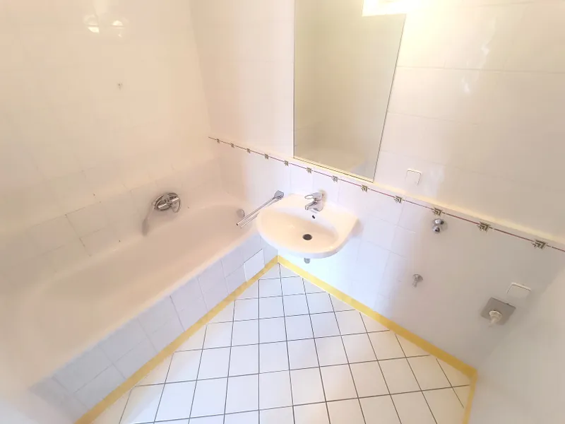 - Badezimmer mit Badewanne und Waschmaschinen-Anschluss