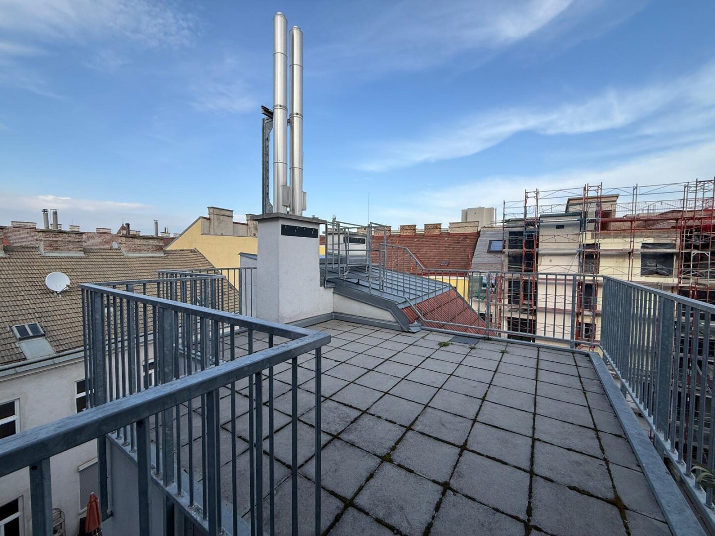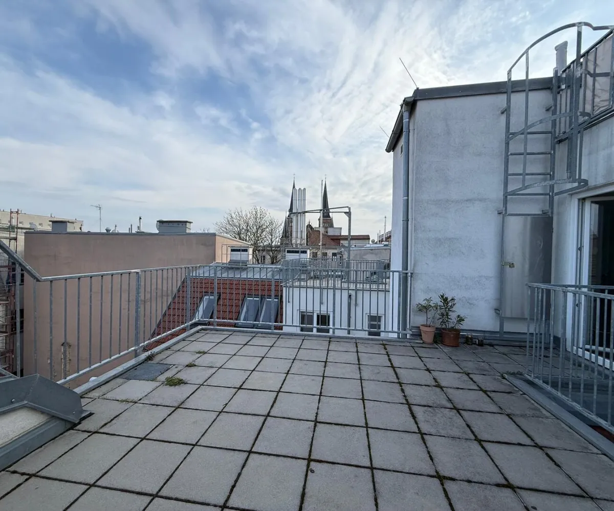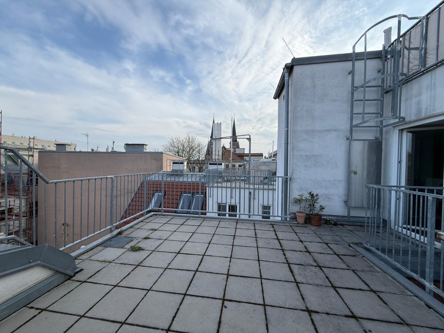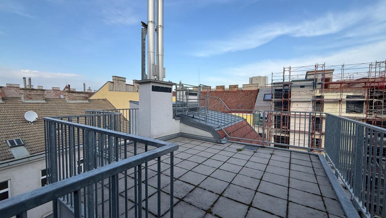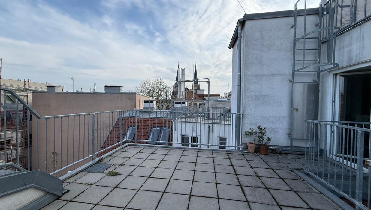 Die rund 14 m2 große Terrasse befindet sich in gleichen Stockwerk und ist in den Innehof gerichtet. Sie ist über den Gang, nicht über die Wohnung direkt, begehbar.