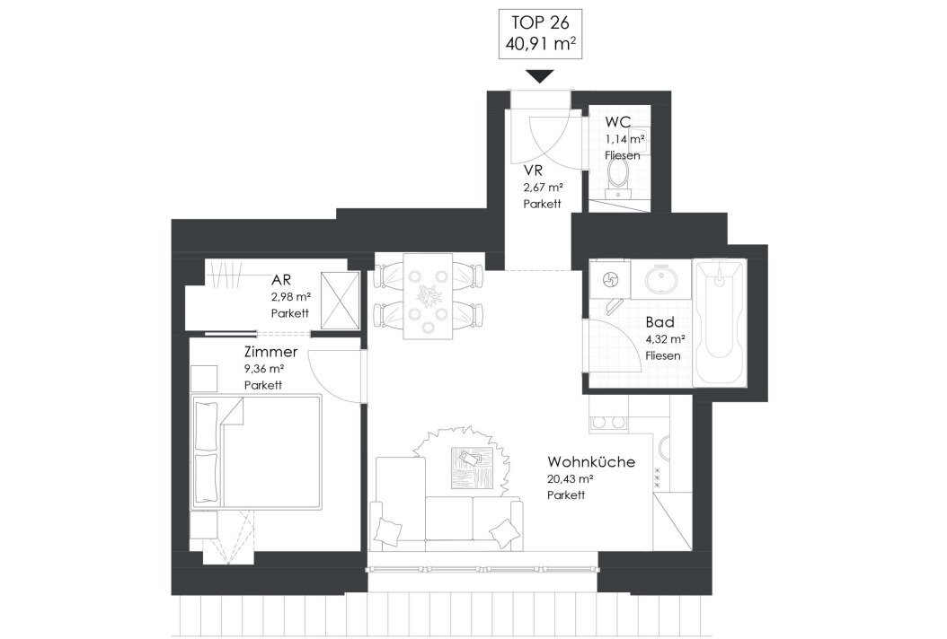 Diese attraktive 2-Zimmerwohnung im Dachgeschoss besticht durch ihr zeitgemäßes Design und eine durchdachte Raumaufteilung. Auf rund 40,91 m² erwartet Sie ein lichtdurchfluteter Wohnbereich mit offener Küche, der Ihnen viel Platz zum Entspannen und Wohlfühlen bietet.