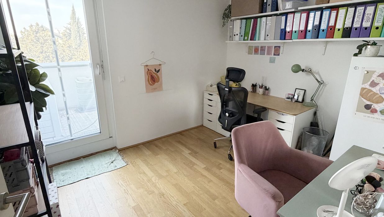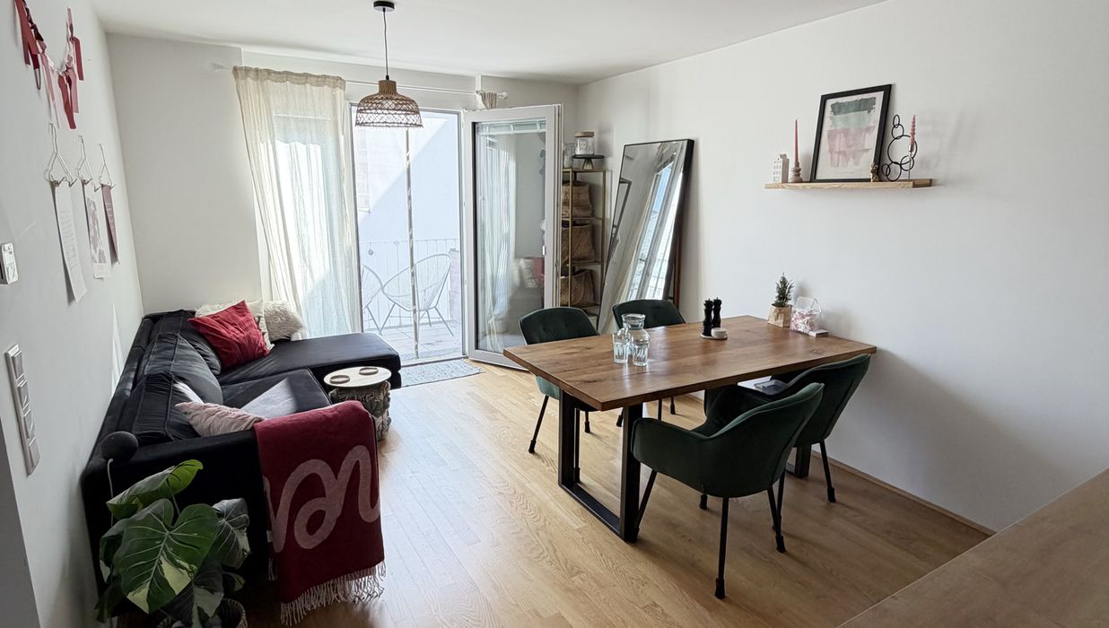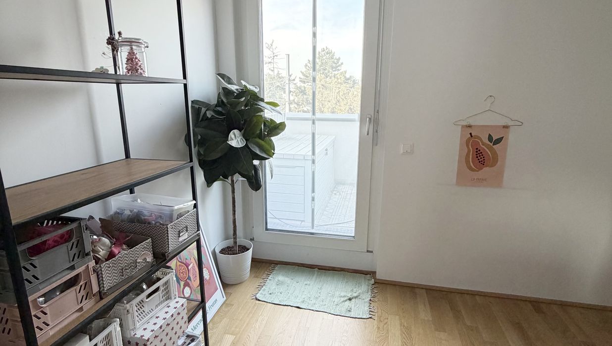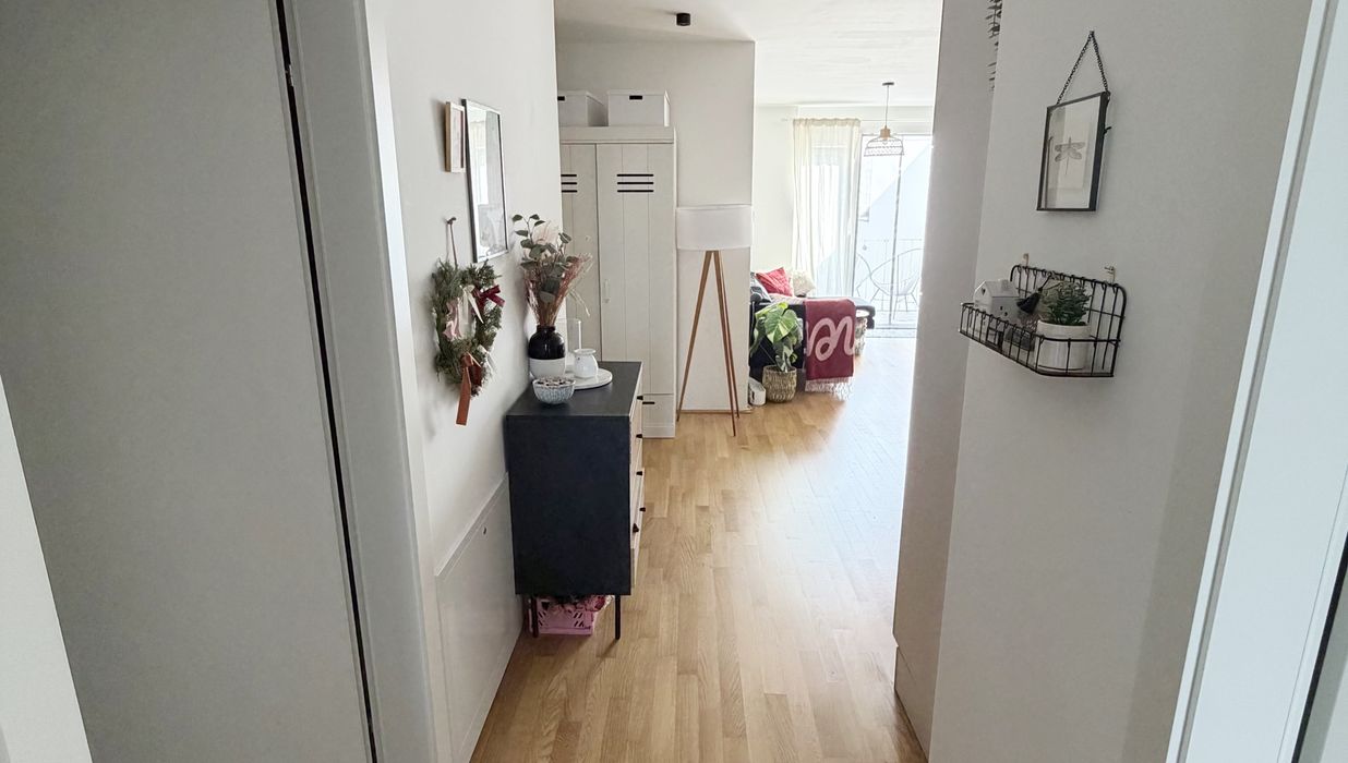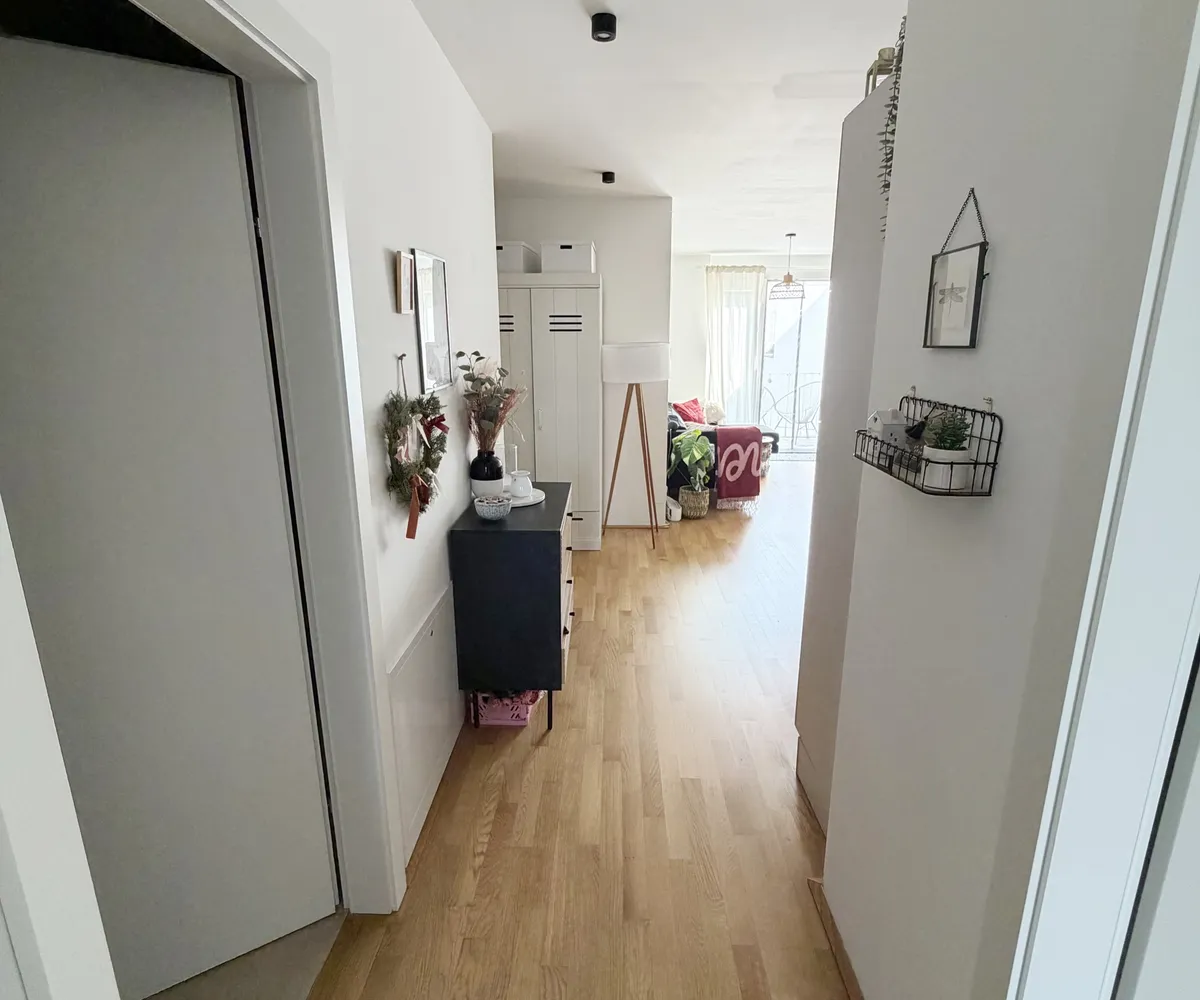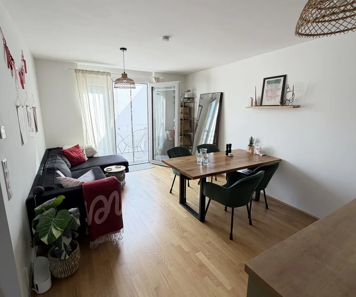 Die Wohnung selbst befindet sich im 1. Dachgeschoss und verfügt über eine großzügige Wohnküche, zwei getrennt begehbare Schlafzimmer, ein Badezimmer mit Badewanne und Waschmaschinenanschluss, ein separates WC, sowie einen Vorraum. Der Ost- und westseitigen Terrassen sind vom Wohnzimmer und Schlafzimmer aus begehbar und runden das Wohnerlebnis perfekt ab.