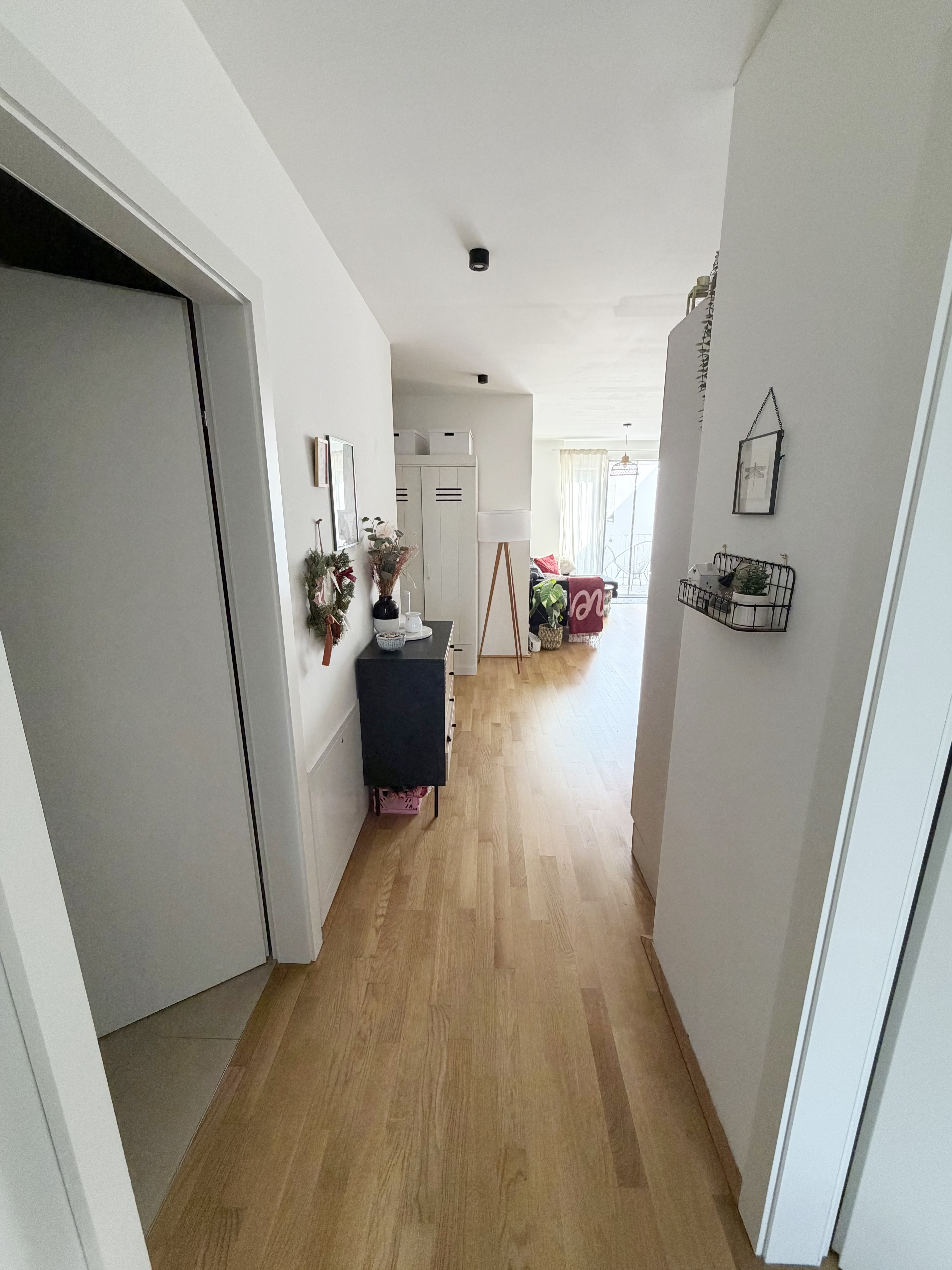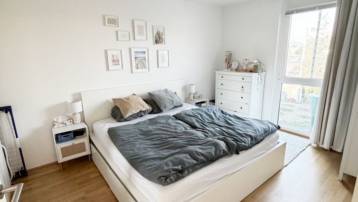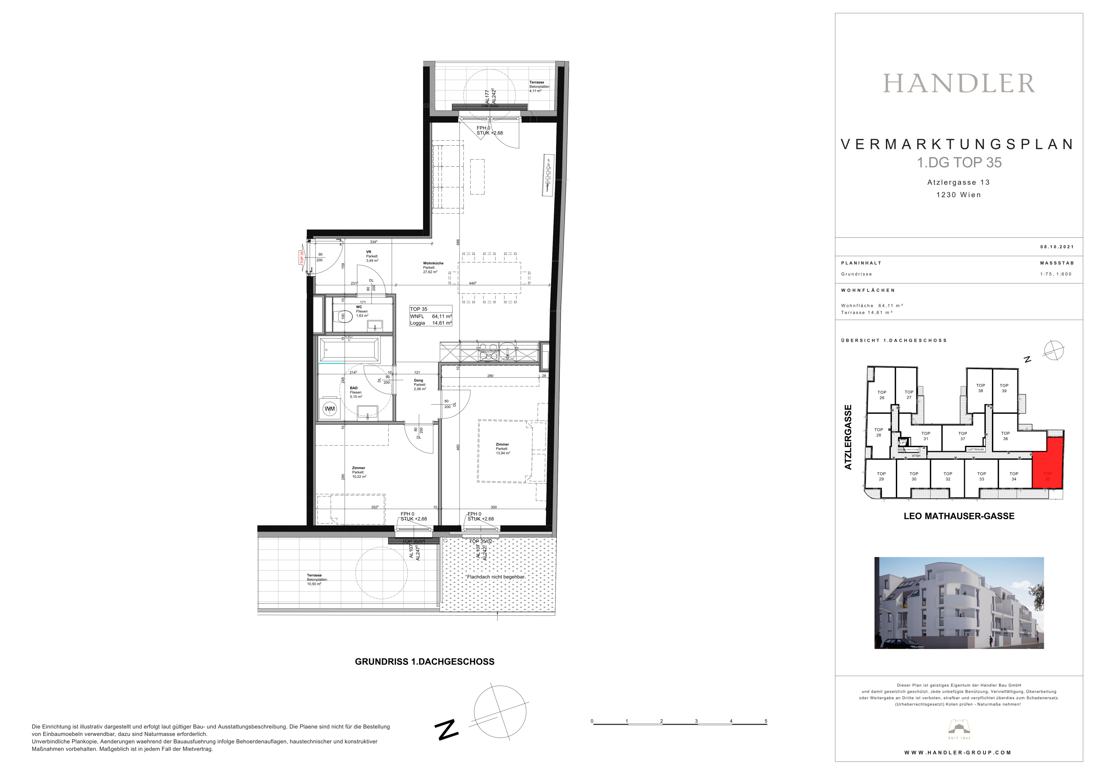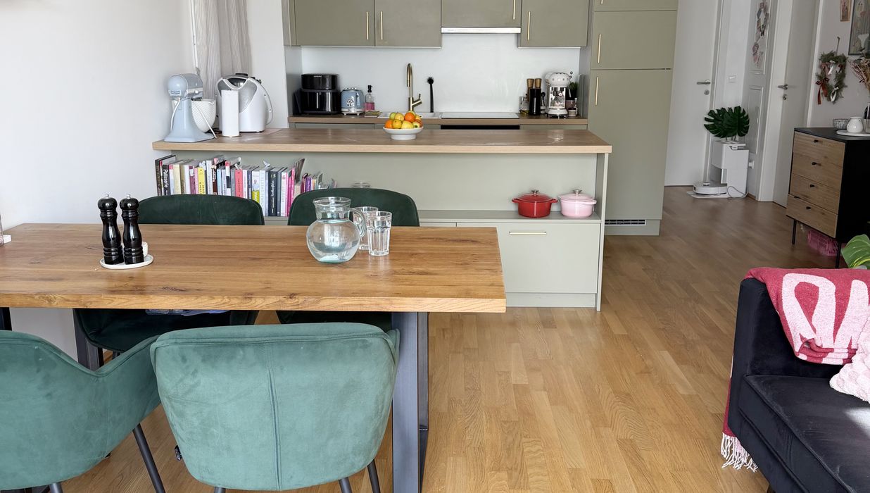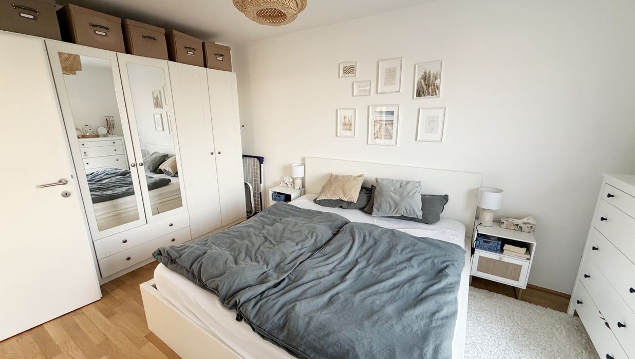 Die Wohnung selbst befindet sich im 1. Dachgeschoss und verfügt über eine großzügige Wohnküche, zwei getrennt begehbare Schlafzimmer, ein Badezimmer mit Badewanne und Waschmaschinenanschluss, ein separates WC, sowie einen Vorraum. Der Ost- und westseitigen Terrassen sind vom Wohnzimmer und Schlafzimmer aus begehbar und runden das Wohnerlebnis perfekt ab.