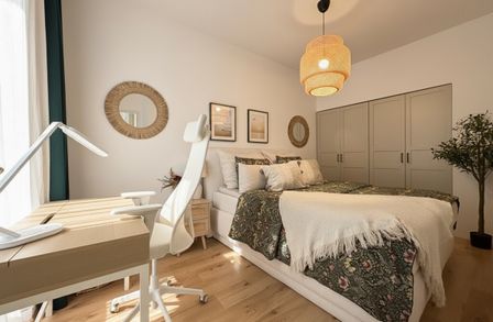 Das ruhige Schlafzimmer mit integriertem Home-Office-Bereich vereint Rückzug und Funktionalität ideal. Das moderne Badezimmer mit Walk-in-Dusche unterstreicht den gehobenen Ausstattungsstandard.