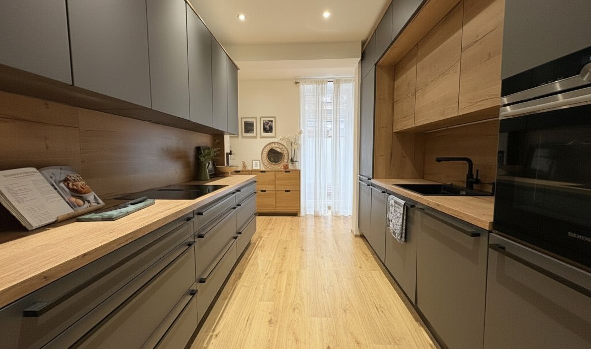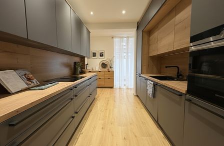 Die elegante Novella-Küche mit Siemens-Einbaugeräten fügt sich perfekt in den Raum ein und bietet höchste Qualität für den Alltag.