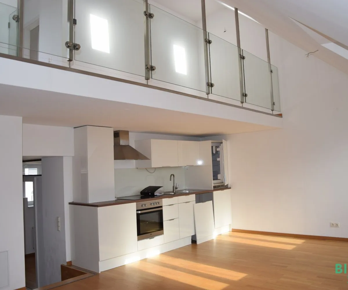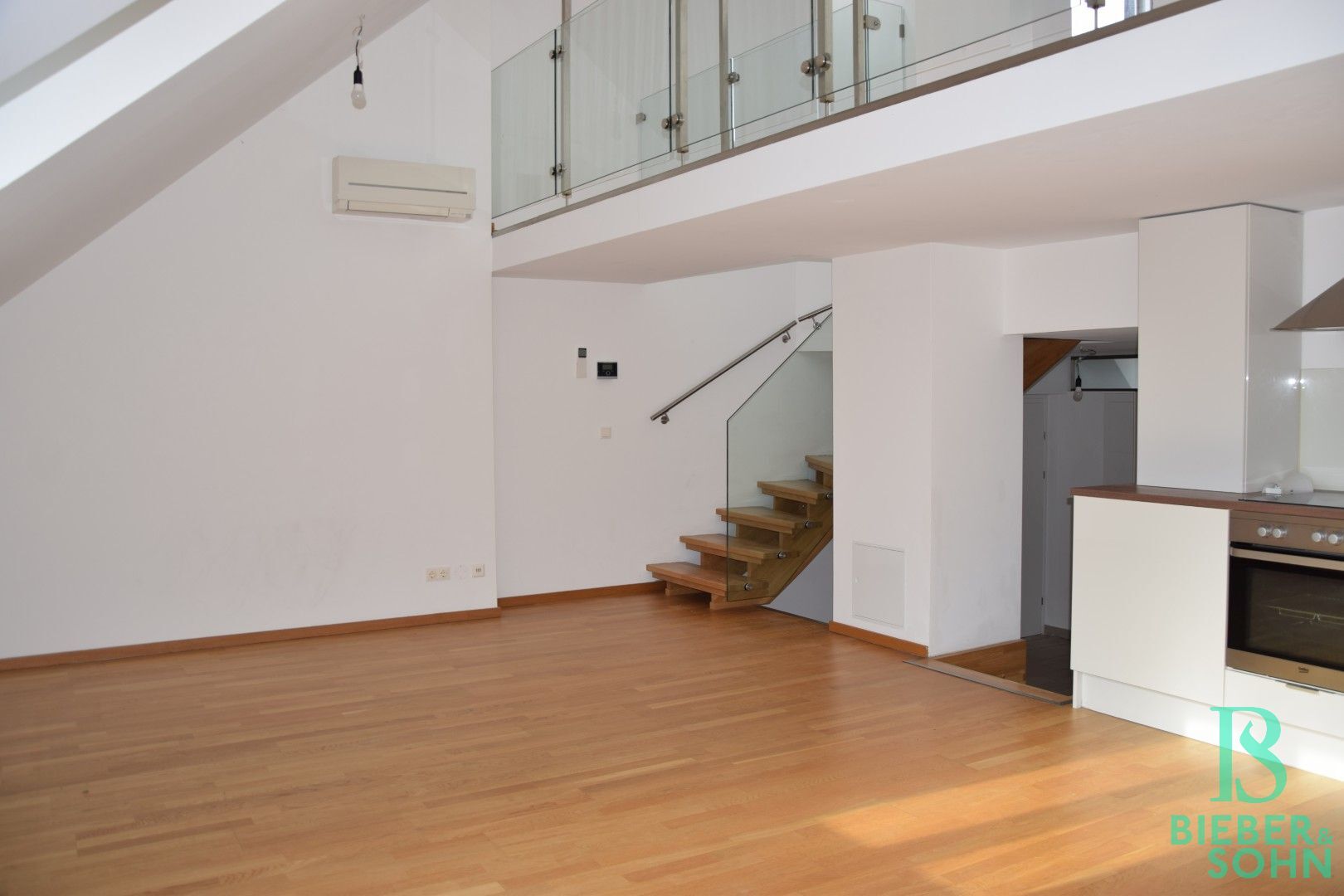 Eine schöne Parkett-Stiege leitet in das Obergeschoss, das durch die außergewöhnliche Galerie einen besonderen Charme erhält. Weiterführend in ein Zimmer mit Duschbad und WC und dem Ausgang auf die traumhafte Dachterrasse sind das highlight dieser Dachgeschosswohnung!