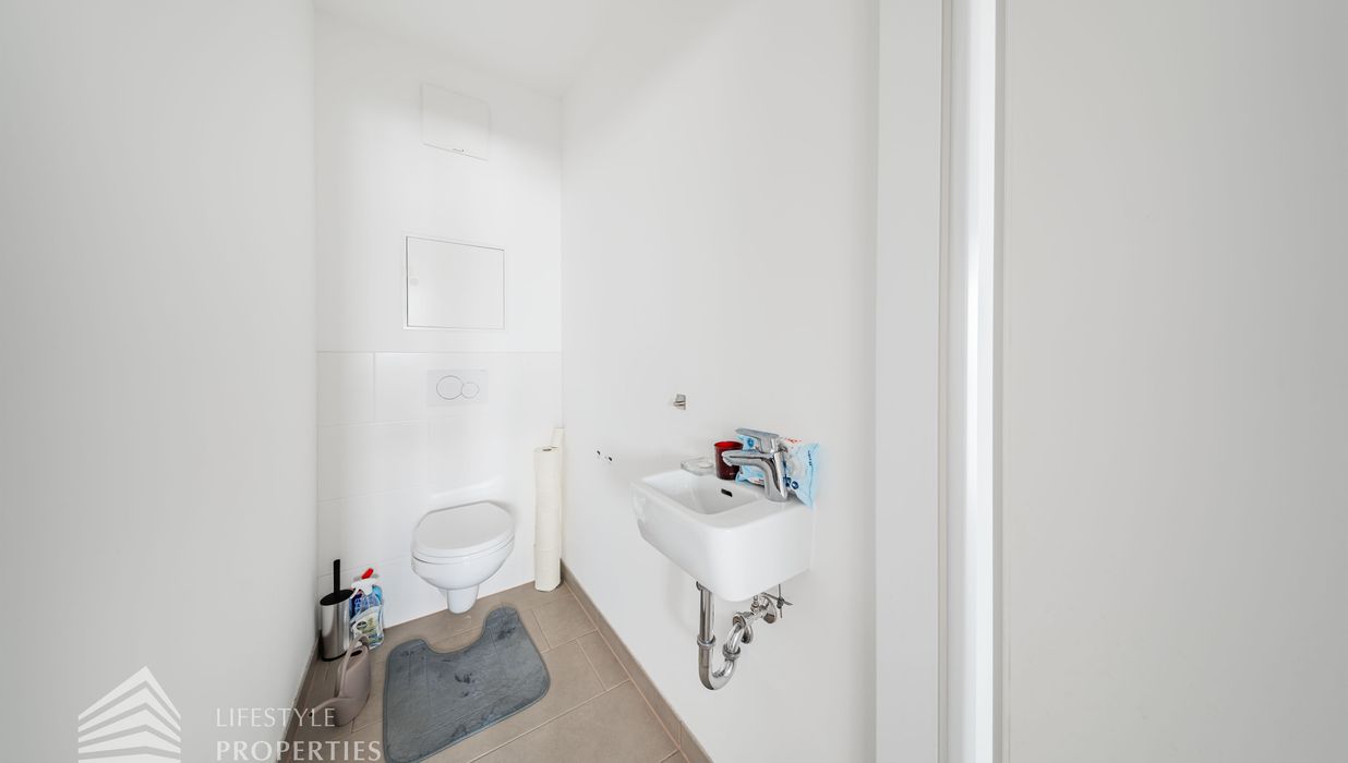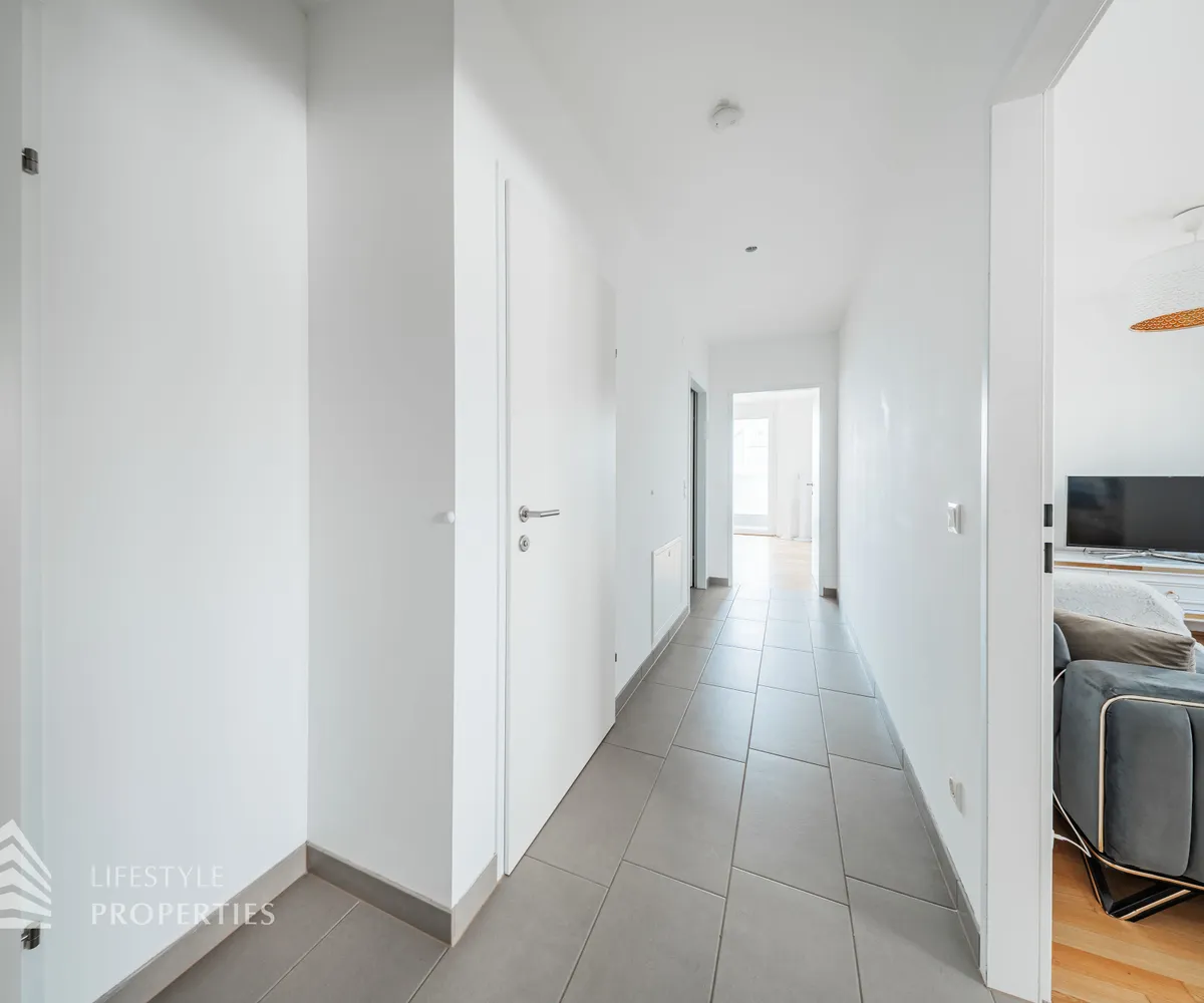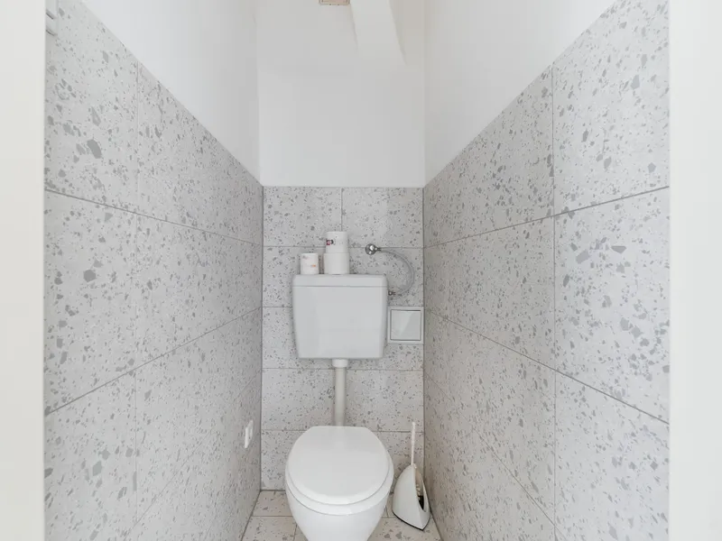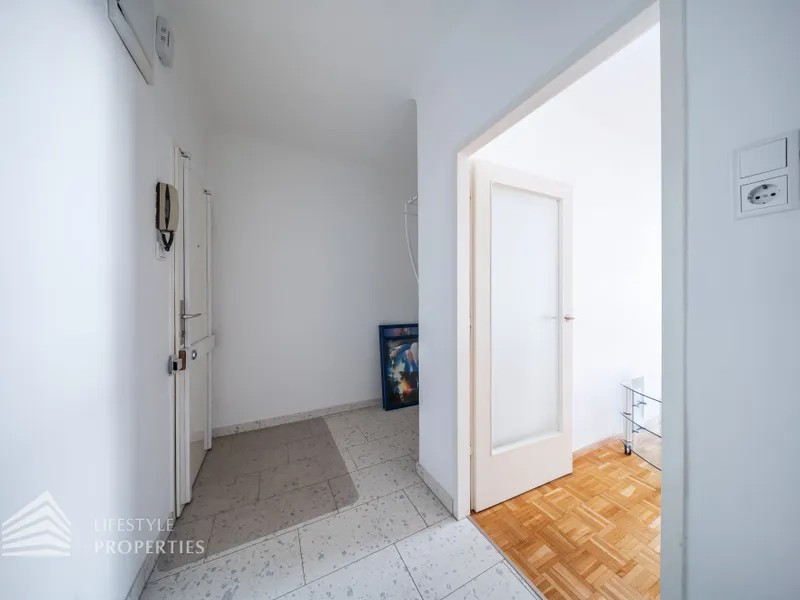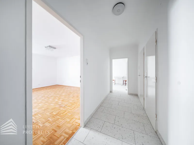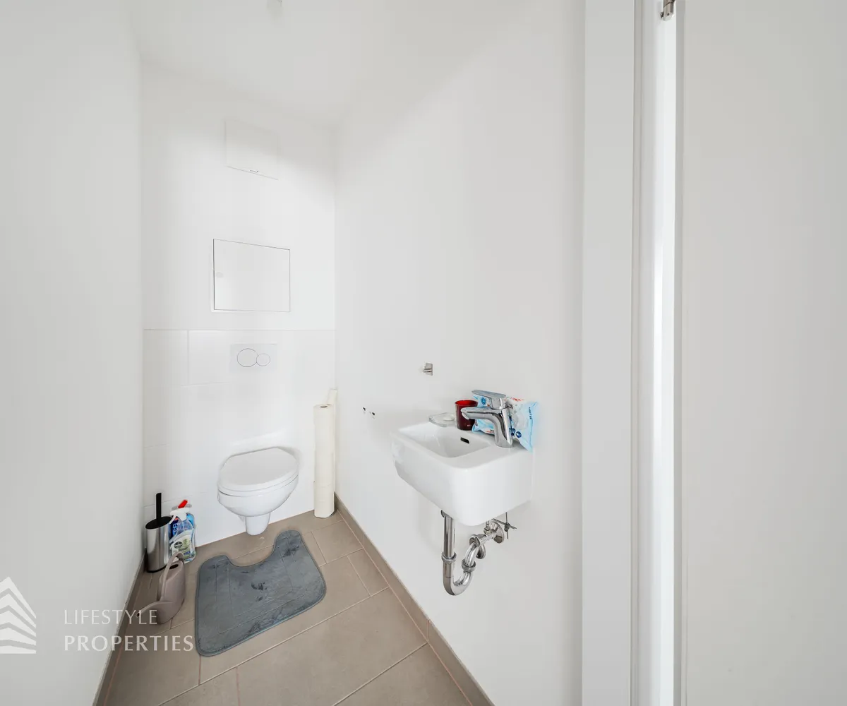 Vom Vorraum aus erreicht man außerdem das Badezimmer, das separat angelegte WC sowie einen praktischen Abstellraum mit Waschmaschinenanschluss, der zusätzlichen Stauraum innerhalb der Wohnung bietet.