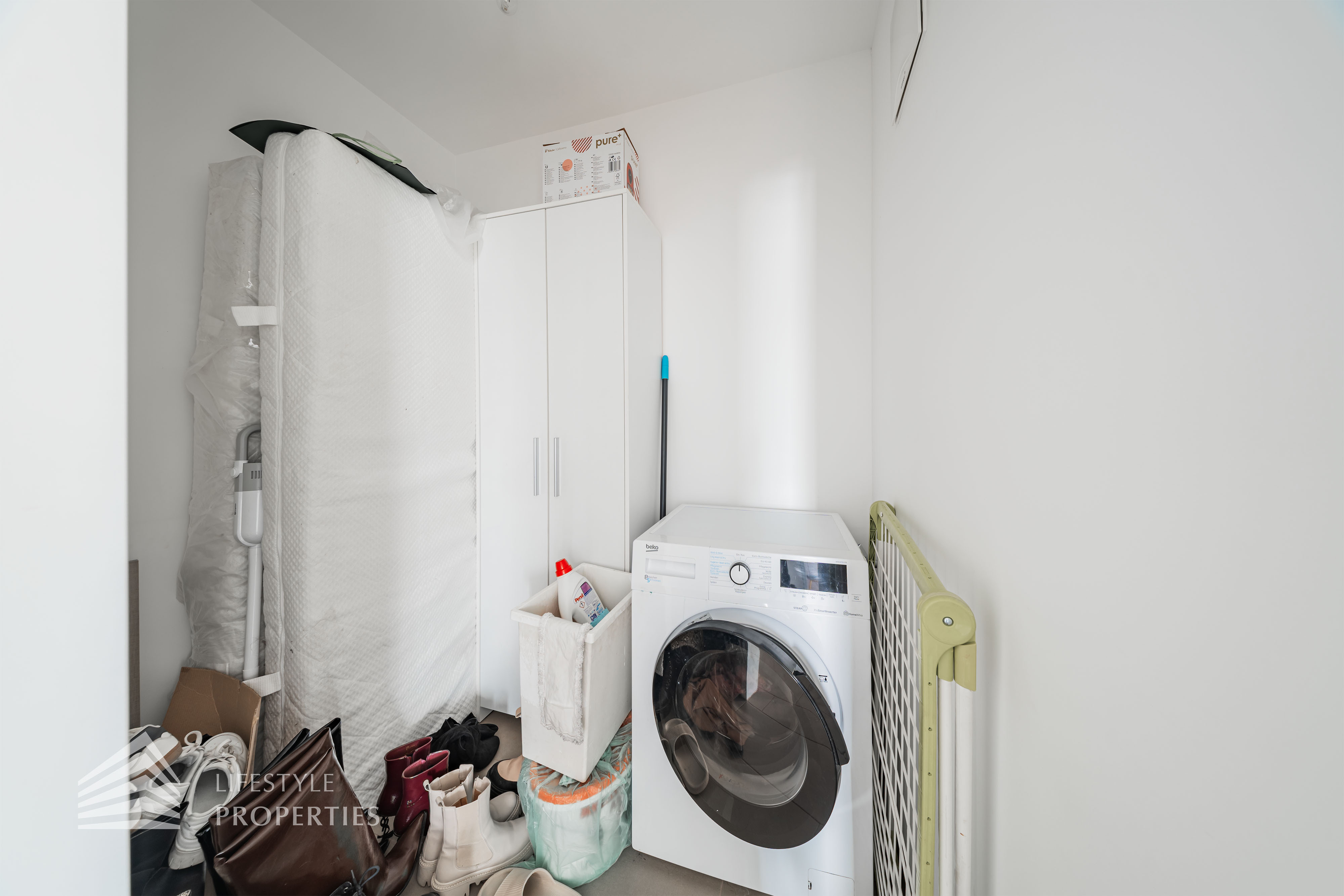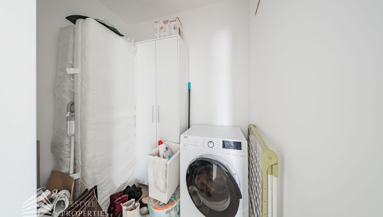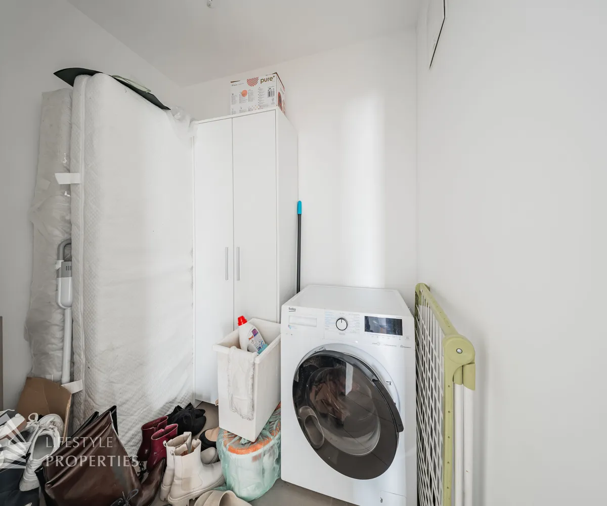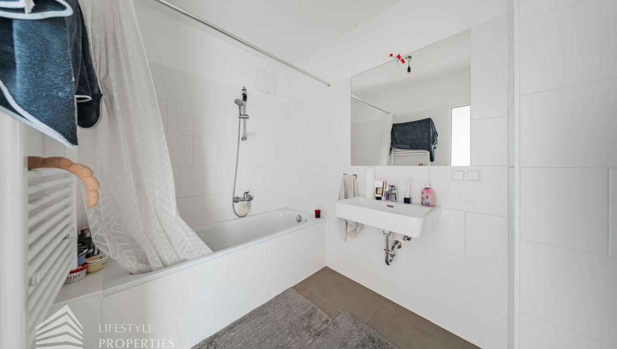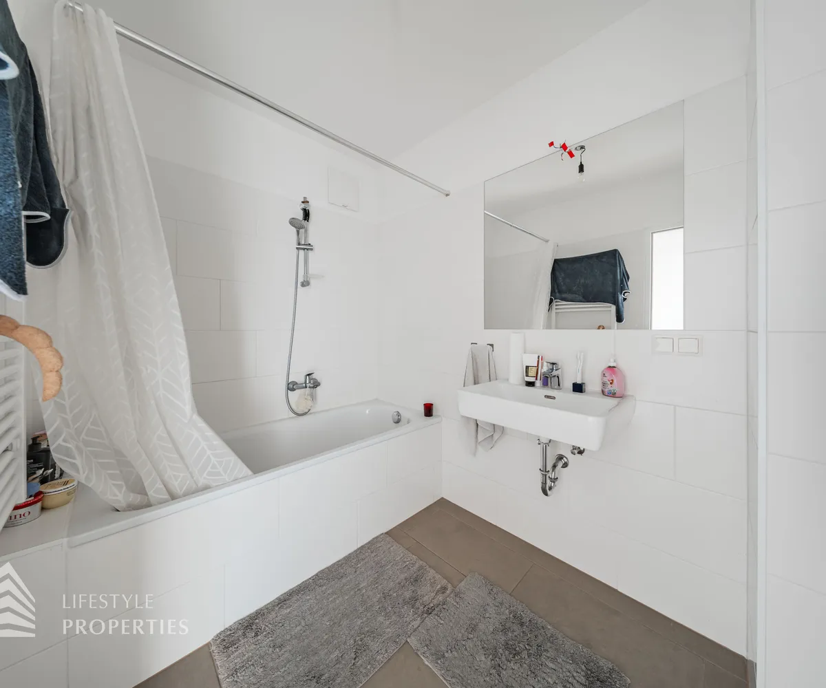 Vom Vorraum aus erreicht man außerdem das Badezimmer, das separat angelegte WC sowie einen praktischen Abstellraum mit Waschmaschinenanschluss, der zusätzlichen Stauraum innerhalb der Wohnung bietet.