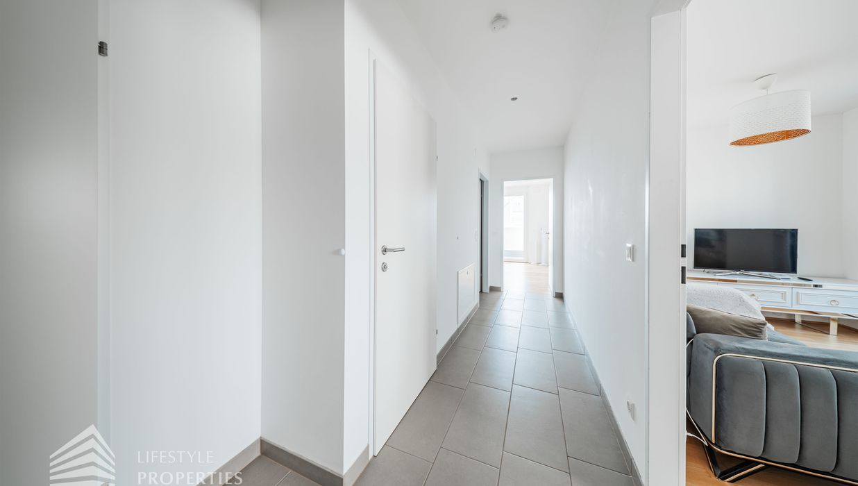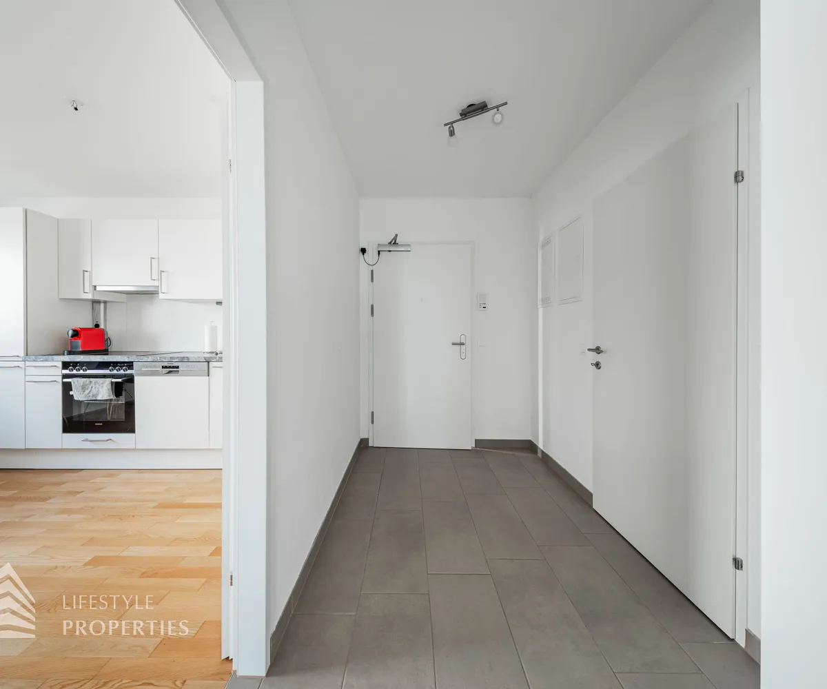 Bereits beim Betreten der Wohnung über den Vorraum eröffnet sich eine klare und funktionale Raumstruktur, da sämtliche Räume zentral begehbar sind. Vom Vorraum aus gelangt man zunächst in die großzügige Wohnküche im modernen Open-Space-Konzept mit ca. 22 m², die das Herzstück der Wohnung bildet. Dieser lichtdurchflutete Wohnbereich ist nord-westlich ausgerichtet und bietet ausreichend Platz für eine komfortable Wohn- und Esszone. Von hier aus gelangt man direkt auf die Loggia mit ca. 3 m², die zum Entspannen im Freien einlädt und zusätzlichen Wohnraum unter freiem Himmel schafft.