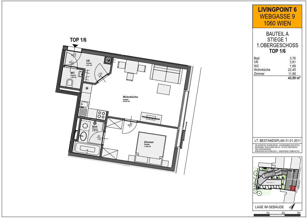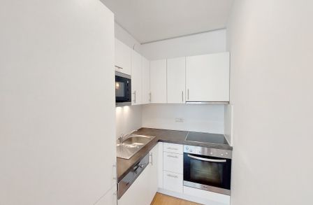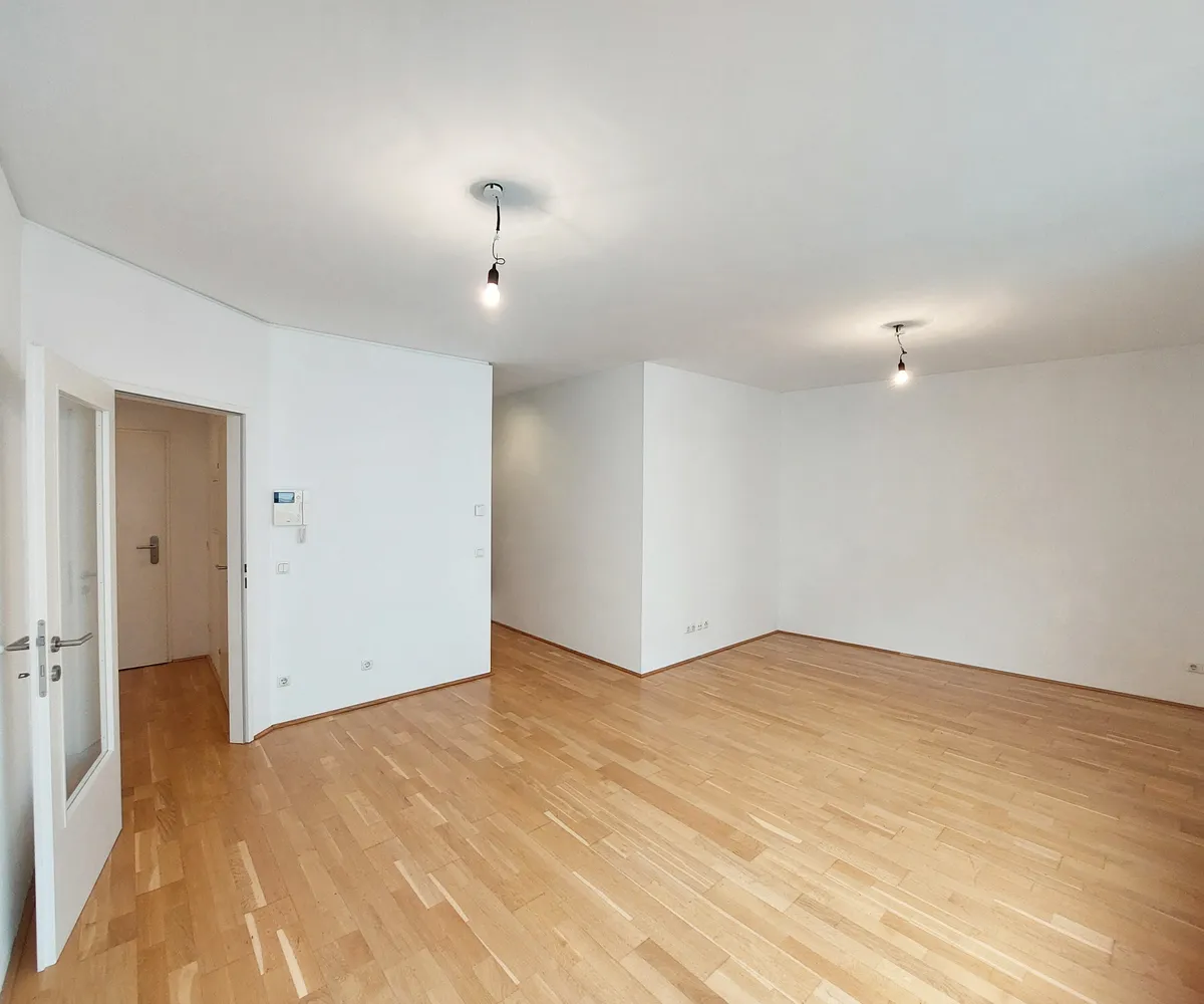 Die verfügbare Wohnung befindet sich im 1. Liftstock eines modernen Gebäudes. Sie verfügt über eine Wohnküche, ein getrennt begehbares Schlafzimmer, ein Badezimmer mit Badewanne und Waschmaschinenanschluss, eine separate Toilette und einen Vorraum.
