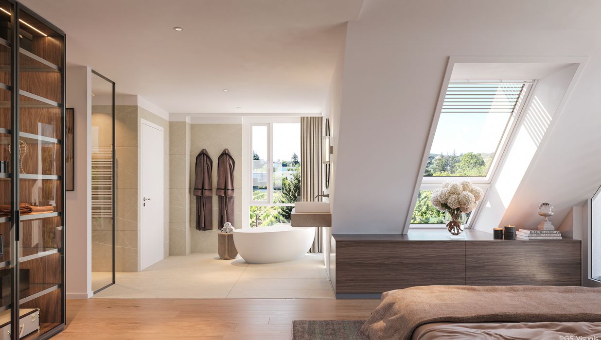 Nachhaltiges Bauen wird hier konsequent umgesetzt – diskret und effizient. Eine hauseigene Photovoltaikanlage, Luftwärmepumpe, Deckenkühlung sowie eine Regenwasserzisterne für die Gartenbewässerung schaffen ökologische und ökonomische Vorteile – ganz ohne Kompromisse beim Wohnkomfort.