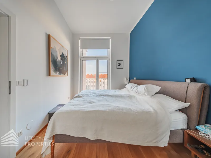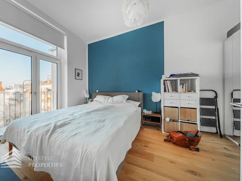 Das Bad mit Wanne ist dem geräumigen Schlafzimmer angeschlossen. Ein perfekter Grundriss für Singles und Paare!
