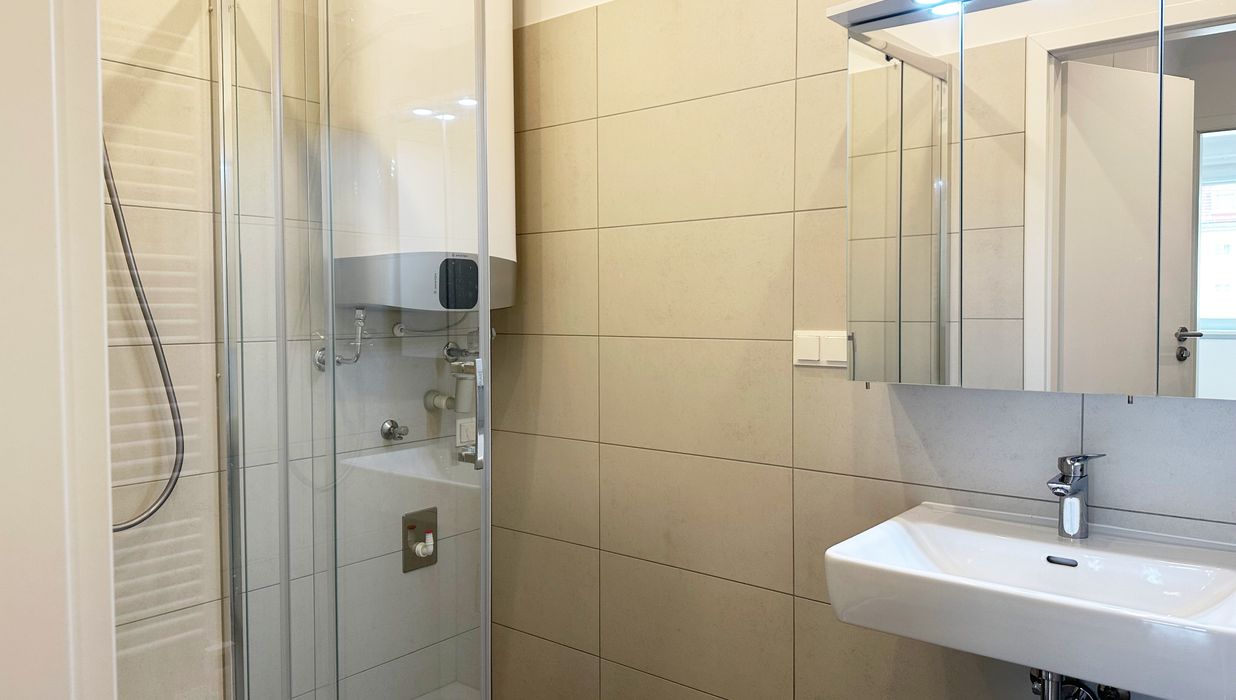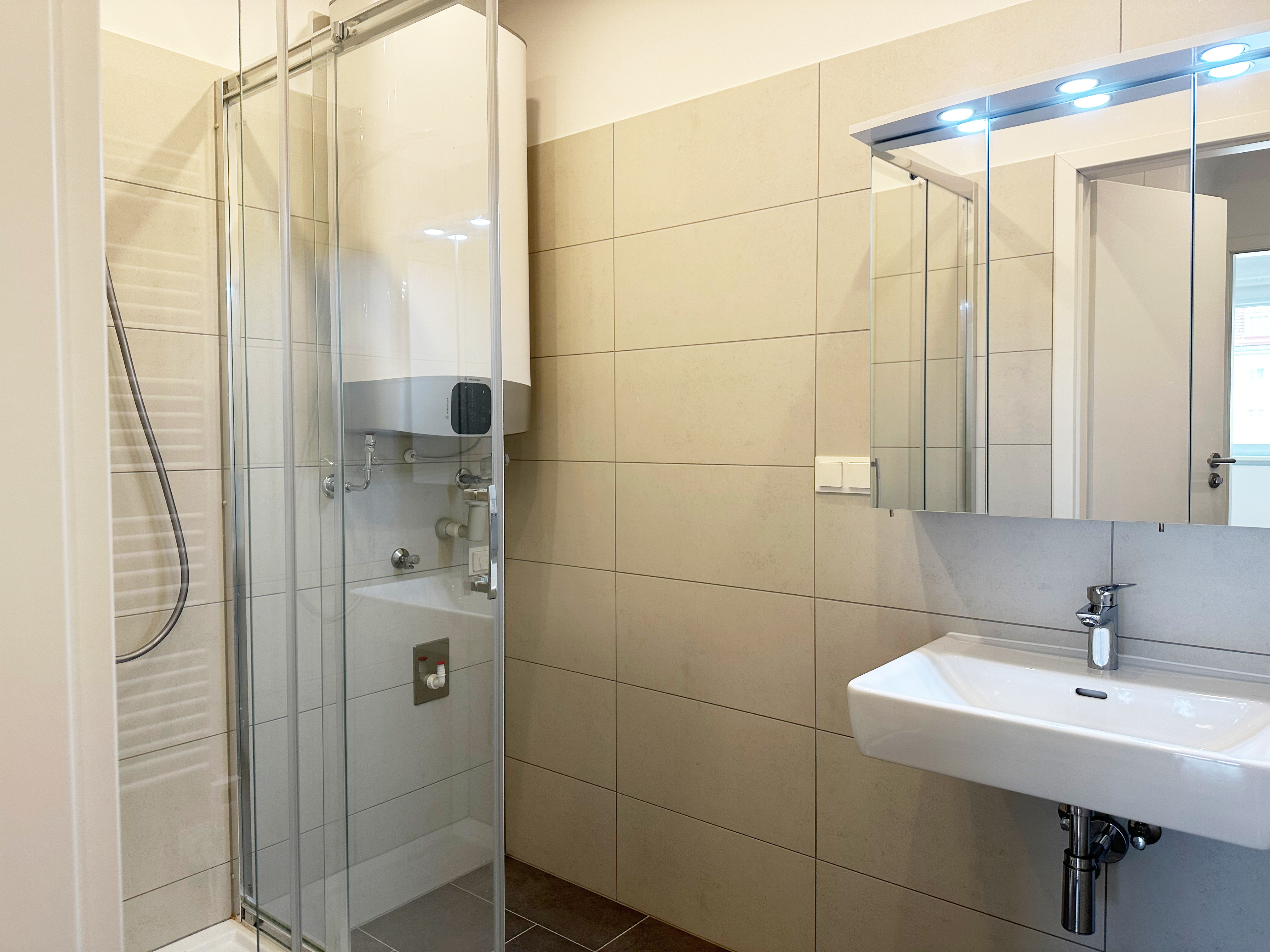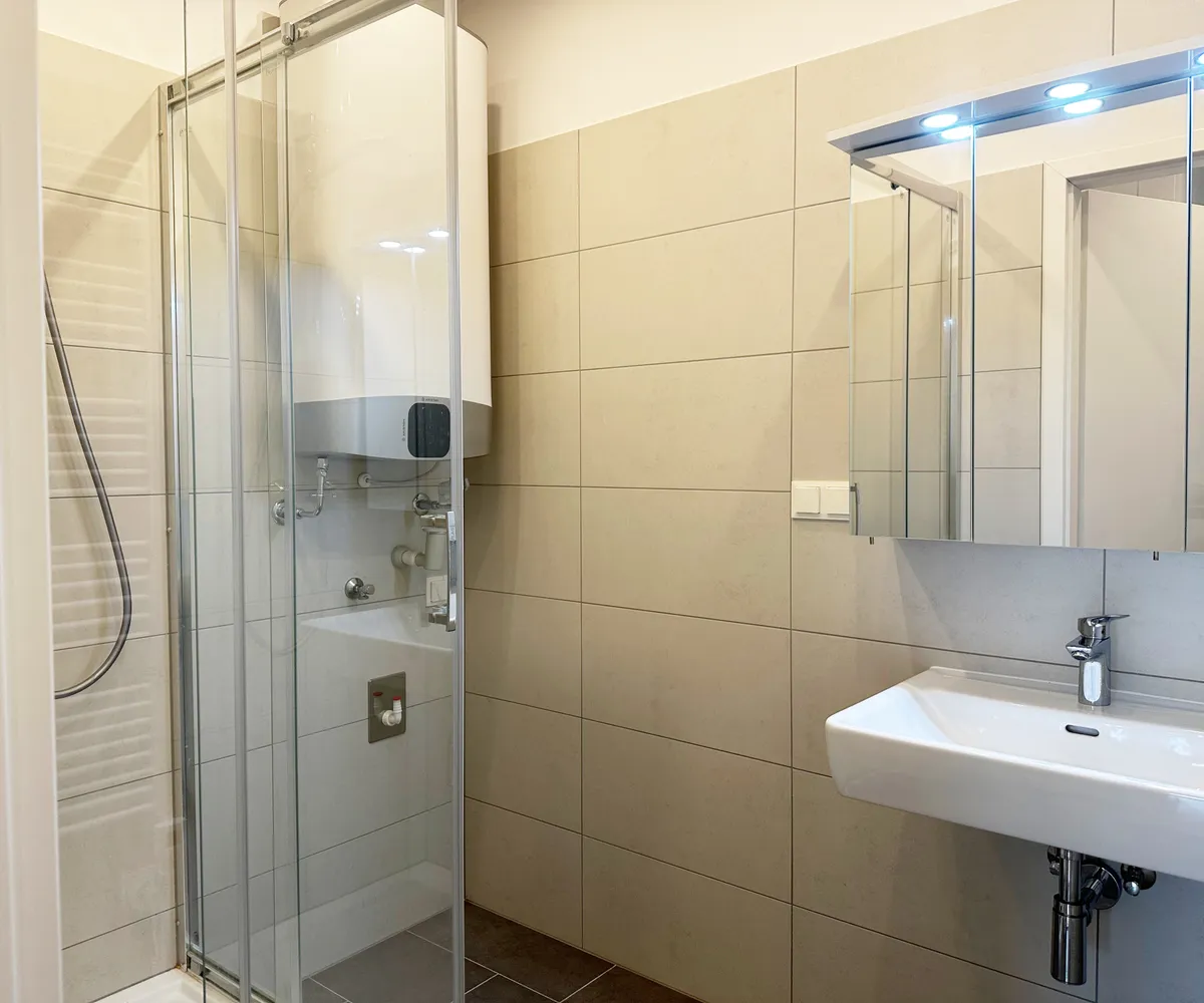 Das Badezimmer ist mit einer Dusche, einem Handtuchheizkörper sowie einem Waschmaschinenanschluss ausgestattet. Für wohlige Wärme sorgen Infrarot-Hybrid-Heizkörper sowie ein Warmwasserspeicher.