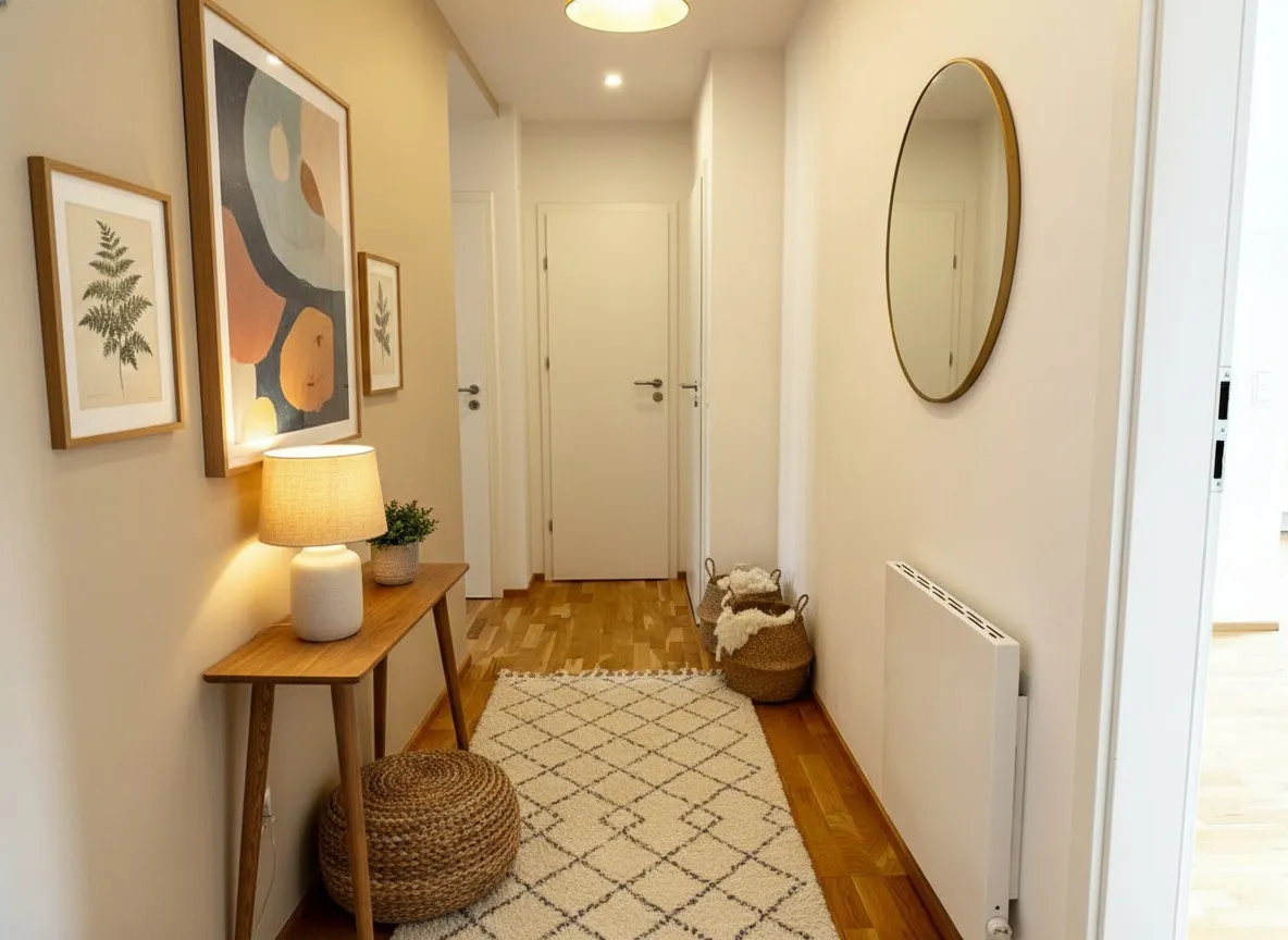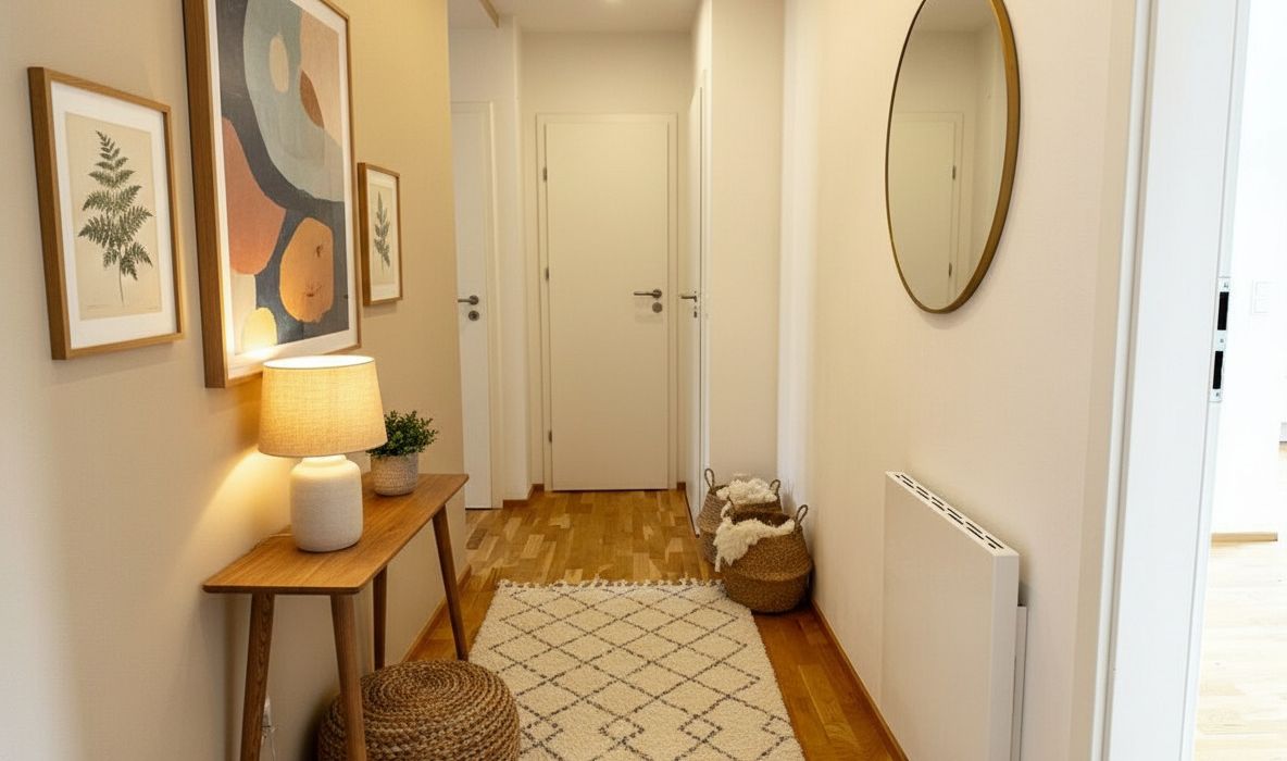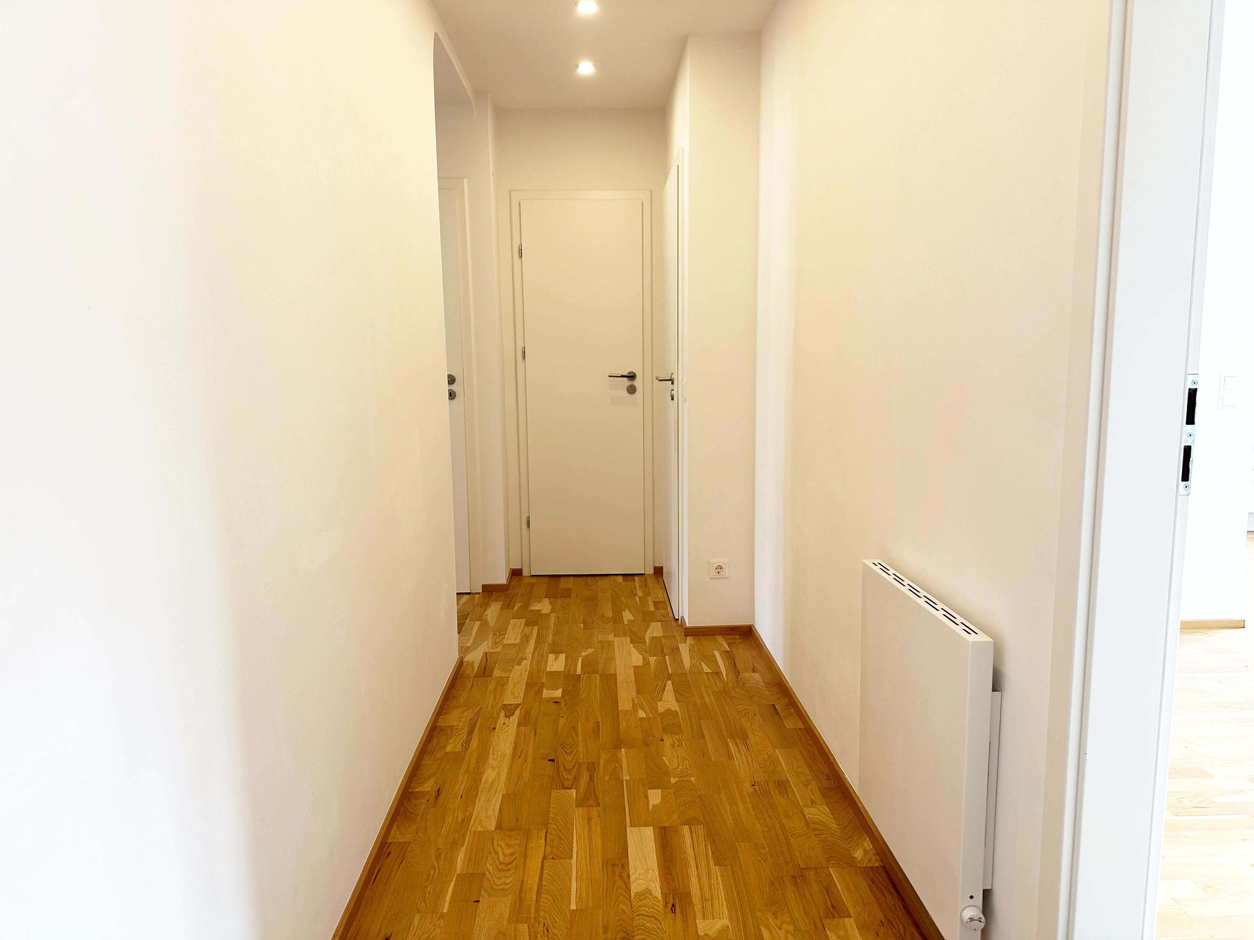 Hochwertiger Eicheparkettboden in den Wohnräumen sorgt für ein angenehmes Wohngefühl, während zeitlose Fliesen in den Nassbereichen für Funktionalität und Stil stehen.