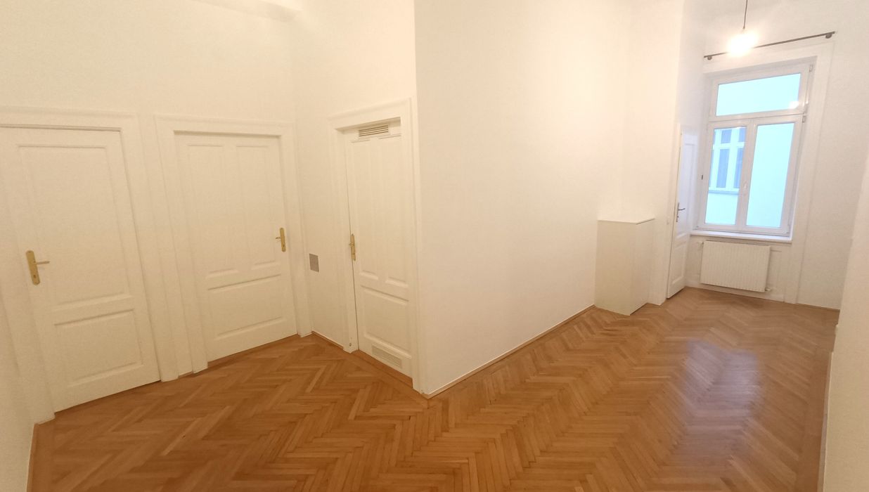 Auf einer Wohnfläche von insgesamt rund 135,79 m² erwartet Sie viel Platz für die persönliche Einrichtung und Gestaltung. Parkett im Fischgrätmuster , sowie eine Raumhöhe von ca. 3,60 Meter beeindrucken bereits beim Betreten der Wohnung.