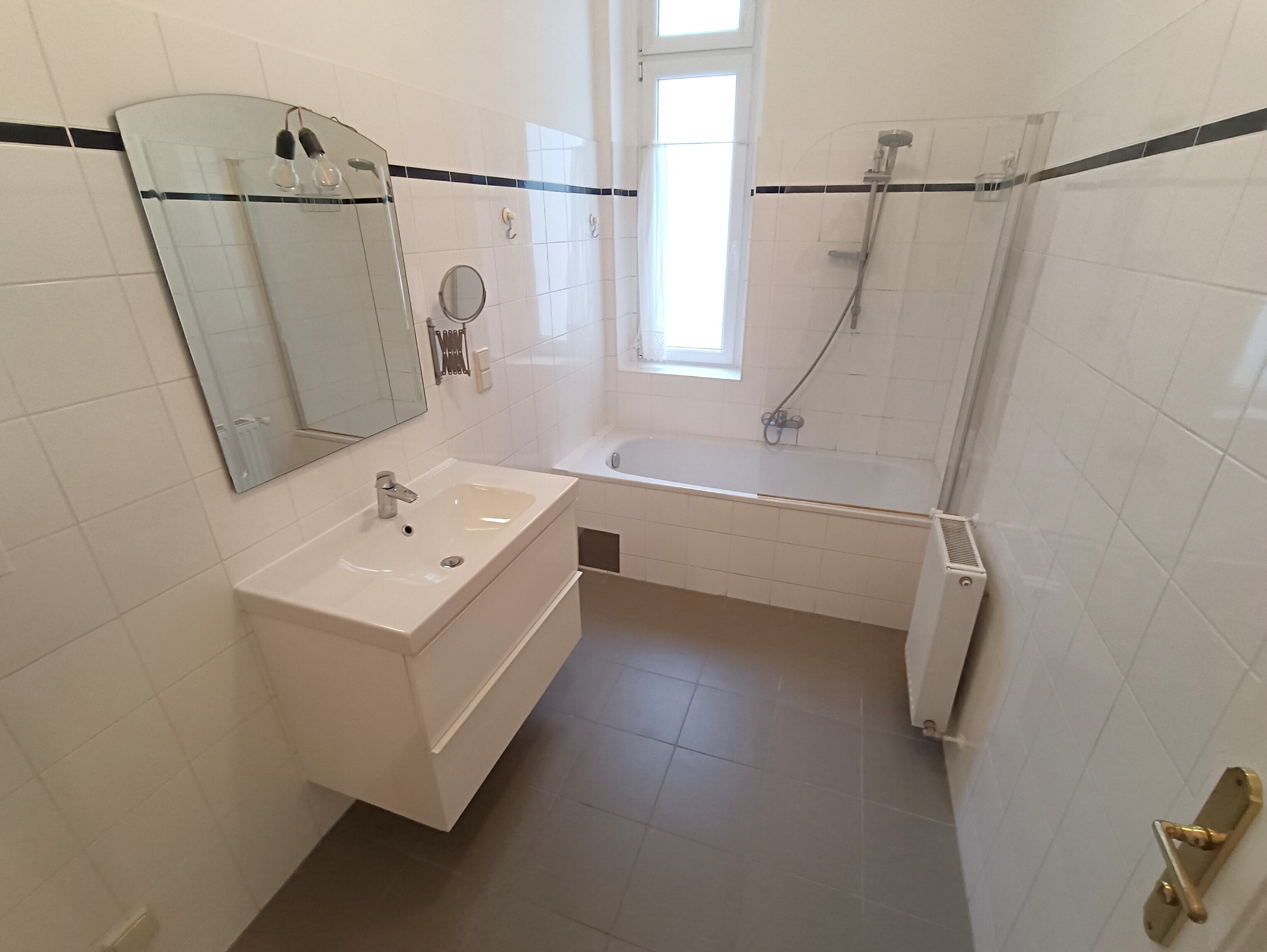 - Badezimmer mit Badewanne und Waschmaschinen-Anschluss