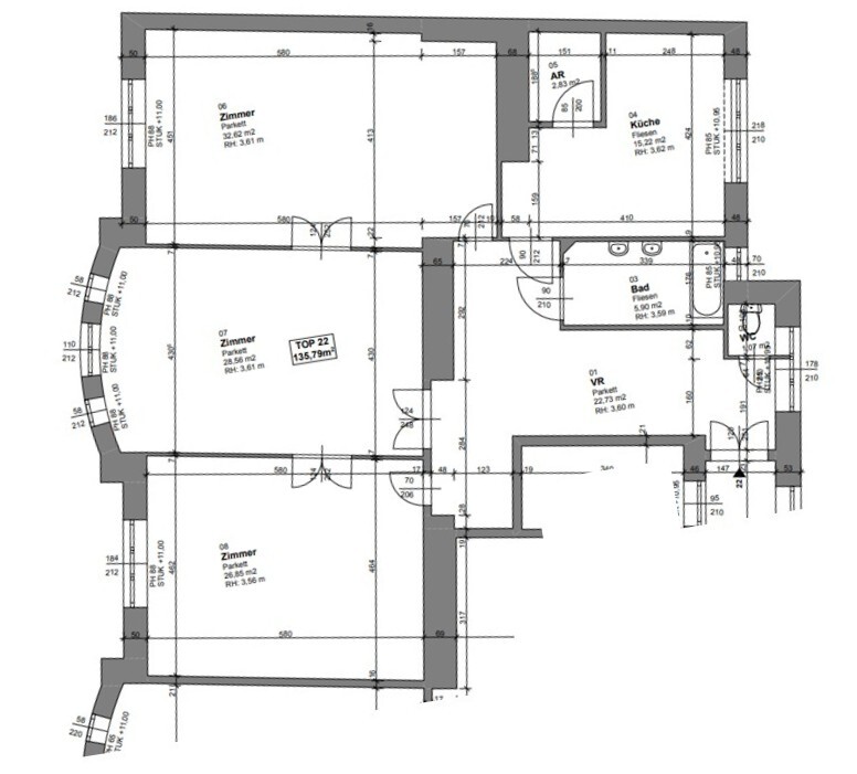 FAST FACTS WOHNUNG | ALTBAU | MIETE | 1040 | 2. Stock mit Lift | Wohnfläche rund 135,79 m² | 3 Zimmer (zentral begehbar) | Toilette separat | Badezimmer mit Badewanne | Küche mit Essbereich | WG geeignet | Nähe U1 Südtiroler Platz |